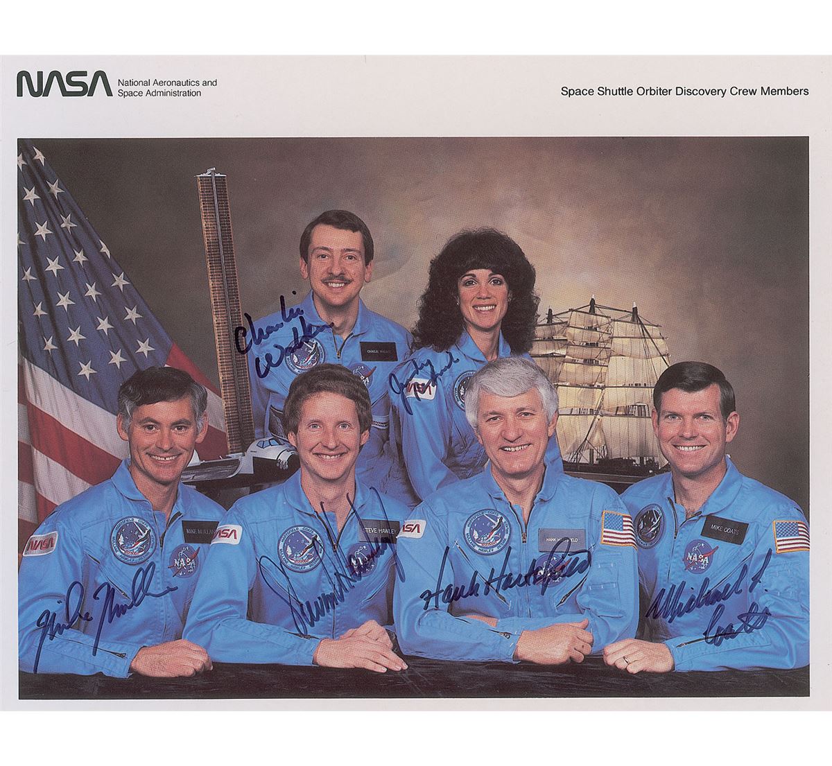 Official color 10 x 8 NASA lithograph of the STS-41-D crew, signed in black felt tip by Judy Resnik, Hank Hartsfield, Michael Coats, Mike Mullane, Charlie Walker, and Steven Hawley. In fine condition.