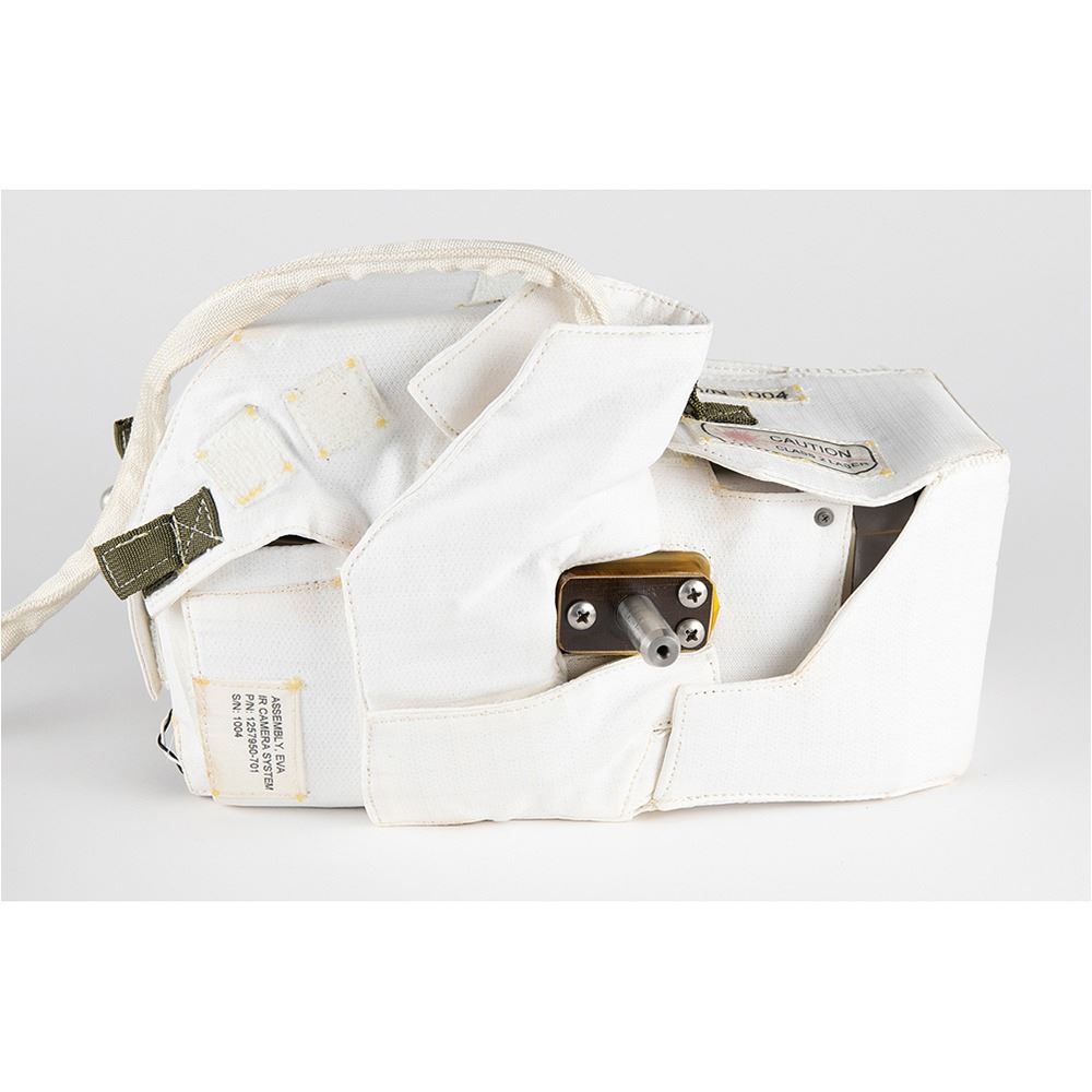Desirable flight qualification test article of the Space Shuttle's Extra Vehicular Activities Infra Red (EVA IR) Camera, identical to those that would be flown. The camera is housed in its white insulated thermal blanket, with sewn-on identification patch: "Assembly, EVA IR Camera, System, P/N: 1257950-701, S/N: 1004." The thermal blanket is secured to the camera by various Velcro flaps, and bears several patches including the NASA 'meatball' logo, EVA IR Camera patch, and Class 2 Laser caution patch. The camera's remote control unit is attached by its cable, and protected by a similar thermal blanket, with sewn-on patch: "Assembly, RCU, P/N: 1257977-701, S/N: 1004." Accompanied by the camera's black suitcase-style transport case and photocopies of a document outlining the qualification thermal vacuum test procedure that the camera was subjected to at NASA's Langley Research Center.