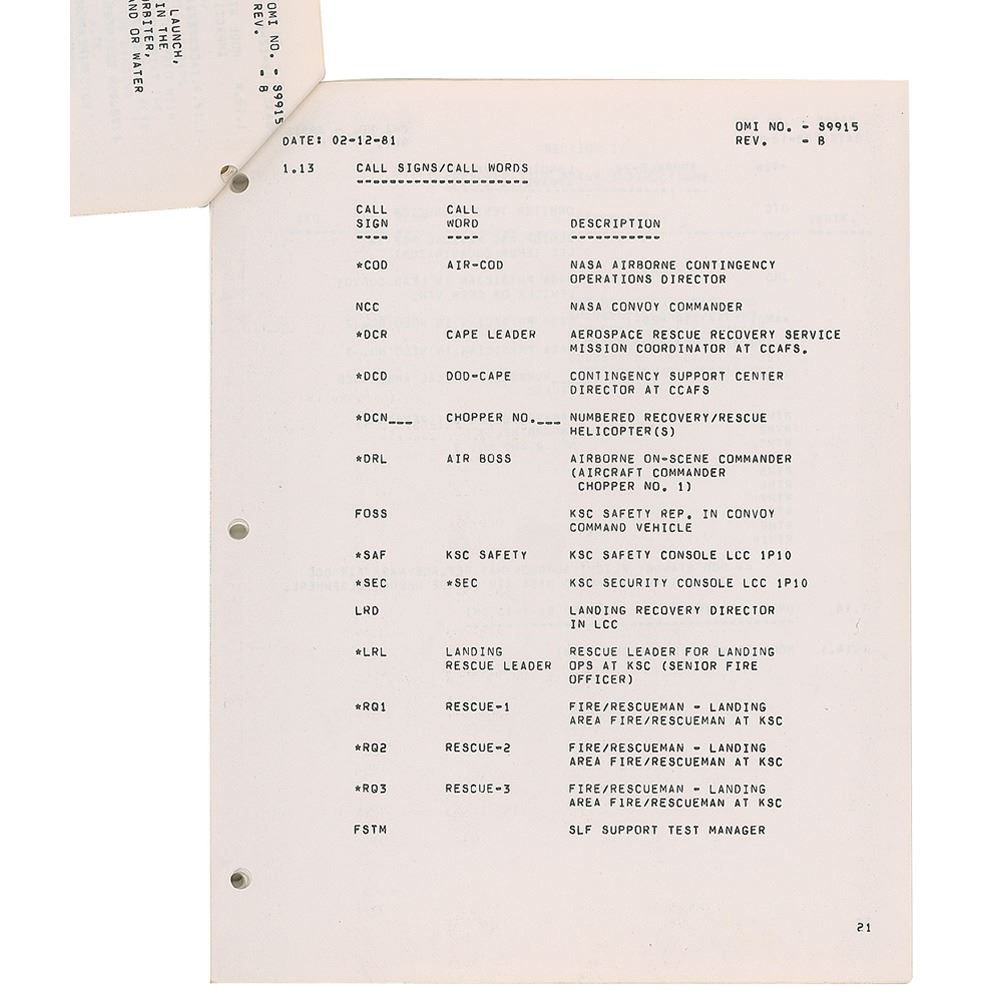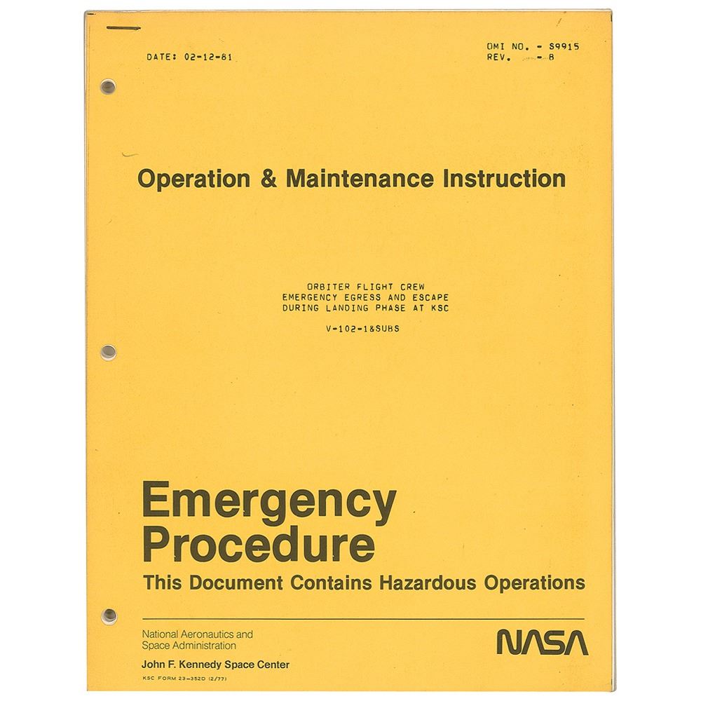 Staple-bound Space Shuttle "Emergency Procedure" manual entitled "Operation & Maintenance Instruction, Orbiter Flight Crew, Emergency Egress and Escape During Landing Phase at KSC," prepared by NASA and dated February 12, 1981, with opening summary sheet classifying the action as "Hazardous" with objective reading: "To provide the STS Test Director with procedures to assure the safest and most rapid rescue of the Flight Crew and supporting personnel in the event of an emergency/contingency condition during Orbiter landing phase at KSC." Sections include: Information, Pre-Operation Setup Instructions, Operation Support Setup Instructions, Operation Instructions, and Post Operation Instructions. In fine condition.