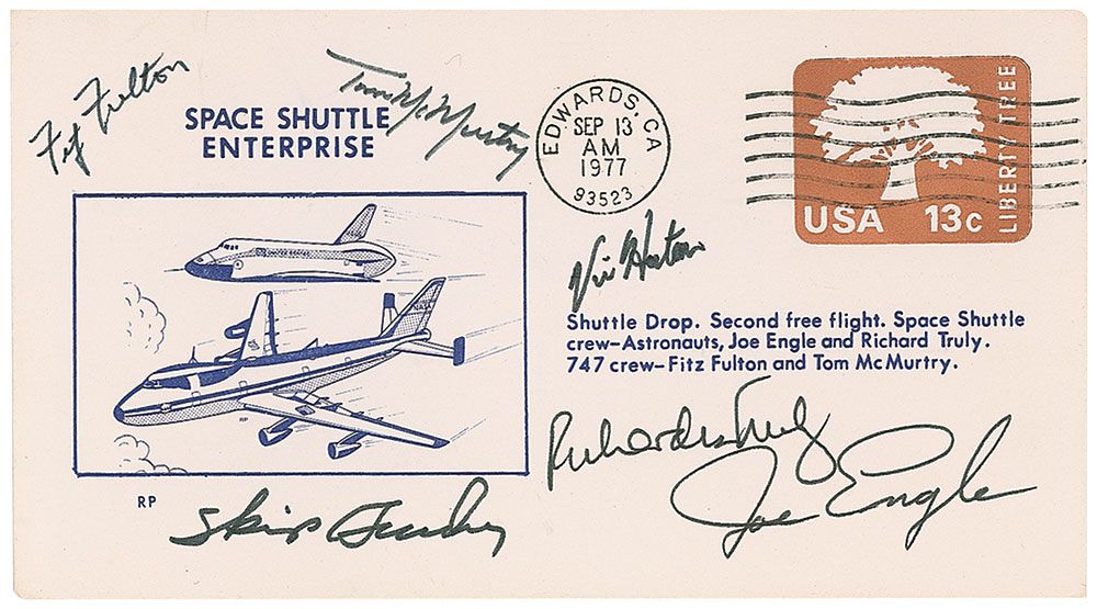 Commemorative cover with a cachet honoring the second free flight of the Enterprise, signed in black ink and felt tip by Joe Engle and Richard Truly, as well as the 747 Shuttle Carrier pilots Fitz Fulton, Tom McMurtry, Vic Horton, and Skip Guidry. In fine condition.