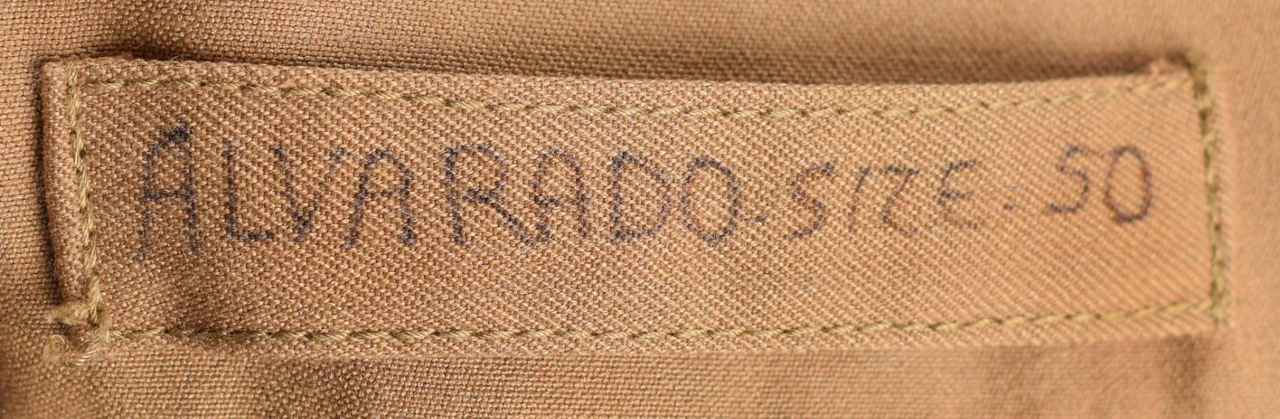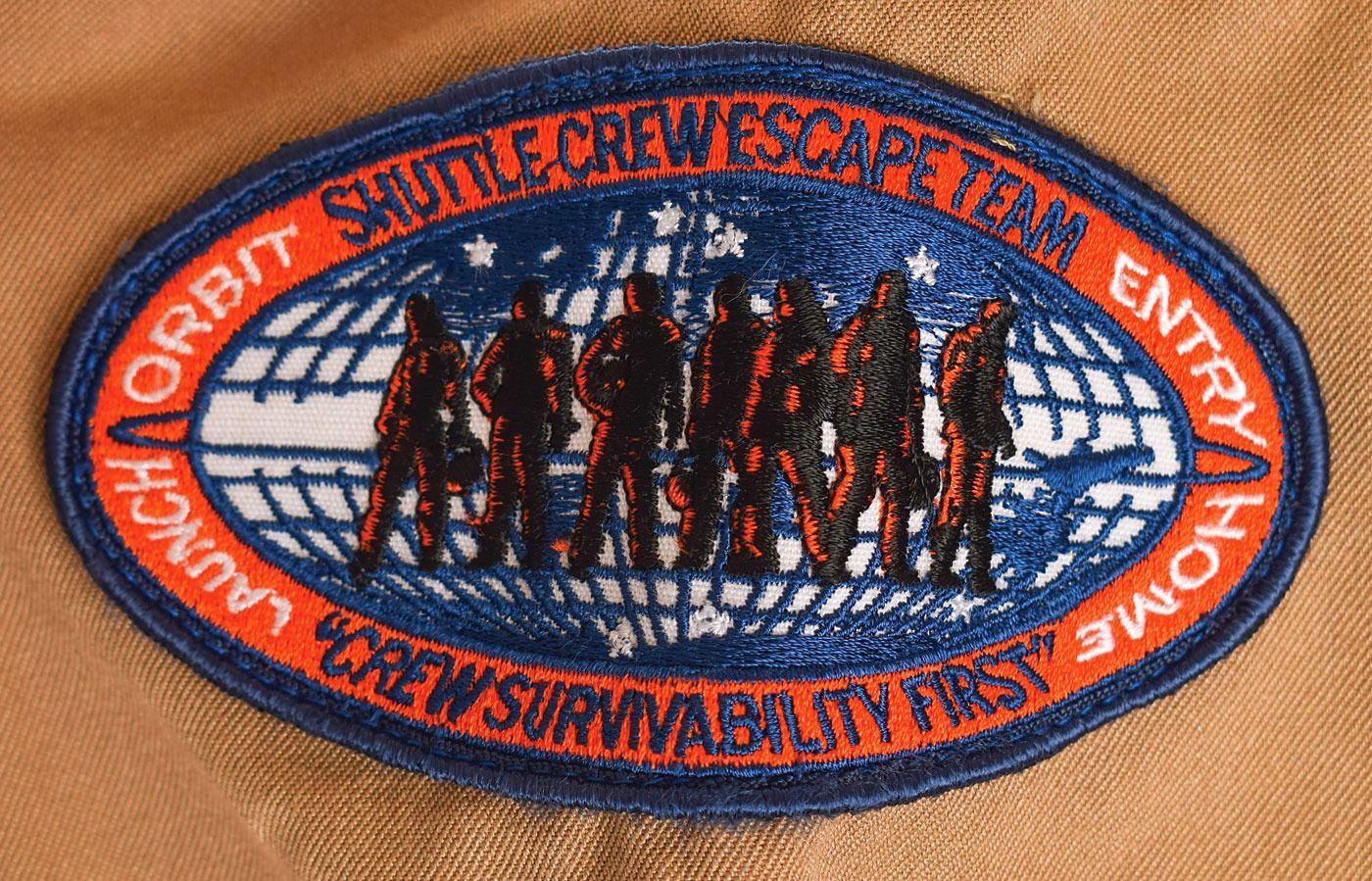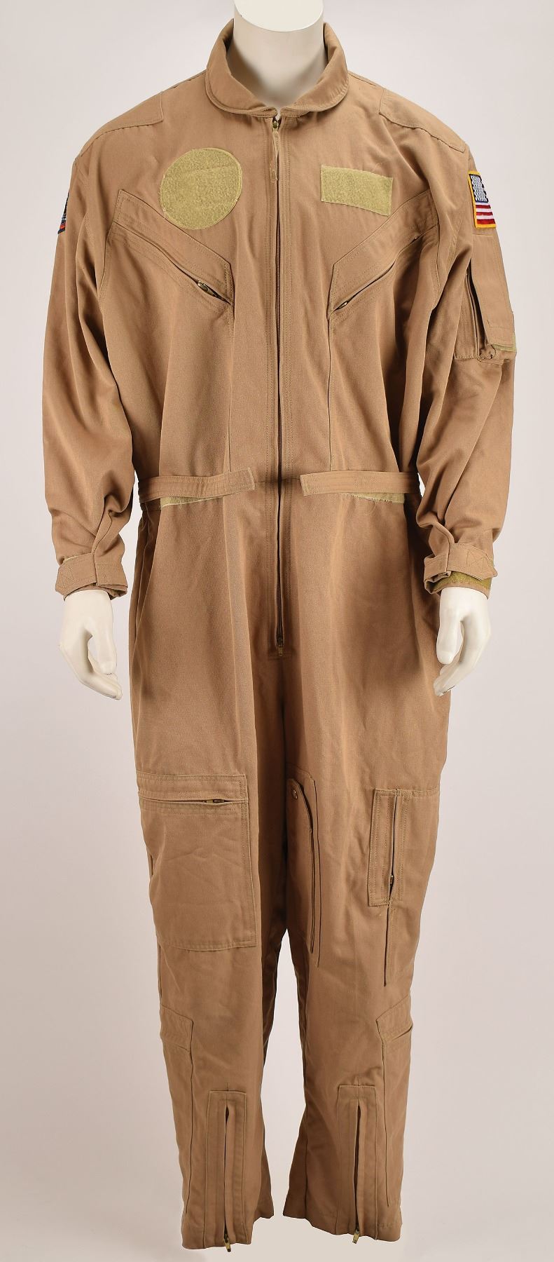 Light brown coverall suit for a member of the Space Shuttle Crew Escape Team, size 50, featuring an American flag patch on the left shoulder, and a "Shuttle Crew Escape Team, 'Crew Survivability First'" patch on the right shoulder. On the back are multiple large strips of Velcro, and the front also features two areas of Velcro. In fine condition.