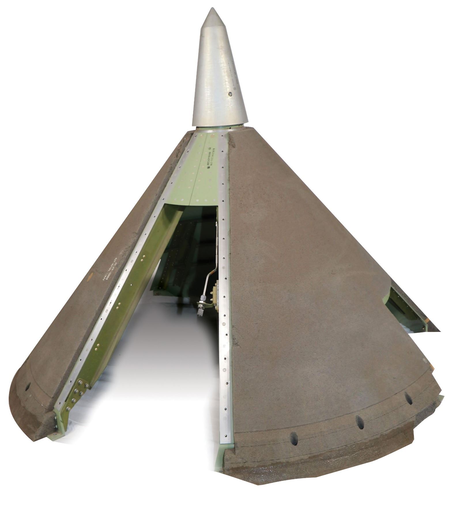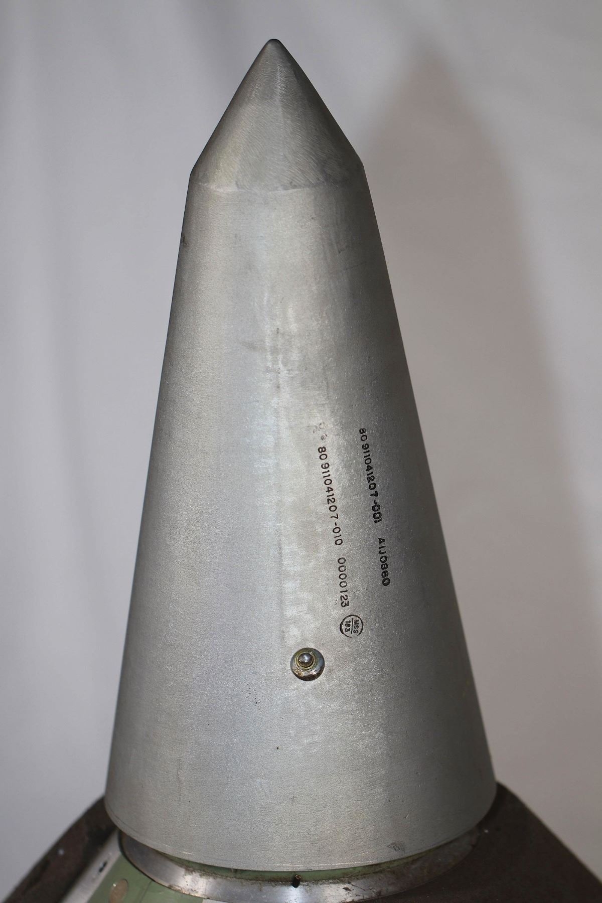 Space Shuttle External Tank (ET) Nose Cone Assembly complete with aerospike. The assembly represented the leading edge of the Space Shuttle/ET/Solid Rocket Booster (SRB) assembly from launch to orbit and provided a means for reducing aerodynamic drag during ascent. While on the launch pad, the Nose Cone was covered by a Vent Hood (referred to informally as the ‘Beanie Cap’). The hood, which recovered gaseous oxygen vented through ducting routed from the External Tank via the nose cone was one of the last items retracted from the flight vehicle prior to Shuttle launch.