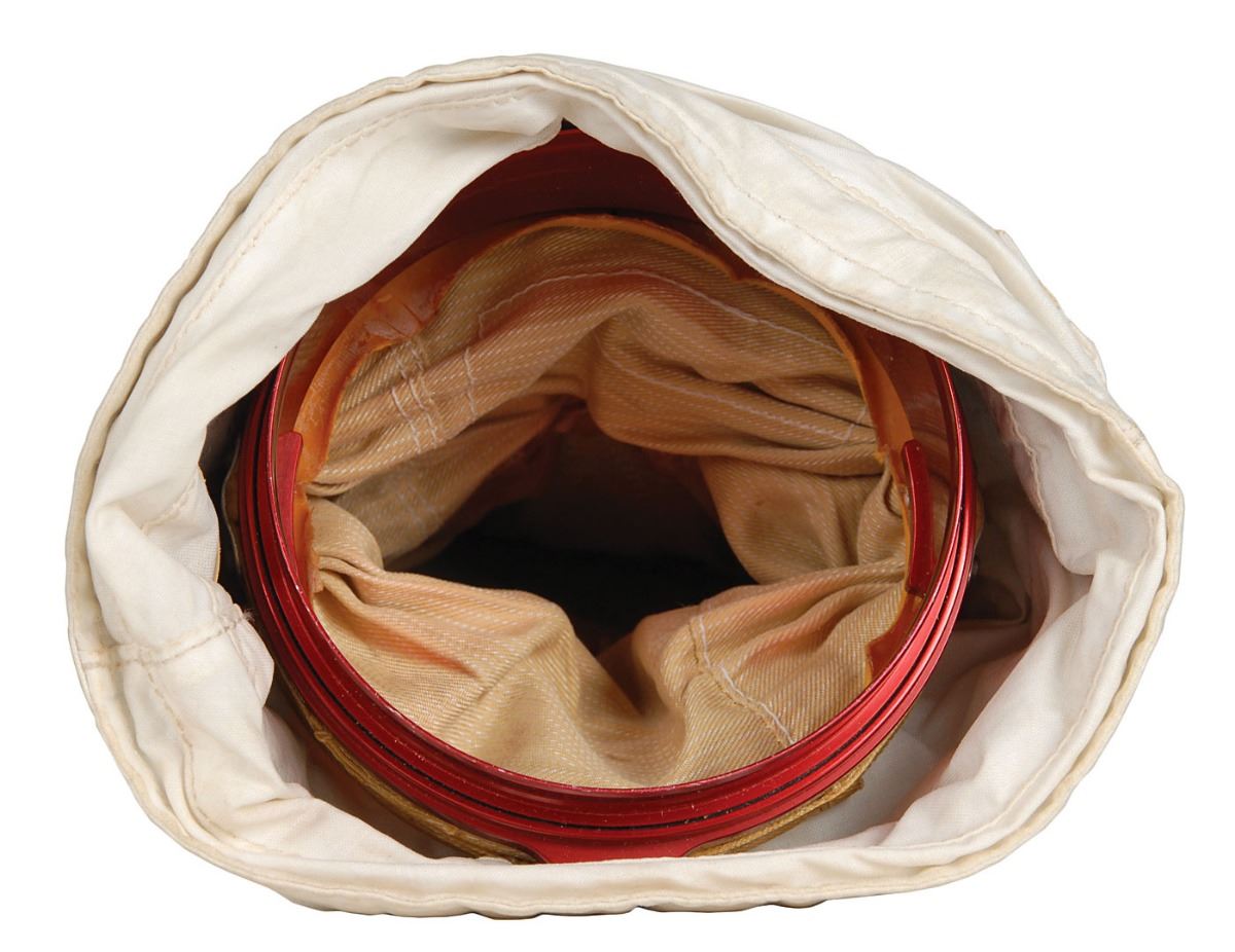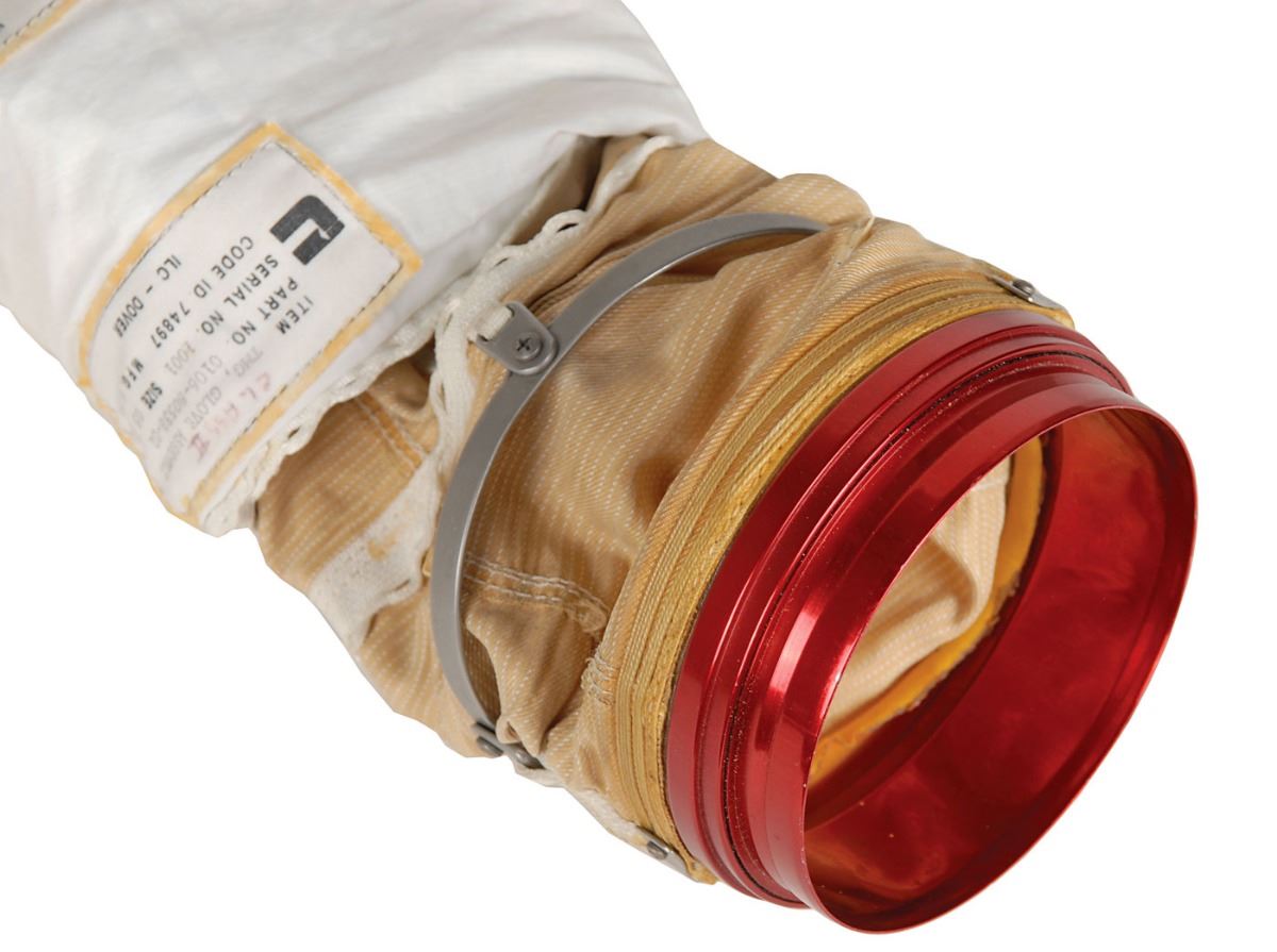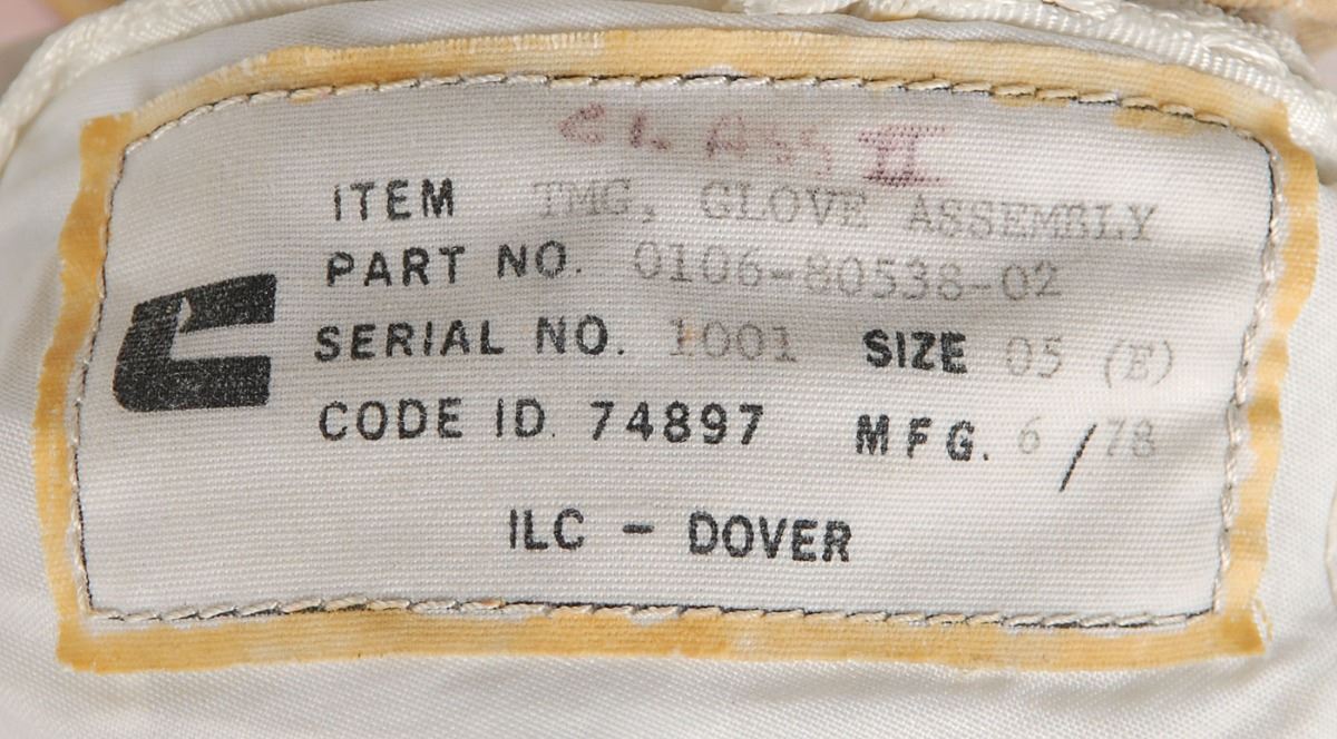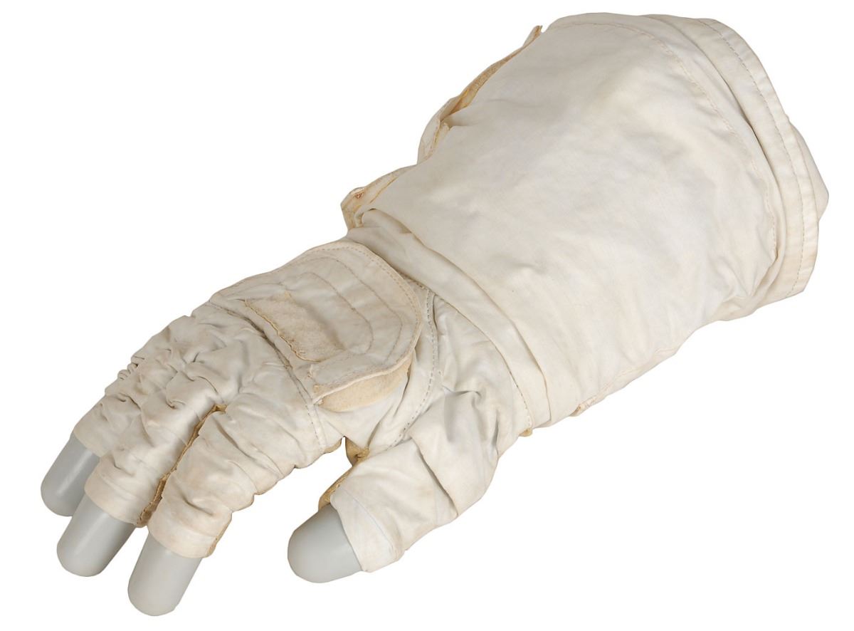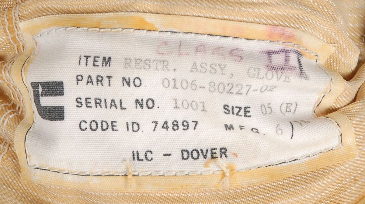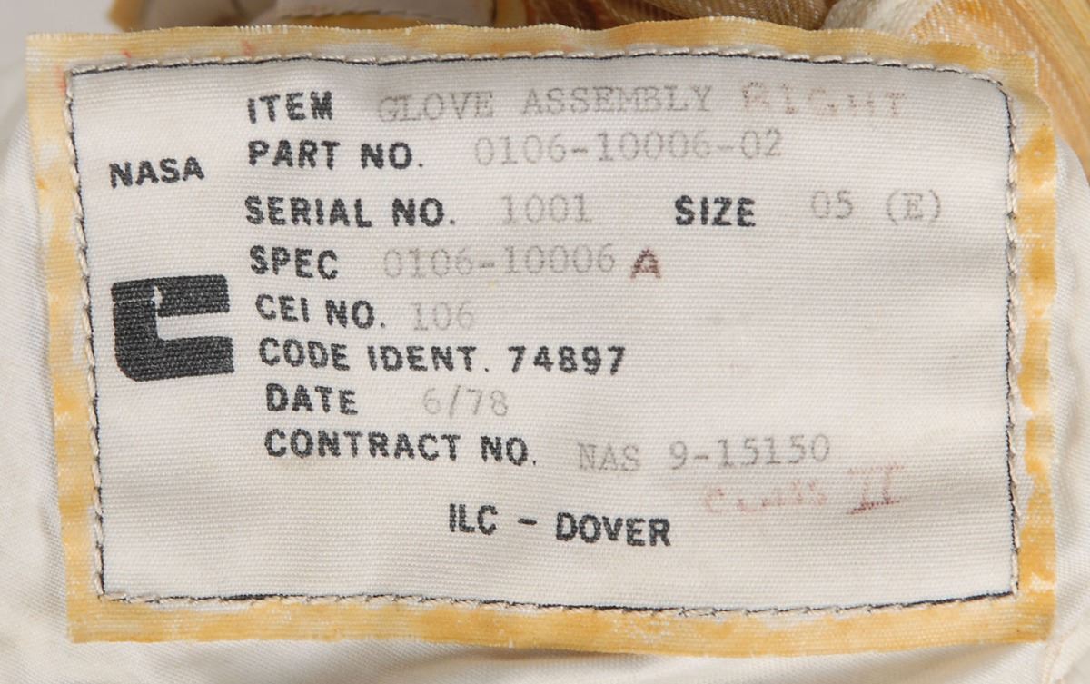 Extremely rare Space Shuttle extravehicular activity development glove made by International Latex Corporation, including the hardware and TMG cover layer. This is a rare example of an early development glove made out of Kevlar, thought at the time to be the best materials to use for the next generation space suit. Separate tags inside note the outer layer as “Item: Glove Assembly (Right), Part No. 0106-10006-02” and the inner part as “Item: Restr. Assy, Glove, Part No. 0106-80227-02.” In very good to fine condition. This glove has been authenticated by Bill Ayrey, company historian at ILC Dover, the manufacturer of the Apollo, Shuttle, and Space Station suits. An exceptional piece of early Shuttle memorabilia.