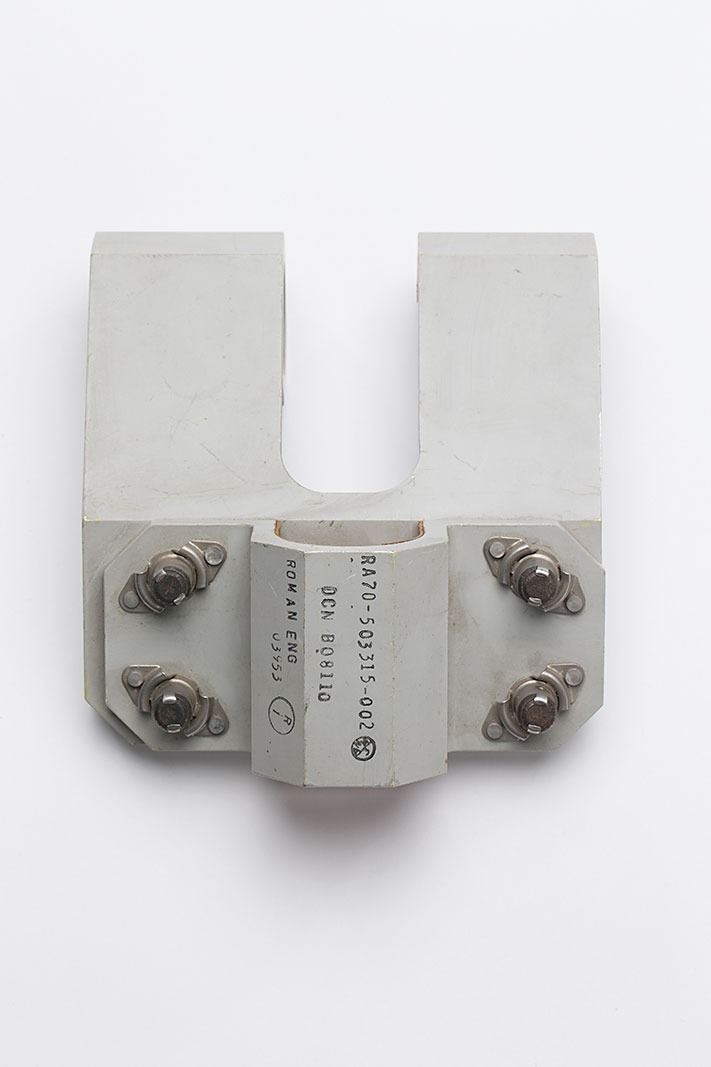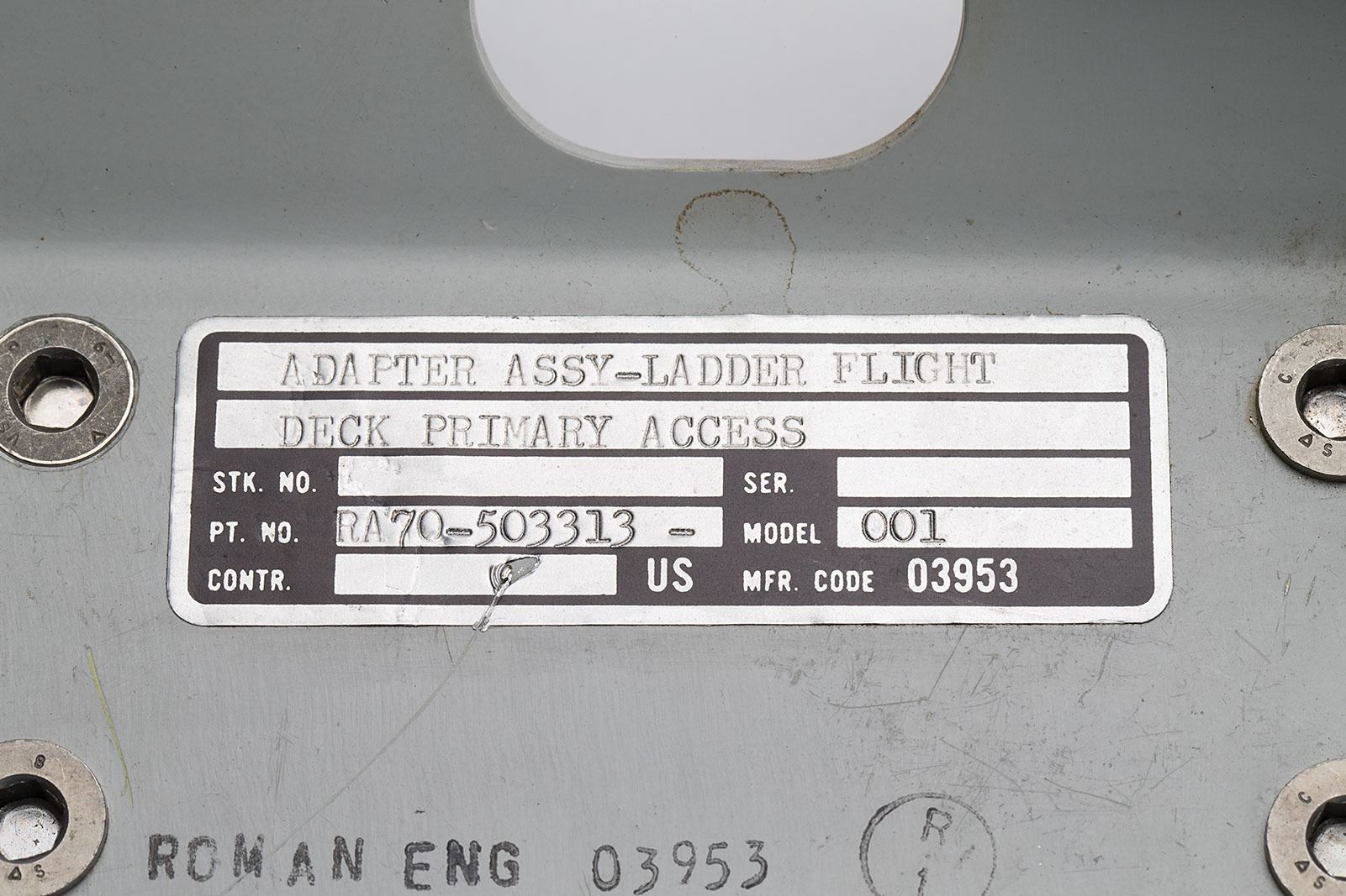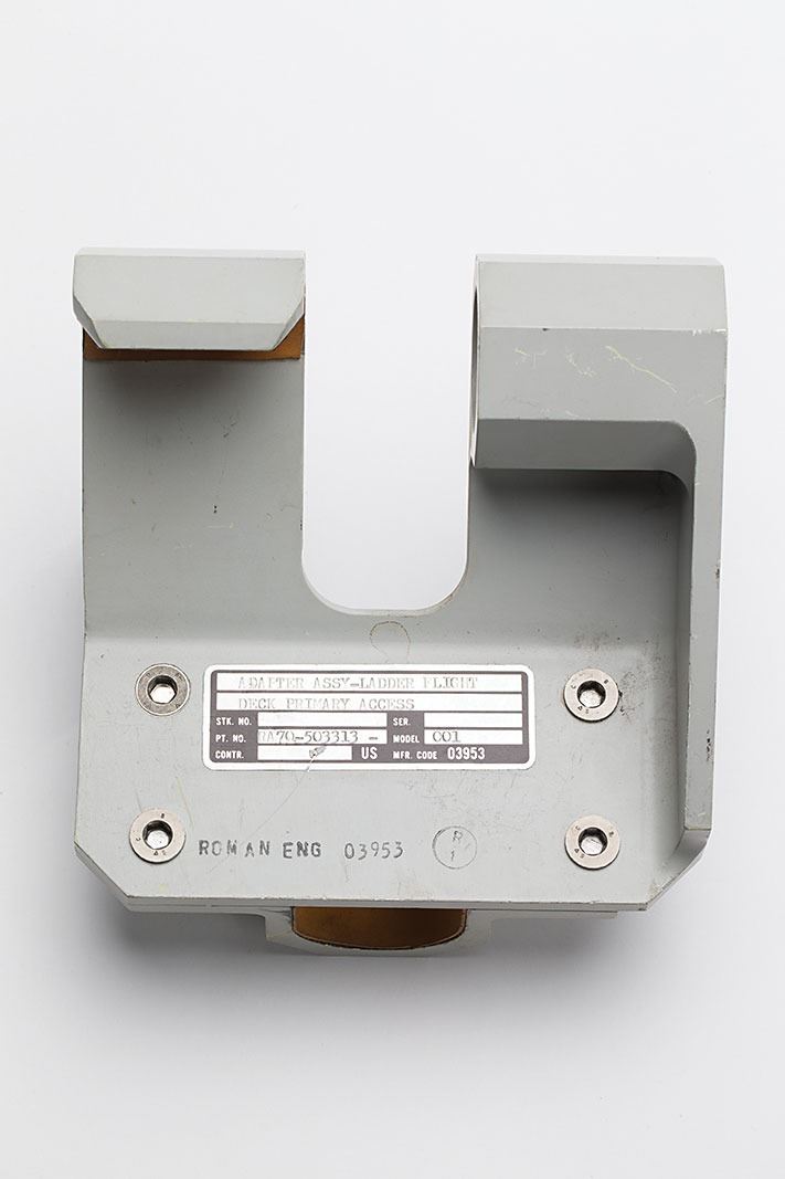 Engineering prototype of a Space Shuttle Flight Deck Ladder Adapter Assembly, measuring 5.25? x 4.75? x 5.5?, with a tag on one side, reading: "Adapter Assy—Ladder Flight Deck Primary Access, Pt. No. RA70-503313, Model 001," marked below, "Roman Eng 03953." In fine condition.