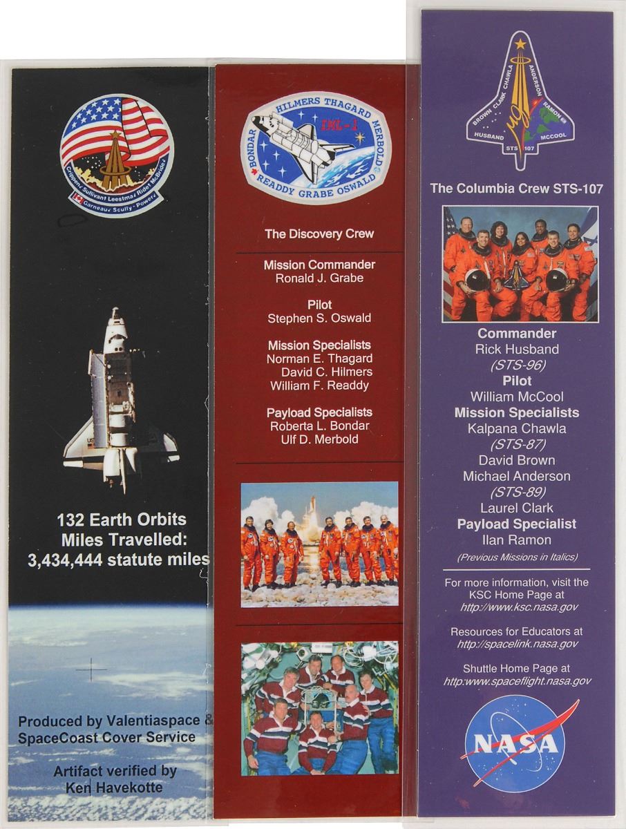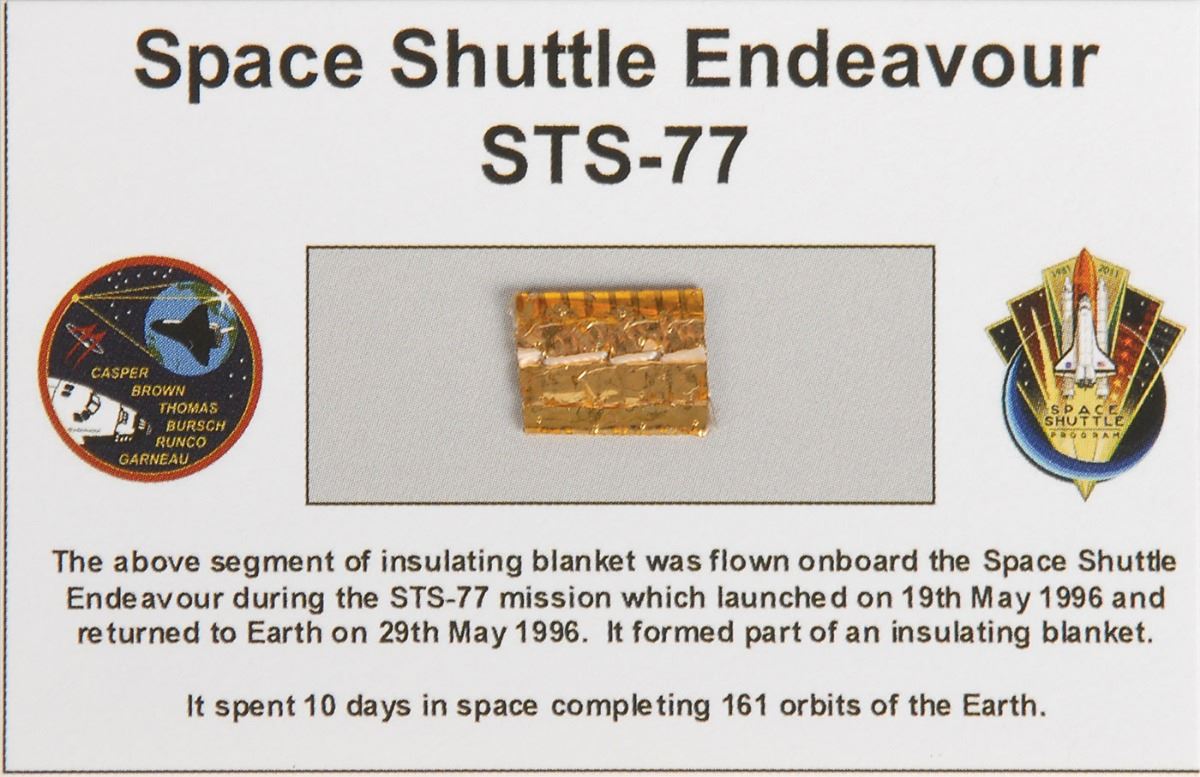 Collection of flown Space Shuttle relic presentations, ranging in size from 3.25 x 2 to 8.5 x 11, including: a presentation containing solar shield from Columbia flown on STS-87, AFRSI blanket from Challenger flown on STS-41G, payload bay liner from Discovery flown on STS-85, thermal blanket from Atlantis flown on STS-86, and insulating blanket from Endeavour flown on STS-77; a segment of Horse Collar Blanket from Space Shuttle Discovery flown on STS-42; a sample of Advanced Flexible Reusable Surface Insulation from Space Shuttle Challenger flown on STS-41G; a segment of insulation blanket foil from Space Shuttle Endeavour flown on STS-77; a segment of wadding from Space Shuttle Columbia flown on STS-90; a segment of payload bay liner from Space Shuttle Discovery flown on STS-82; a segment of payload bay liner from Space Shuttle Atlantis flown on STS-71; and a segment of payload bay liner flown on an unknown mission. In overall fine condition. From the collection of aerospace memorabilia specialist Ken Havekotte.