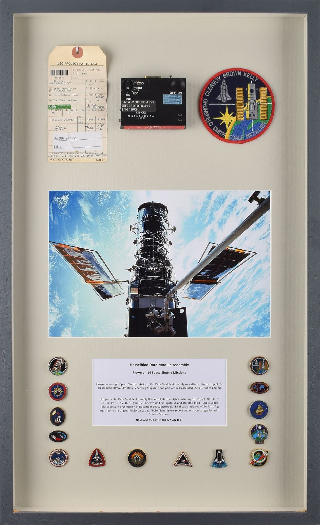Flown Hasselblad DE-32 Data Module which was attached to the top of the Hasselblad 70mm film Data Recording Magazine as part of the Hasselblad 553 ELS Space Camera, carried on 14 Space Shuttle missions, measuring 3.5? x 2.75? x .75?, labeled: "Data Module Assy., SEF33101018-322, S/N 1093." Beautifully mounted inside a 16.75 x 27.5 shadowbox along with the JSC parts removal tag, a photo of the Hubble Space Telescope, an STS-103 mission patch, and pins from each mission it flew on. Also includes a NASA tracking manifest specific to this piece, logging all the missions it flew on and its return to Hasselblad for refurbishment. In fine condition.