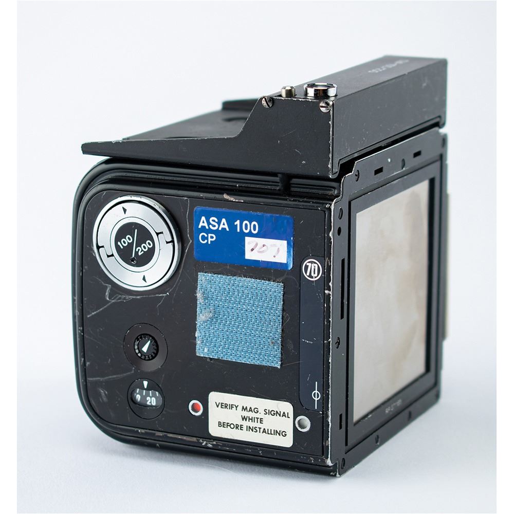 Space Shuttle flown Hasselblad 70mm film Data Recording Magazine as part of the Hasselblad 553 ELS Space Camera, measuring 3.75˝ x 4.25˝ x 3.5˝, with left side labeled: "HRC Film Magazine, P/N SEF33101018-304, S/N 1081, JSC No. 555077.” The front and right side are labeled as “ASA 100, CP 707, the top marked as “DM-100/200,” and the lower back marked “RP 371165.” Four sides bear affixed swatches of male hook Velcro. In fine condition. Hasselblad cameras and equipment were staples of astronaut work from the early 1960s through to the transition to digital photography in the early 2000s. The high-quality equipment and images were valued for their ease of use for multiple purposes.