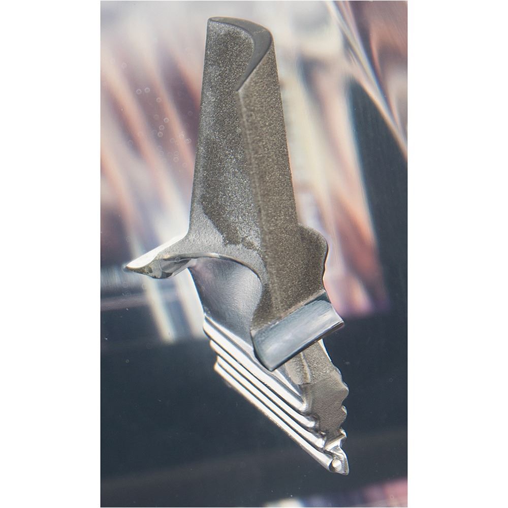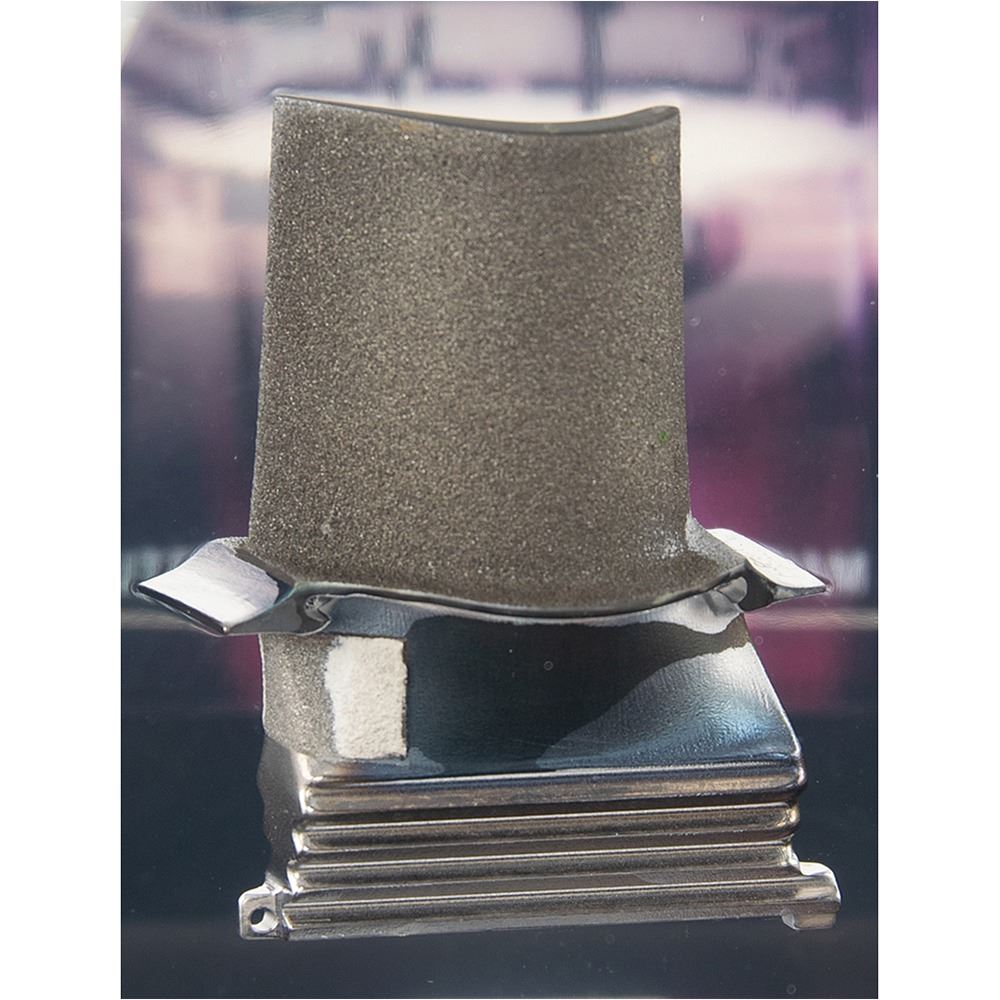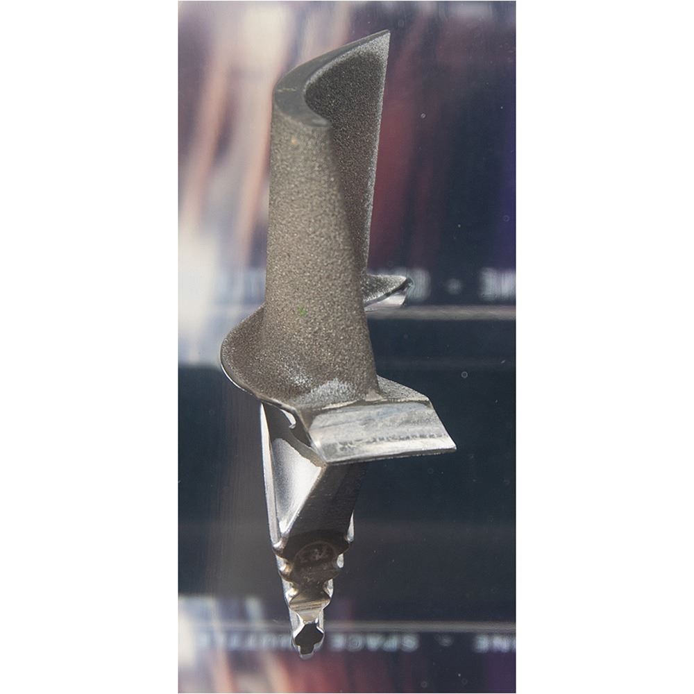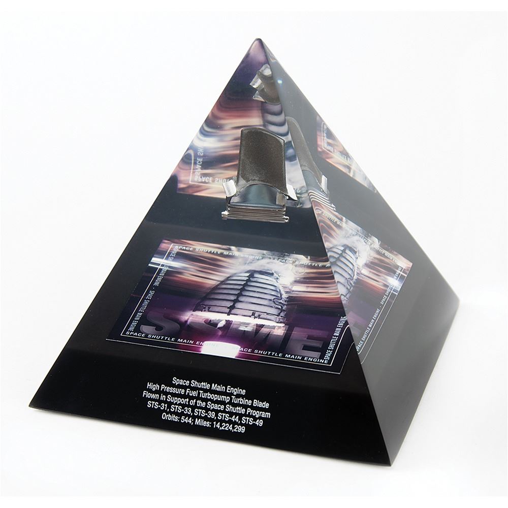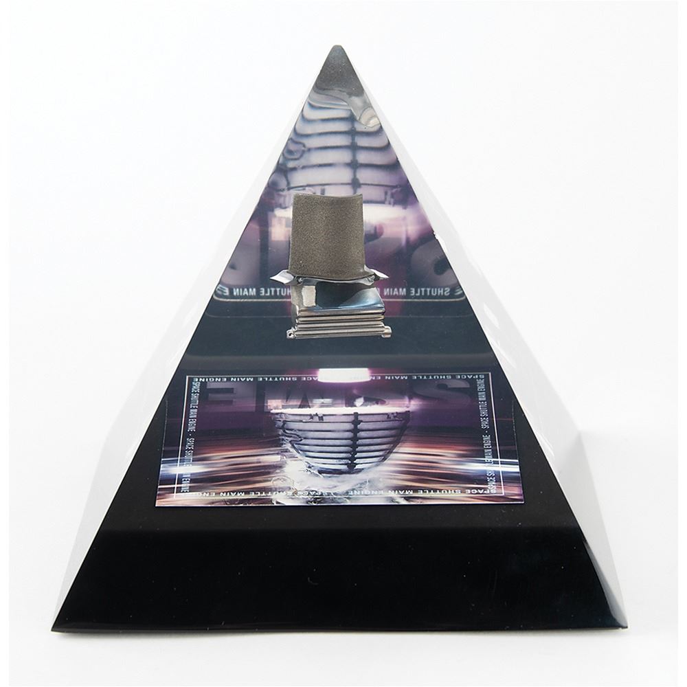 Desirable flown turbine blade from the Space Shuttle Main Engine (SSME) High Pressure Fuel Turbopump (HPFTP), measuring approximately 1.5" x .75" x .5", carried flown on five missions: STS-31, STS-33, STS-39, STS-44, and STS-49. Impressively displayed in an acrylic pyramid, measuring approximately 6.5" x 6.5" x 6.5", with an image of the SSME in the base and flight details etched on the front. During these missions, the blade made a total of 544 orbits and traveled over 14 million miles. The SSME HPFTP blade is designed to withstand operational temperature extremes from -260Ëš F to 1,500Ëš F.
