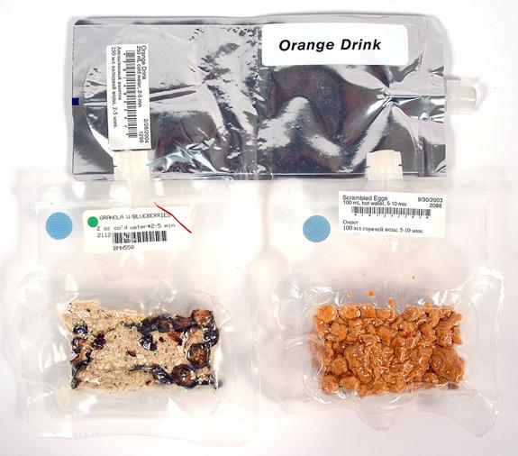 Space Shuttle "Food". Lot of three different unused "Space Food" packages including "Scrambled Eggs", "Granola with Blueberries" and "Orange Drink". The Eggs and the Drink both Russian/English bilingual bar code labels. The Granola bar code label is just in English. A nice lot that needs a bit of help to be what one would call appetizing today.