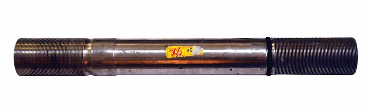 Extremely heavy unexpended Space Shuttle GSE booster tie-down bolt, 31.5 x 3.5 x 3.5, with external grooves at each end. One end features a 1? smooth fitting, and the other a .5? tapped hole with internal threads, reading below, “10183–0003–002, S/N 1000158, Lot 2050–22.” The ends and body bear red spray paint; at booster ignition, eight of these bolts were explosively separated allowing liftoff of the Shuttle. In very good to fine condition, with adhesive and label remnants to main body, and some damage to external grooves, including an apparent melt line, stripping, and denting. Oversized.