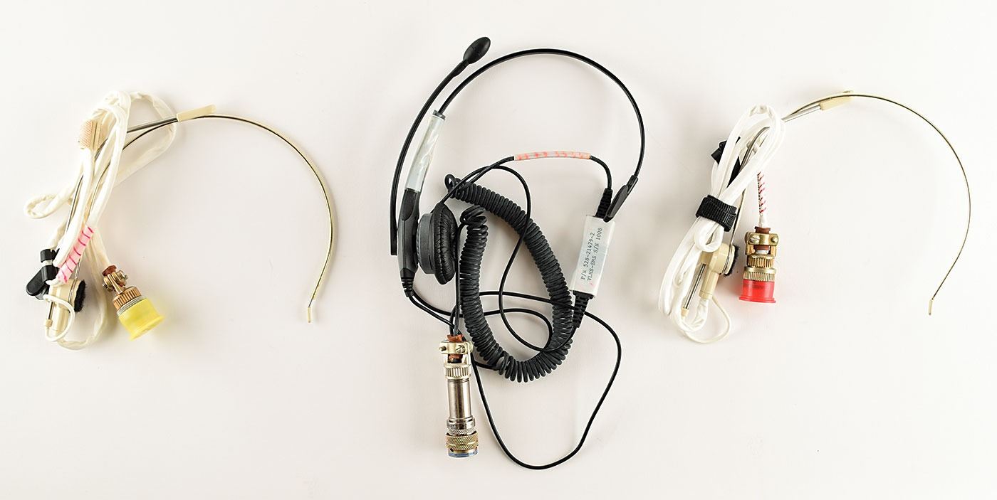 Group of three variants of the Very Lightweight Headset (VLHS) unit designed for use on the Space Shuttle and International Space Station, two featuring thin metal headbands (marked on the cables as part numbers "SED16101291-313" and "SED16101291-314"), and one with a black plastic headband (marked as "P/N 528-21479-2"). In overall very good to fine condition.