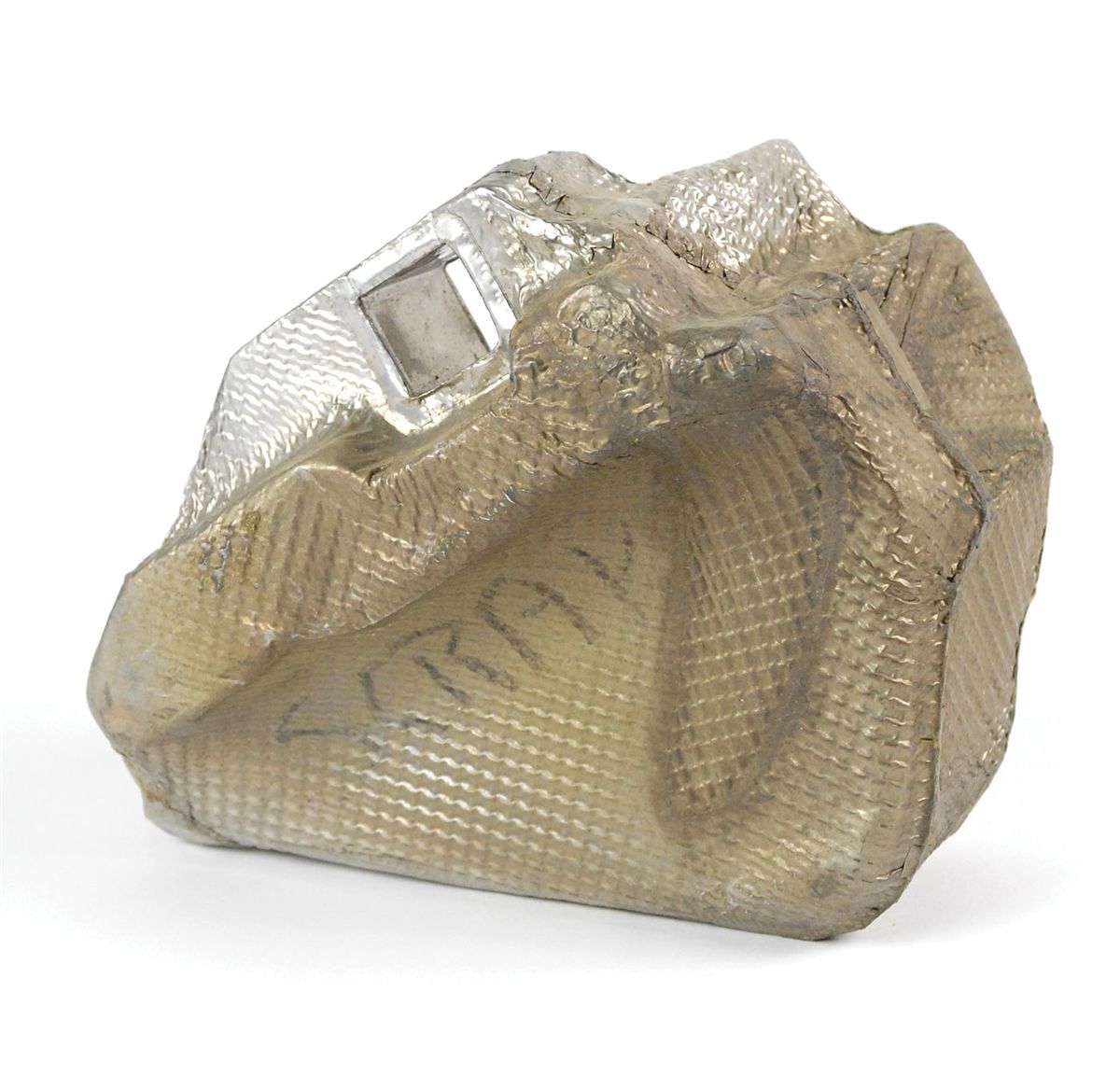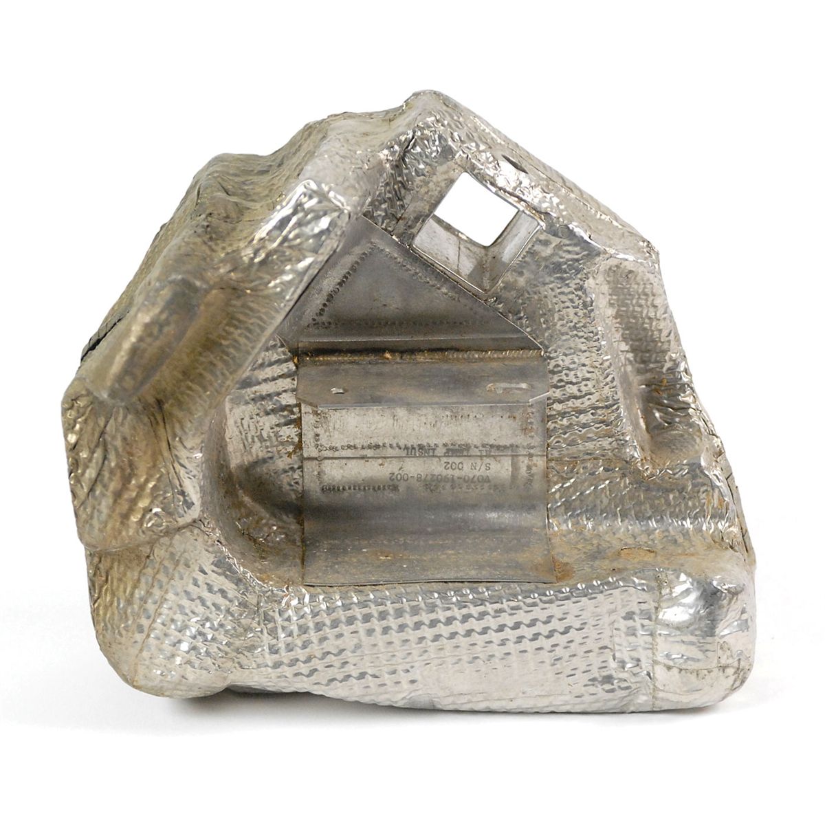 Available to US bidders only. An unusually shaped flown insulation assembly used in the wings of the Space Shuttle to protect the aluminum structure from the radiant heat of the Reinforced Carbon-Carbon leading edge of the wing during reentry. Measuring approximately 7.5 x 5 x 5, the part consists of an Inconel sheet encasing insulation material, with part number “VO70-190278-002 Serial Number 002,” stenciled on the brace. Upper portion is also labeled “Scrap,” in a technician’s hand. In fine condition. The low serial number suggests it is from an early flight in the program. Insulation originates from the Charles Bell Estate.