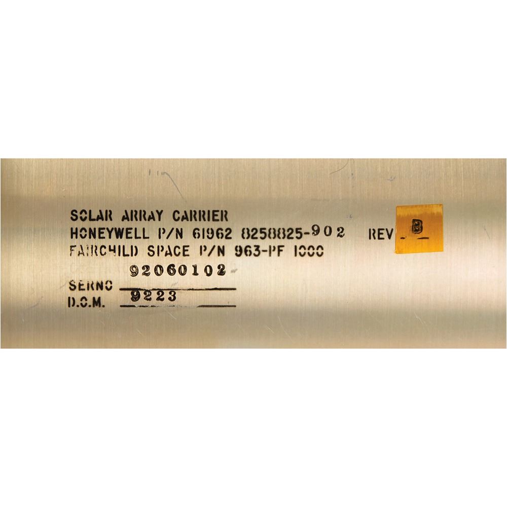 Solar array carrier isolator intended for application in the Space Shuttle Payload Bay as part of the cradle assembly that retained the Hubble Space Telescope's solar array from launch to orbital release; or for those solar arrays deinstalled from the ISS, for return from orbit through landing. The component measures approximately 29è long and 5.5è in diameter, and is marked on the side: "Solar Array Carrier, Honeywell P/N 61962 8258825-902 Rev. B, Fairchild Space P/N 963-PF 1000, Serno 92060102, D.O.M. 9223." Many of the screws have been sealed on with dots of adhesive, preparing the carrier for flight. Complete with its foil packaging.