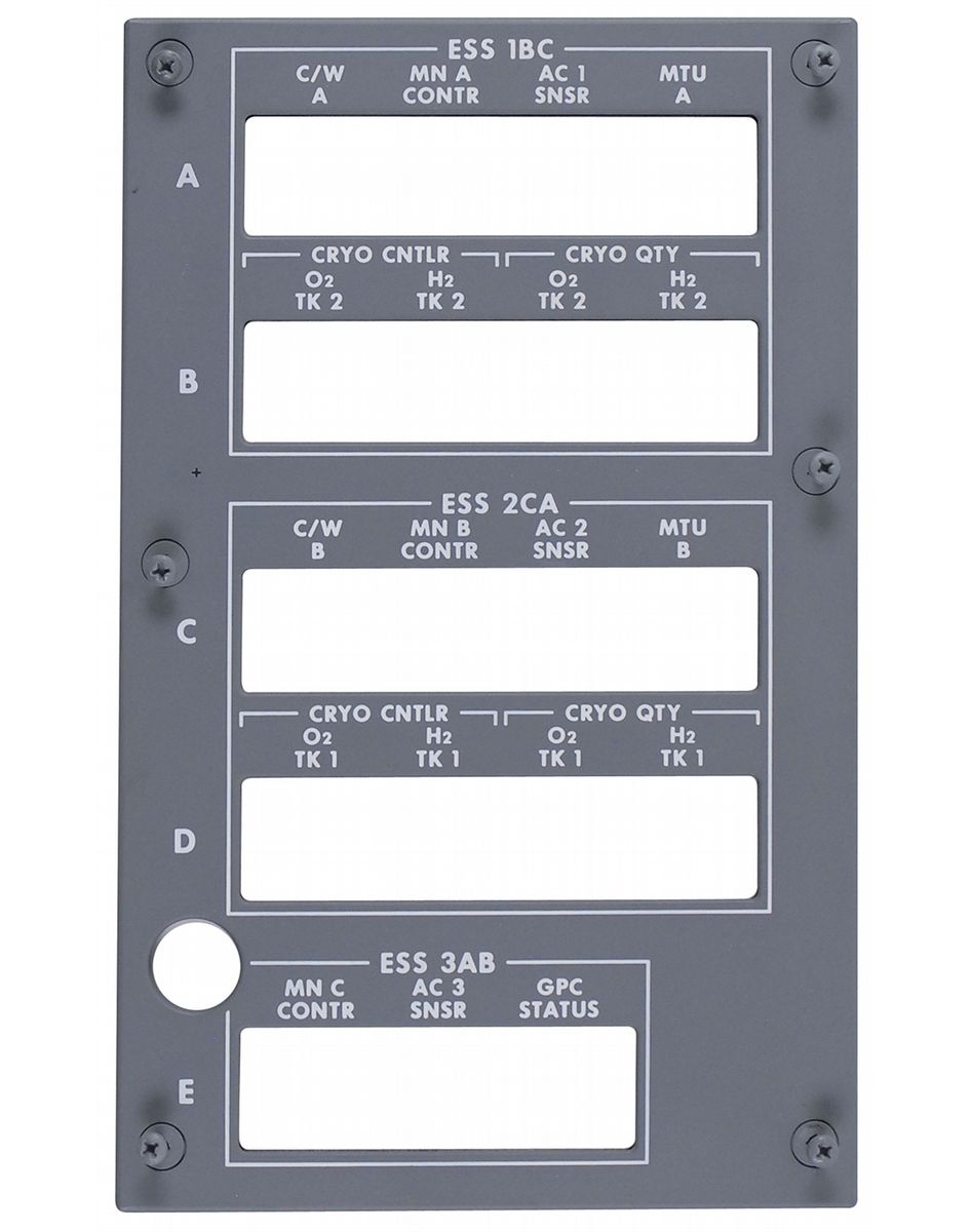 Space shuttle illuminating panel, measuring 10 x 6, with five rectangular openings for 19 circuit breaker push-pull knobs. This panel would be located at an overhead position behind the commander’s seat on the Space Shuttle flight deck. The panel has three ESS (Equipment Support Section) groups—1BC, 2CA, and 3AB, in A, B, C, D, and E rows, with actual circuit breaker wording in white which includes caution and warning, cryogenics systems and tanks, plus one titled, “GPC (General Purpose Computer) Status.” An ID stencilled on the reverse reads, “Panel Illuminated…Ser. No. 33523327164AA1C, Oct. 1977.” If the proper low voltage is supplied (5 volts max) via the correct power fitting, there is a good chance that this panel will indeed illuminate. Accompanied by six sheets from the Shuttle Flight Operations Manual (Vol. 13, Displays and Controls) describing full details of the panel in a column/row format and an illustration showing this panel and its relative location on the flight deck. An additional page shows the layered make-up of a Space Shuttle illuminated panel, being a metal base panel, lamps for back-lighting at equal spacing intervals, a plastic overlay, and the gray and white paint formats.