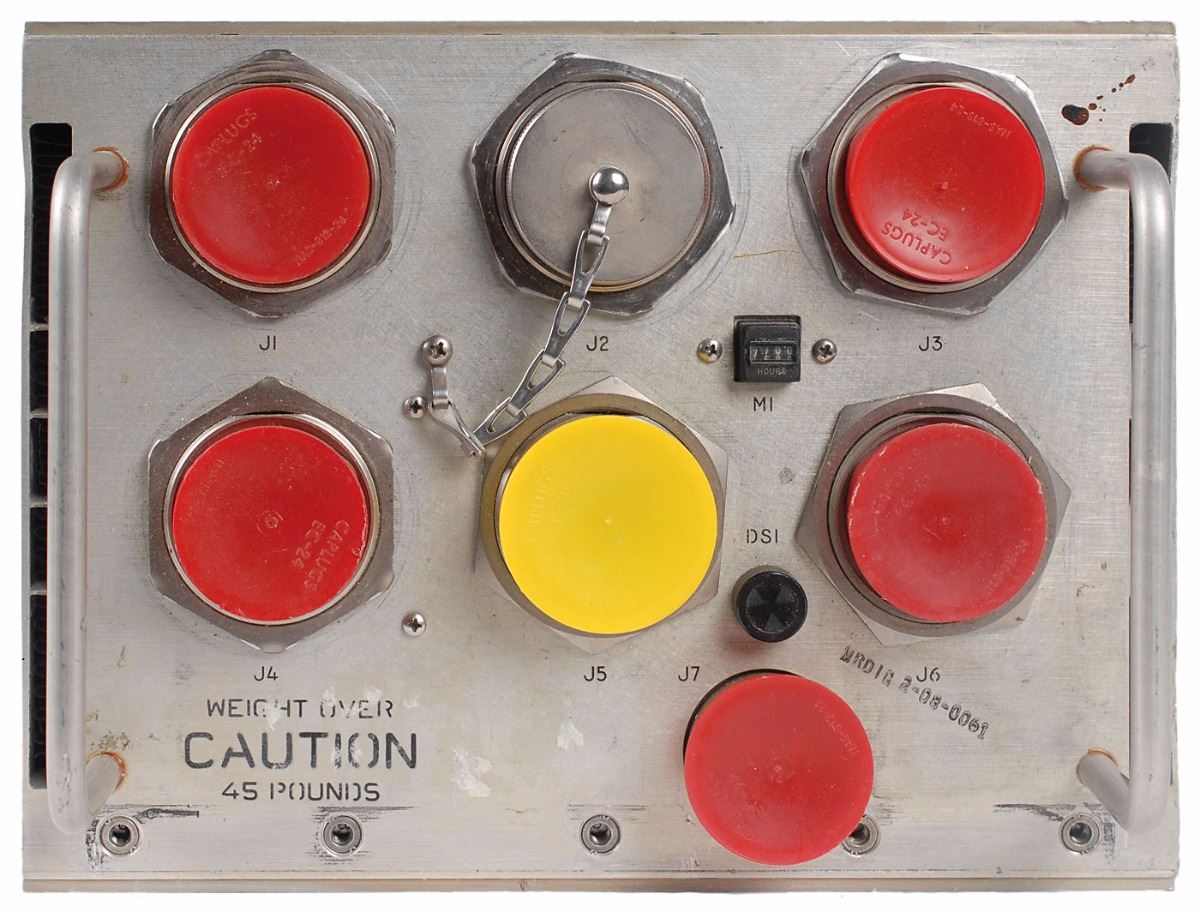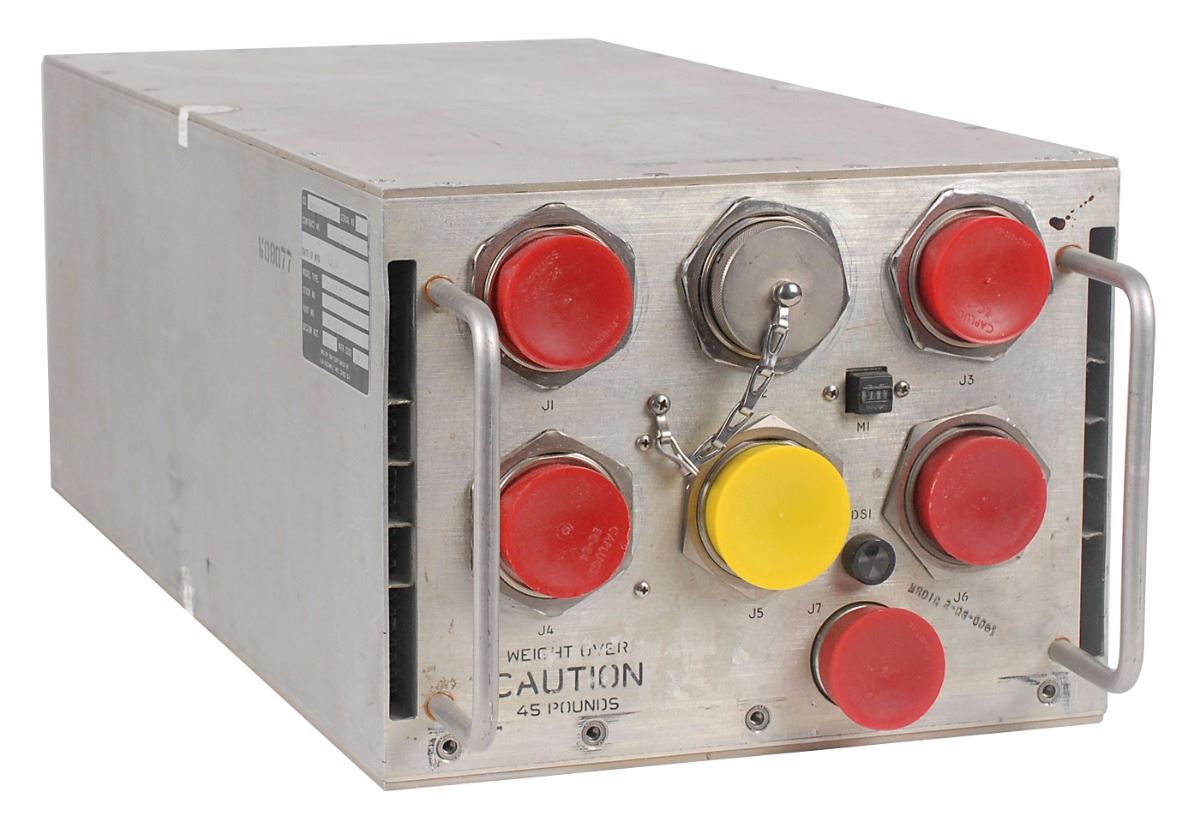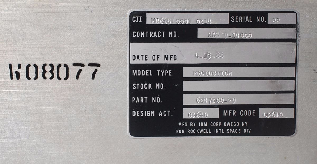 Space Shuttle Input/Output Processor (IOP) manufactured by IBM Corp for Rockwell International, 10 x 7.5 x 19.5, with a parts tag affixed to the left side reading, “CII MC615-0001-0314, Serial No. 22, Contract No. NAS 9-14000, Date of Mfg 4-15-88, Model Type Production, Part No. 6247300-29.” The front of the unit has seven ports labeled “J1” through “J7,” as well as a “DSI” knob and analog counter to record time in use. In fine condition, with various scuffs and dings. This input/output processor was one of five identical units used onboard Space Shuttle Columbia. When paired with a CPU, it comprised the core of the IBM AP-101B General Purpose Computer (GPC). Four of these operated in sync for redundancy, while an independent computer acted as a backup. The CPU controlled access to the memory of the General Purpose Computers and executed commands to vehicle systems, while the IOP formatted and transmitted commands to Space Shuttle systems, received and validated response data, and maintained the status of interfaces with the CPU and the other GPCs. Oversized. Documentation includes a copy of “Orbiter Avionics Data Processing System Component S/N – Location Matrix,” page 1-356, which has a spreadsheet-type format listing the STS flight numbers with their associated Central Processing Unit and Input-Output Processor serial numbers. An additional sheet, page 1-365, includes 16 different IOP serial numbers listed with their respective flights. A final sheet titled “GPC B Machines IOP” lists the part and serial numbers of seven flown IOP units (including this IOP) excessed by NASA in the early 1990’s after the Space Shuttle upgrade to new IBM AP-101S units. This sheet has multiple flight listings by each IOP starting as early as STS-1. This particular IOP unit is listed as flown on Columbia (OV 102) flights 3, 4, 61C, (all pre-Challenger/STS-51L accident) and post-Challenger flight STS 28. During the 1986 to 1988 NASA return to flight effort, an update to the AP-101B series was perform to flight units, which kept their original serial numbers but changed the date of manufacture to 1988. In 2003, Space Shuttle Columbia (STS 107) broke apart during re-entry with the loss of all seven crew members. Images of documentation available upon request.