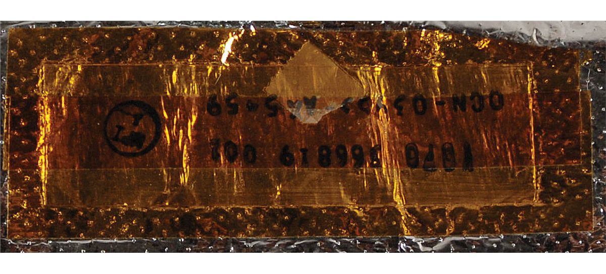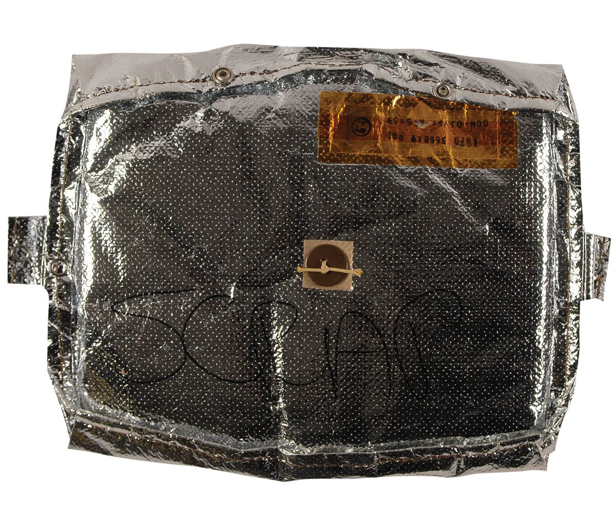 Available to US bidders only. Light weight silver finish insulation pad, measuring approximately 11.5 x 8 x 2 with four snaps, and restraint buttons on top and bottom. Pad is part number V070-366819-001, labeled “Scrap” on the top and bottom, and is most likely flown. In fine condition. Provenance: Charles Bell Estate.