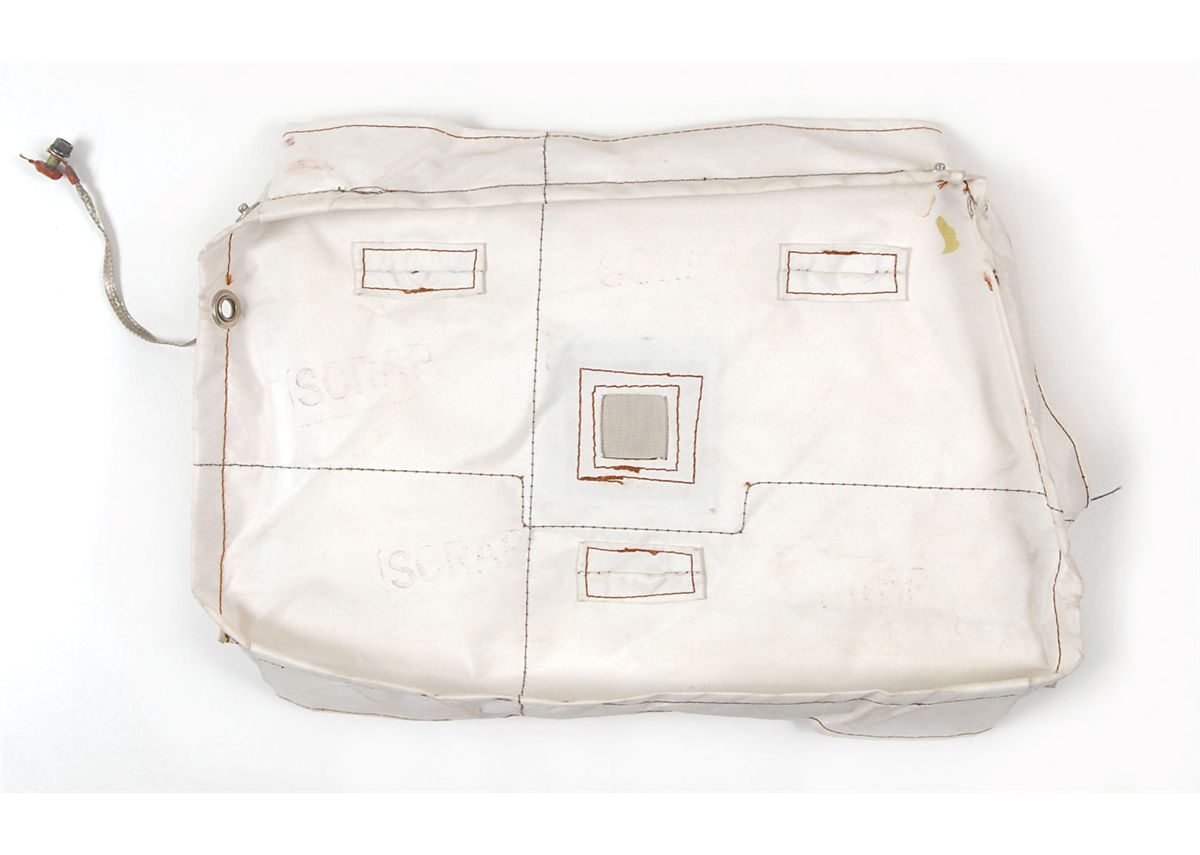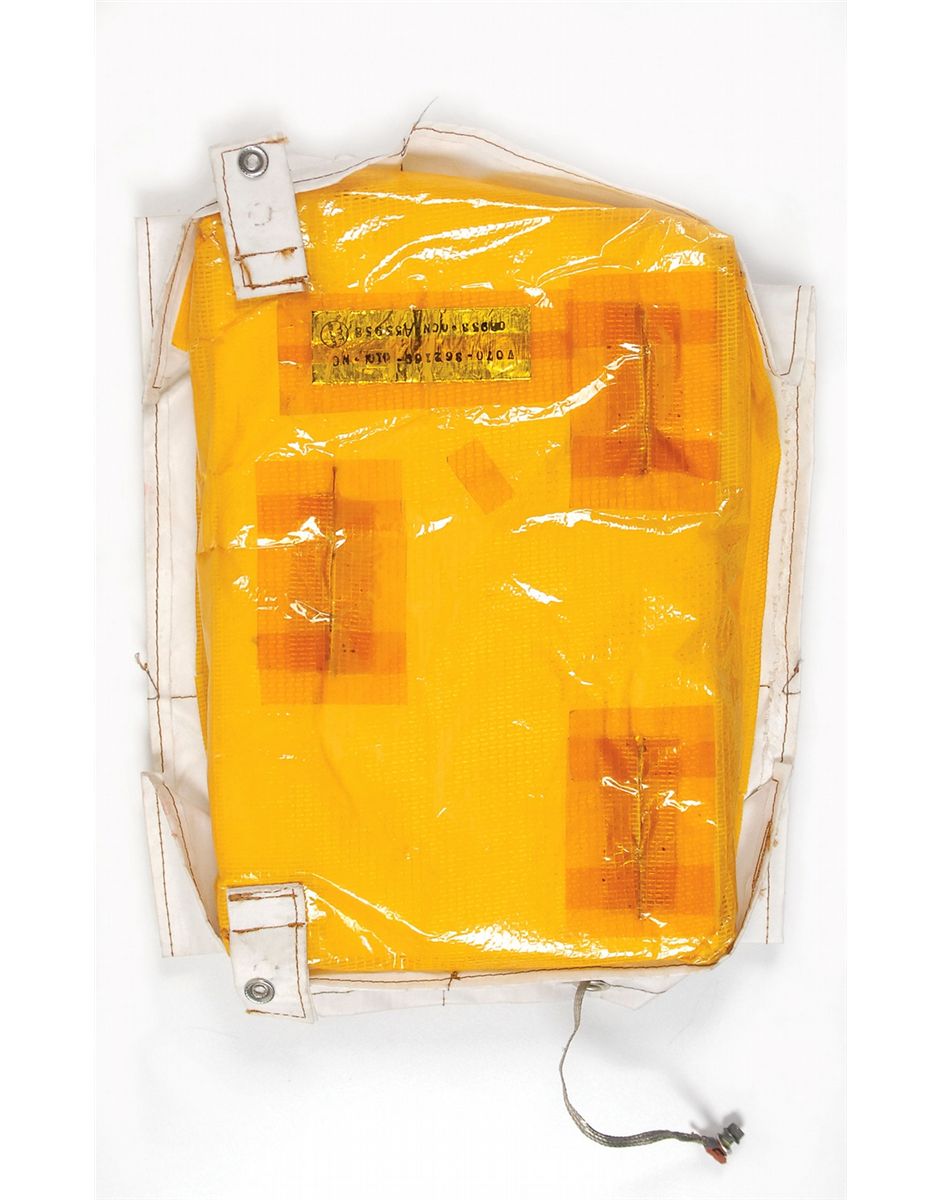 Available to US bidders only. Multi-Layer Insulation (MLI) Blanket with Beta cloth on one side and gold foil on the other, 11.5 x 9 x 1.5, part number “V070-362169-010 NC, 03953 A55958.” Beta cloth side bears multiple “Scrap” stamps and a small braided metal chord is affixed to one edge. In fine condition, with scattered soiling and light wear.