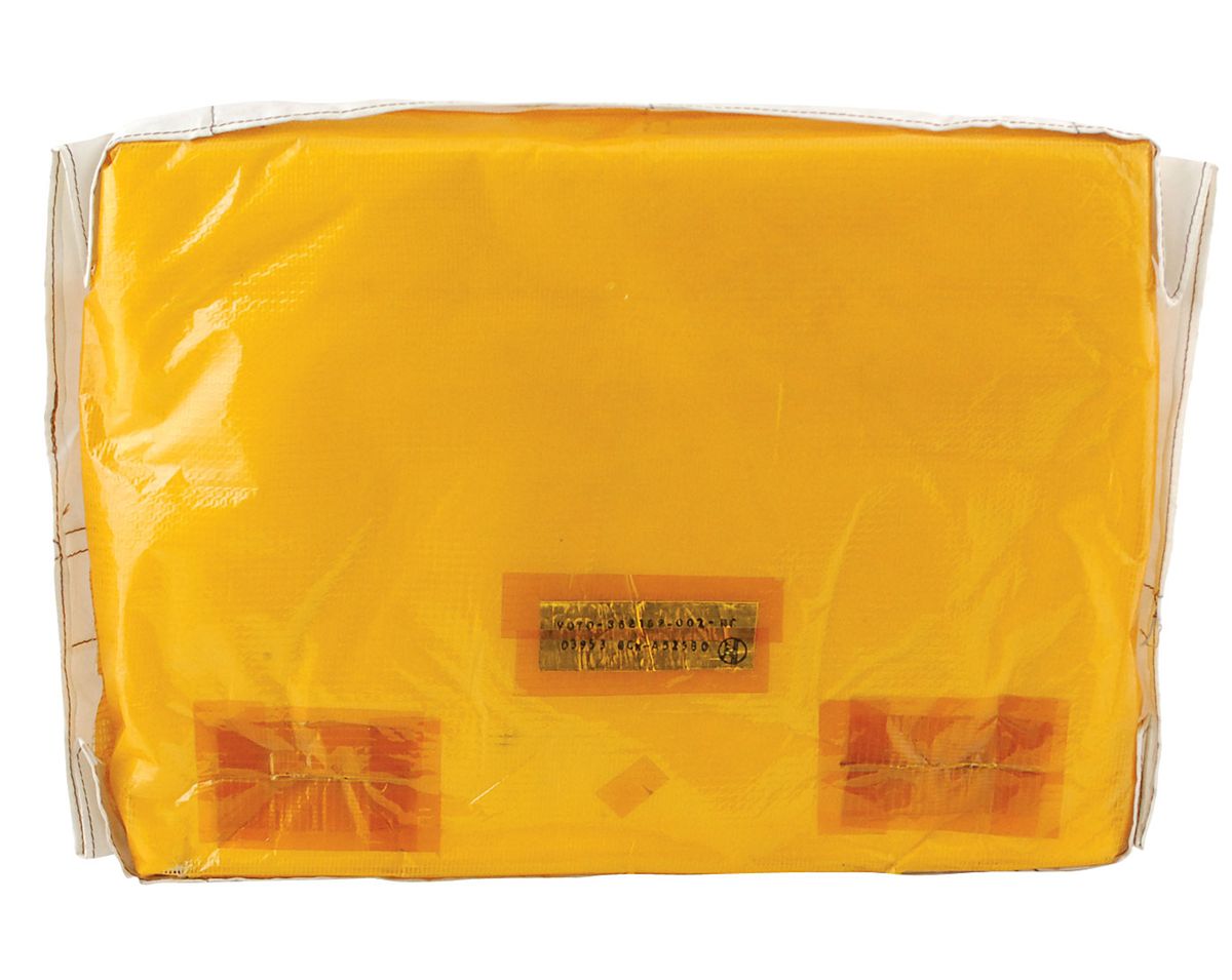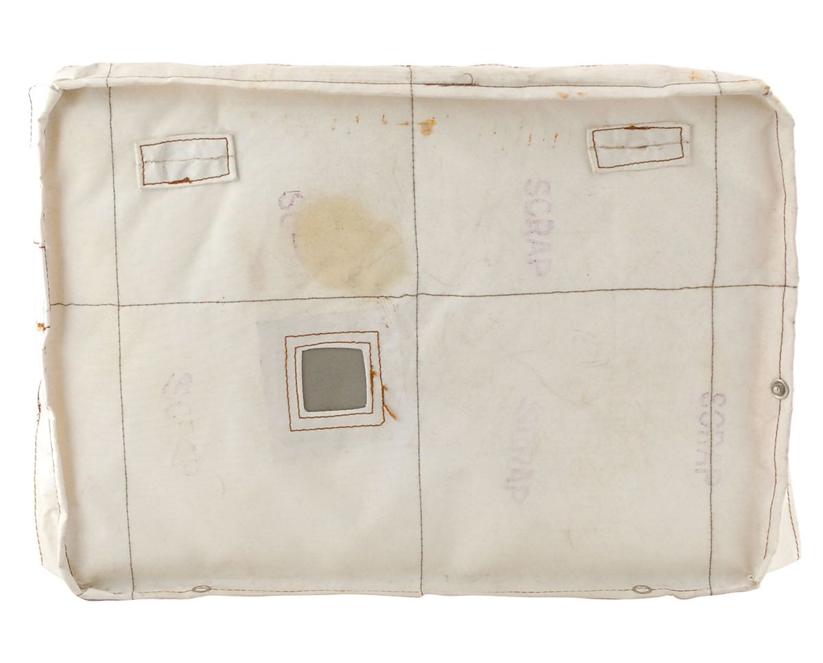 Available to US bidders only. Multi-Layer Insulation (MLI) Blanket with Beta cloth on one side and gold foil on the other, 14.5 x 11 x 1.5, part number “V070-362162-002 NC, 03953 A52380.” Beta cloth side bears multiple “Scrap” stamps. In fine condition, with scattered soiling and light wear.