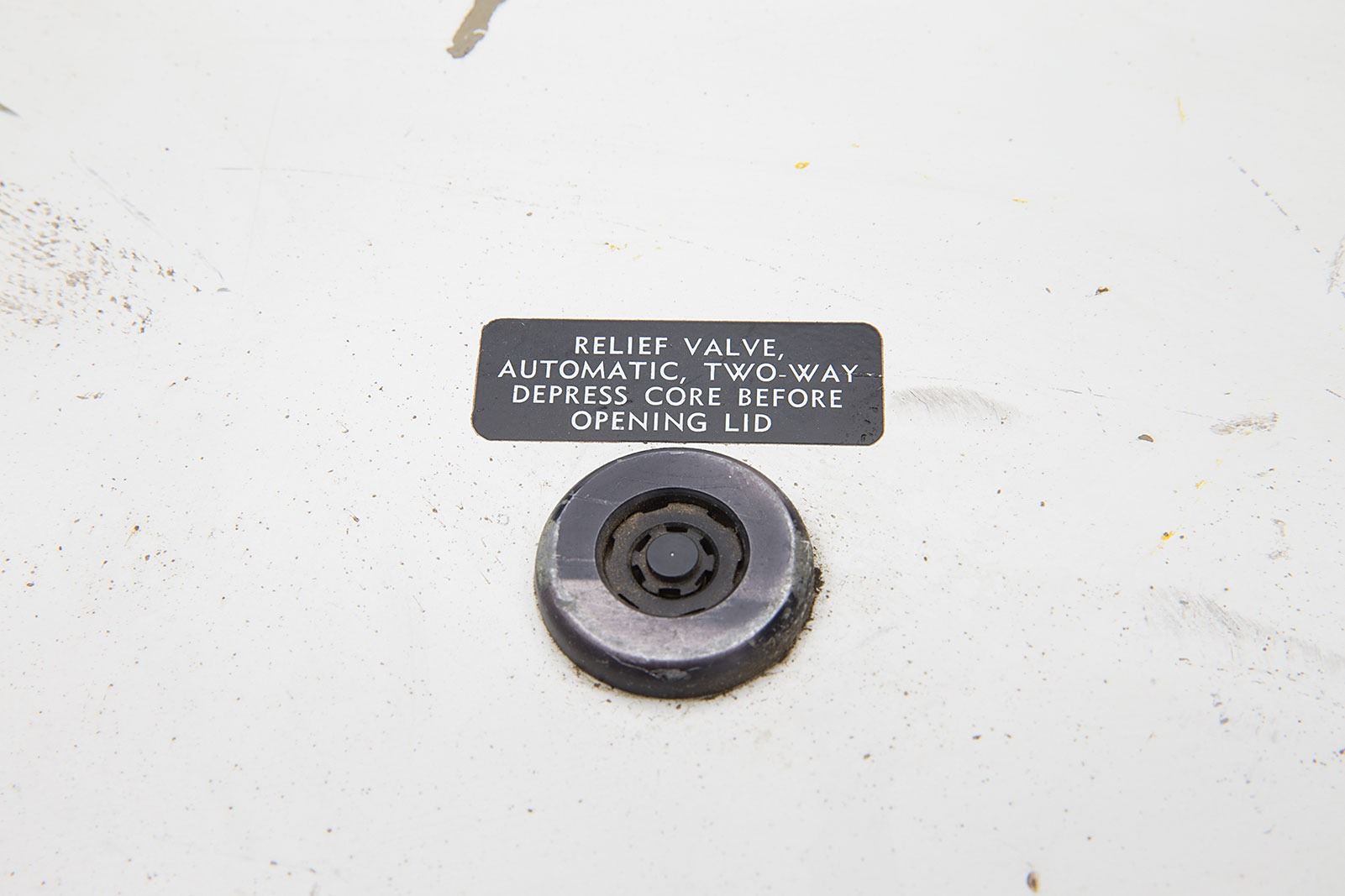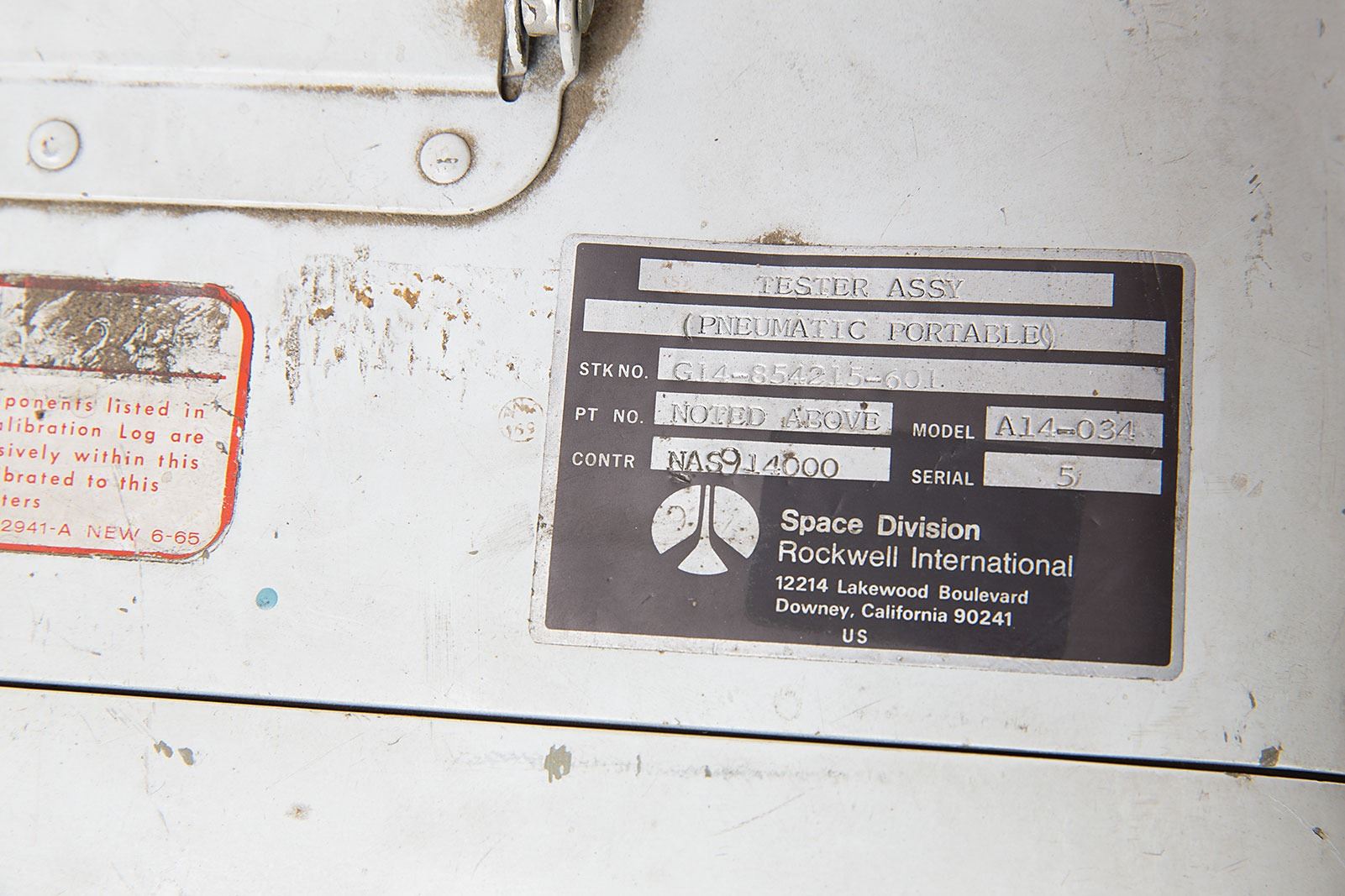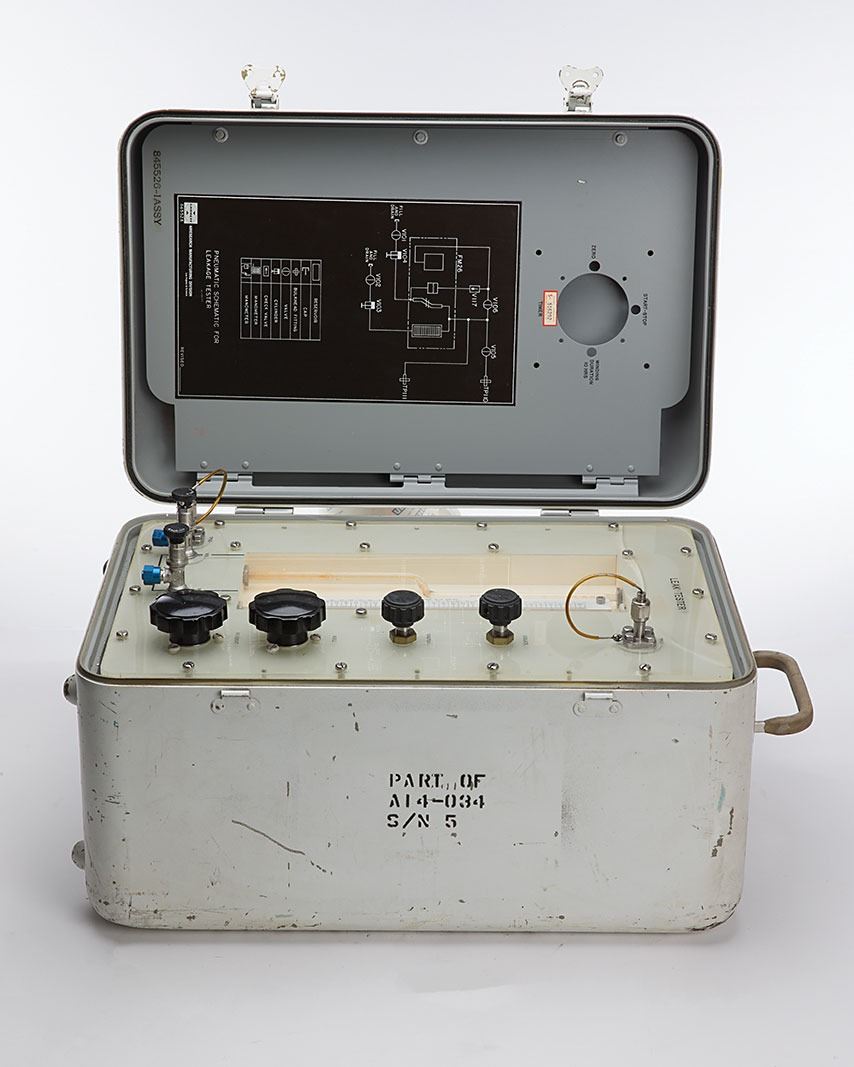 Portable leak test assembly used for testing the integrity of pressurized propellant lines on the Space Shuttle, measuring 13? x 14? x 21?, with a Rockwell International tag on the top, reading: "Tester Assy (Pneumatic Portable), Stk No. G14-854215-601, Pt No. Noted Above, Model A14-034, Contr. NAS9-14000, Serial 5." The white metal case opens to reveal the leak tester interface, complete with valves, knobs, and a pressure gauge. A pneumatic schematic for the leakage tester, prepared by Airesearch, is present inside the cover. In fine condition, with scuffs and dings to the exterior, and cracks to the top of the acrylic that covers the main panel.