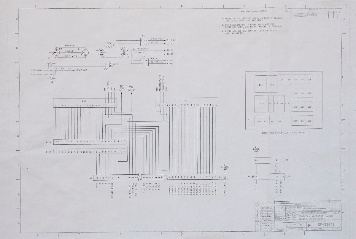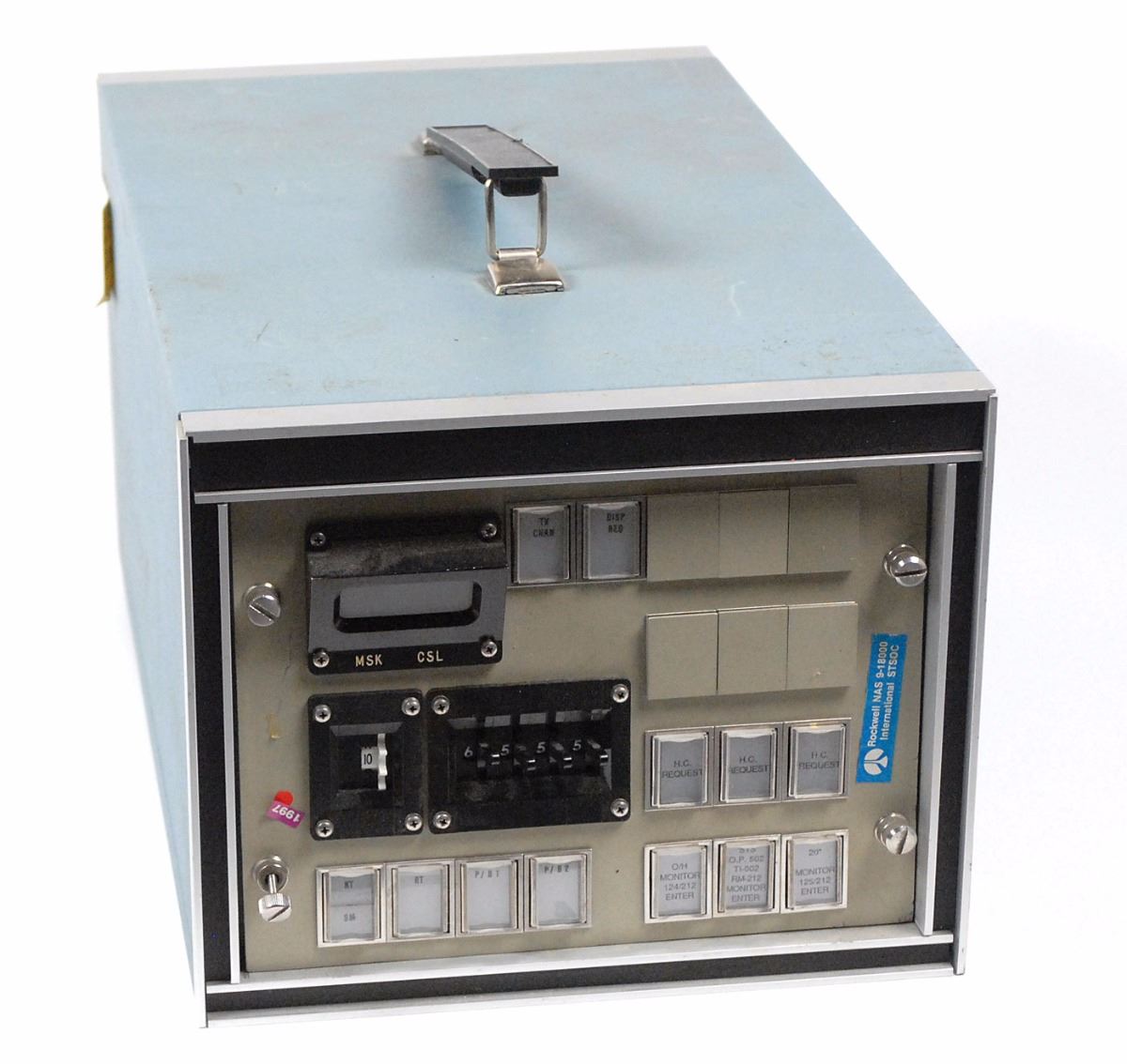 Shuttle MSK/CSL (Manual Selection Keyboard/Console) Unit. This NASA/JSC Mission Control Center (MCC) ground support hardware component measuring 10.75 x 8.5 x 16.5, has two hand-adjustable meters on the front, a small display labeled, “MSK CSL,” and several banks of buttons. A small Rockwell International label is affixed to the front of the processor. The unit is described in the 1978 NASA/Ford Aerospace publication ‘Mission Control Center (MCC) System Specification For The Shuttle Orbital Flight Test (OFT) Timeframe.’ The Mission Control Center Space Shuttle OFT Data System (OFTDS) provided facilities for flight control and data systems personnel which monitored and controlled the Shuttle flights from launch (tower clear) to rollout (wheels stopped on runway). It also supported the preparation for flight (flight planning, flight controller and crew training, and integrated vehicle and network testing activities). In addition, OFTDS provided for monitoring and control of specific payloads assigned to JSC. Equipment like MSK Console assisted realtime system monitoring performed in the MCC to assure crew safety, mission success, and qualification of the Shuttle onboard systems. Additional OFTDS tasks provided support for Orbiter guidance, targeting, communication, trajectory determination, navigation, monitoring, and control. Accompanied by three print outs of Ford Aerospace schematics titled: “CONTROL – INDICATOR MANUAL SELECTION KEYBOARD” with NASA contract number “NAS9 15014.”