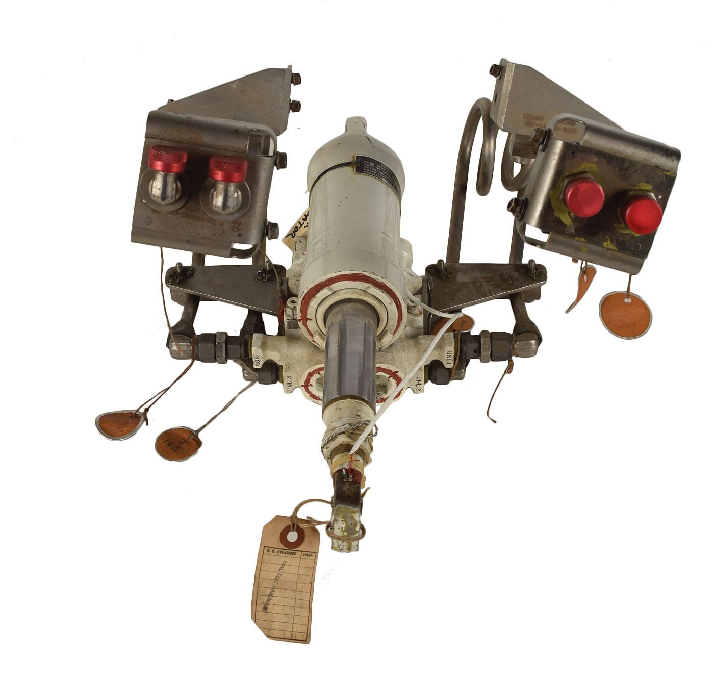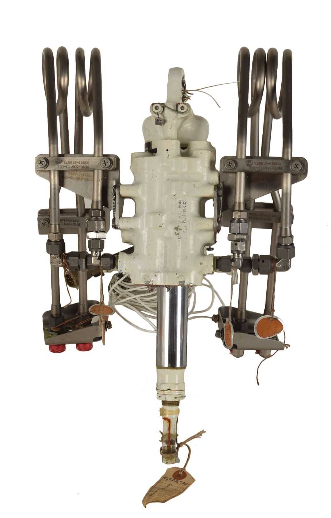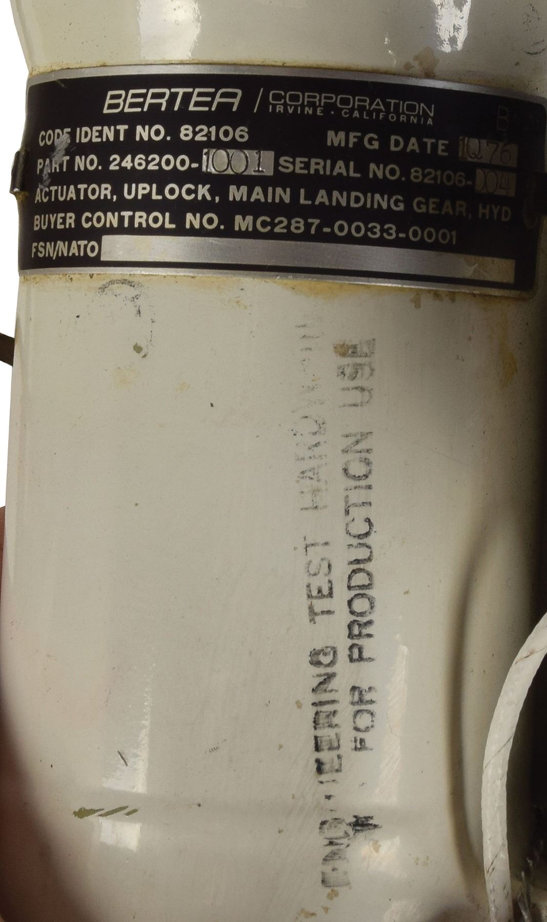 Engineering prototype of the Space Shuttle Landing Gear Uplock Actuator, measuring approximately 16 x 10 x 11, bearing a Bertea Corporation tag on the center cylinder, reading: "Code Ident No. 82106, Mfg Date 10-76, Part No. 246200-1001, Serial No. 82106-004, Actuator, Uplock, Main Landing Gear, Hyd." In fine condition. This actuator supports pre-flight retraction of the Space Shuttle main landing gear prior to launch, and release of the landing gear just prior to touch-down. An appealing piece of essential Shuttle hardware.