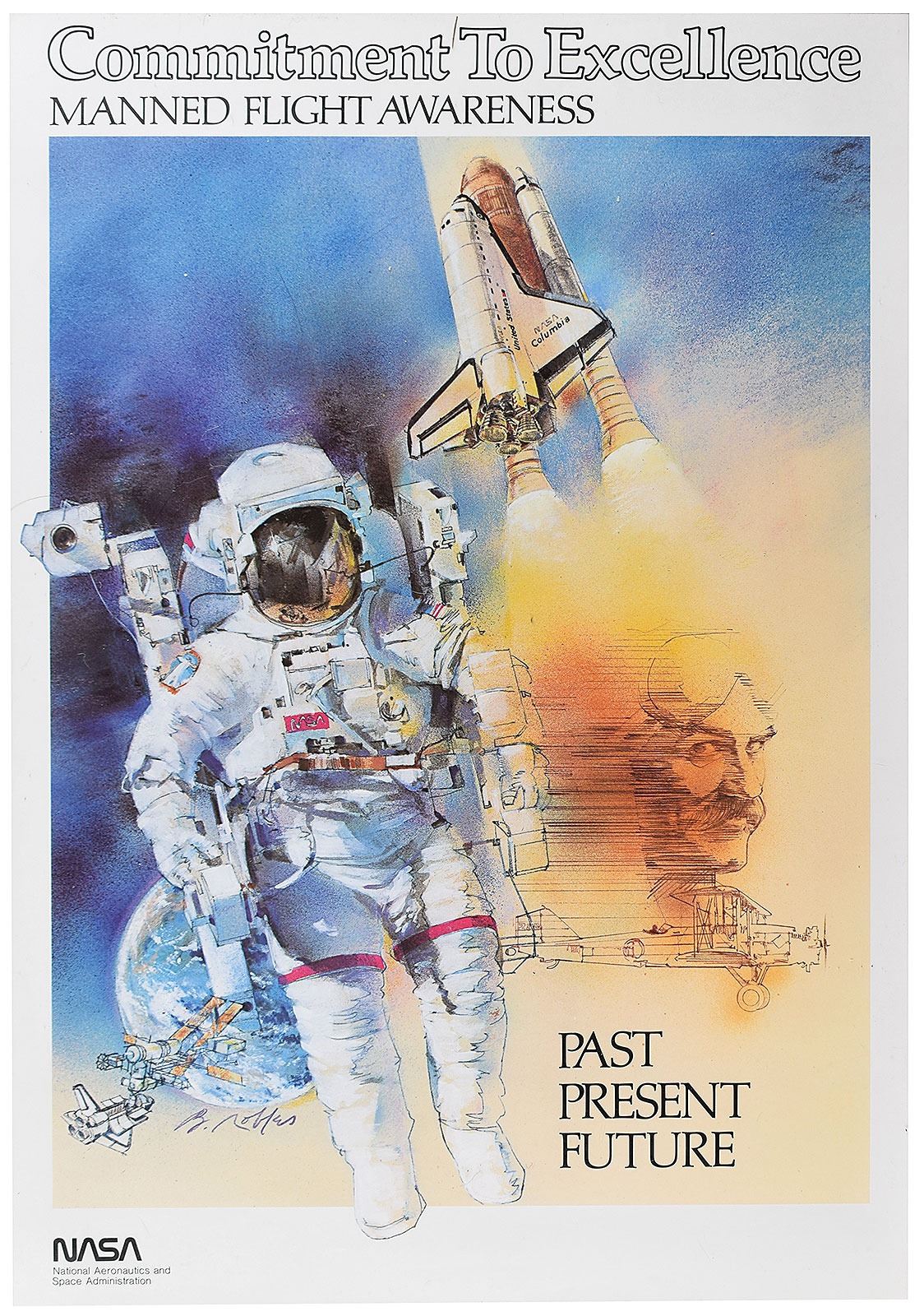 Color 15.5 x 22.25 NASA poster entitled 'Commitment to Excellence, Manned Flight Awareness,' which depicts a collage of notable aviation and Space Shuttle events, with text below, "Past, Present, Future." Rolled and in fine condition. From the personal collection of Paul Kruppenbacher, a member of the NASA Houston Landing and Recovery Division who trained Apollo astronauts in water recovery procedures and was deployed on U.S. Navy aircraft carriers for crew and spacecraft recovery operations.