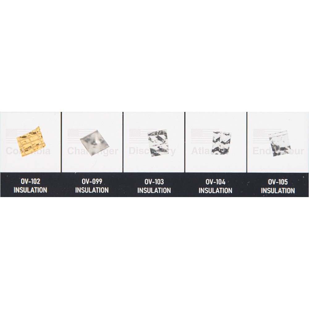 Limited edition acrylic display featuring small insulation fragments from each Space Shuttle Orbiter attested to as flown by Florian Noller: Columbia OV-102, Challenger OV-099, Discovery OV-103, Atlantis OV-104, and Endeavour OV-105. Each fragment measures approximately .25″ x .25″, and the acrylic block measures 5″ x 3.25″ x 1″. In fine condition. Accompanied by a certificate of authenticity from Florian Noller, who notes that only 100 of these displays were made.