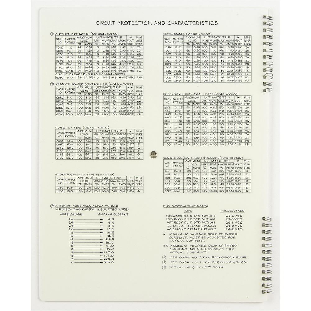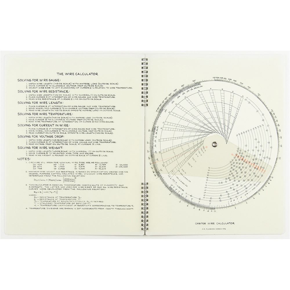 Uncommon spiral-bound ‰ÛÏOrbiter Wire Calculator‰Û booklet from the Space Shuttle program, 8.5 x 11, with the interior containing a rotating calculator and a list of steps for solving wire gauge, resistance, length, temperature, current, voltage drop, and weight, with the back cover featuring several charts and lists relative for ‰ÛÏCircuit Protection and Characteristics.‰Û Designed by J. R. Fuhrman in March 1976. In fine condition.