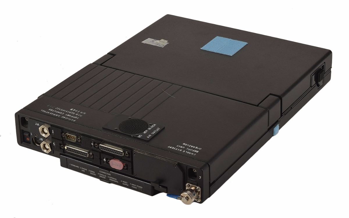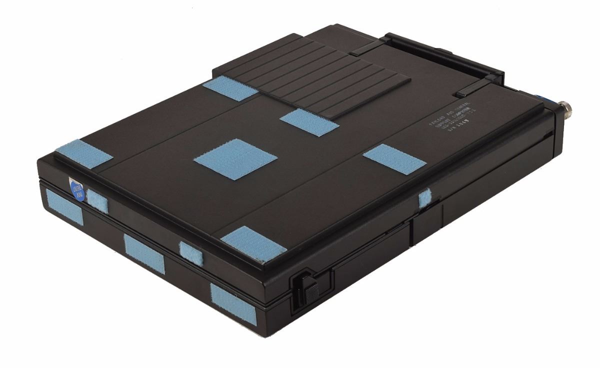 A Payload and General Support Computer (PGSC) manufactured by GRiD Systems modified for use aboard the Space Shuttle, measuring approximately 11.5 x 9 x 15 when open, stenciled with part numbers on the top, “P/N SED33103332-713, S/N 1045.” Ruggedly made with a magnesium case and additional cooling fan. One of the NASA modifications was the substitution of an external power connector (a NASA-spec circular connector) for the commercial one and disconnection of the internal power supply from the standard GRiD modular power supply slot (a standard GRiD power module will not work in this computer). Includes the associated carrying case. In fine condition. These were among the earliest, if not the first, laptop computers flown on the Shuttle; this particular computer was flight-qualified, but its flight status is unknown.