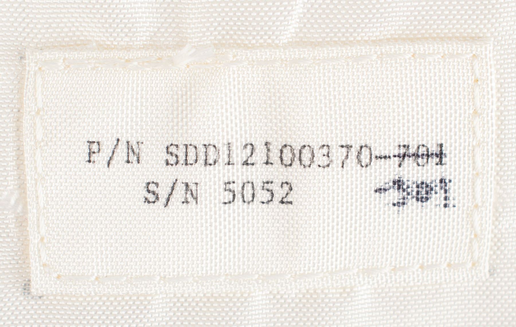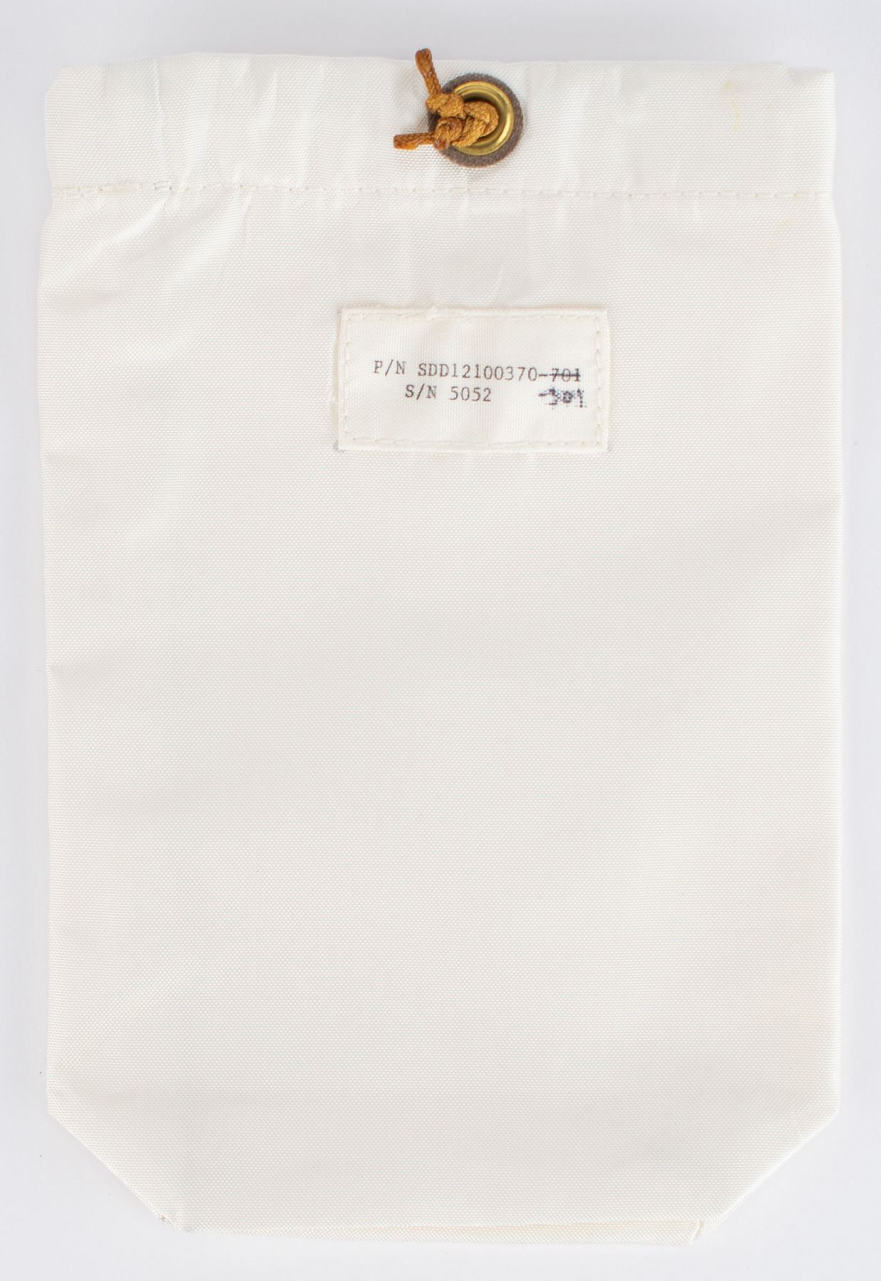 Space Shuttle Personal Preference Kit (PPK) made of white Nomex, measuring 6˝ x 9˝, with a parts tag on the front: "P/N SDD12100370-301, S/N 5052." The PPK bag is closed at the top with a brown drawstring. These PPKs were Class I flight hardware used to carry astronauts' personal effects during the Shuttle Program missions. Each astronaut was permitted to carry 20 items that could fit into one PPK. The PPKs were handled by ground support personnel using white gloves, which may account for their very clean condition. The PPKs were stored on the Shuttle in a compartment inaccessible to the crew during flight. The design of this PPK is based off a similar design/shape/size as those used on the Apollo Program. The bottom of the bag has a gusset that opens to about 1.75˝ wide. A NASA contractor printed the ID labels with the wrong dash number on an entire batch: this is one from that batch, which has a corrected dash number in ink (“-301") from what was printed (“-701").
