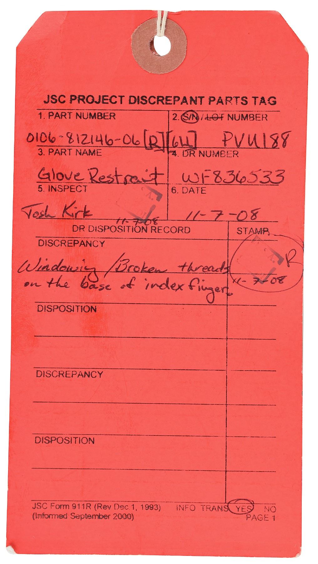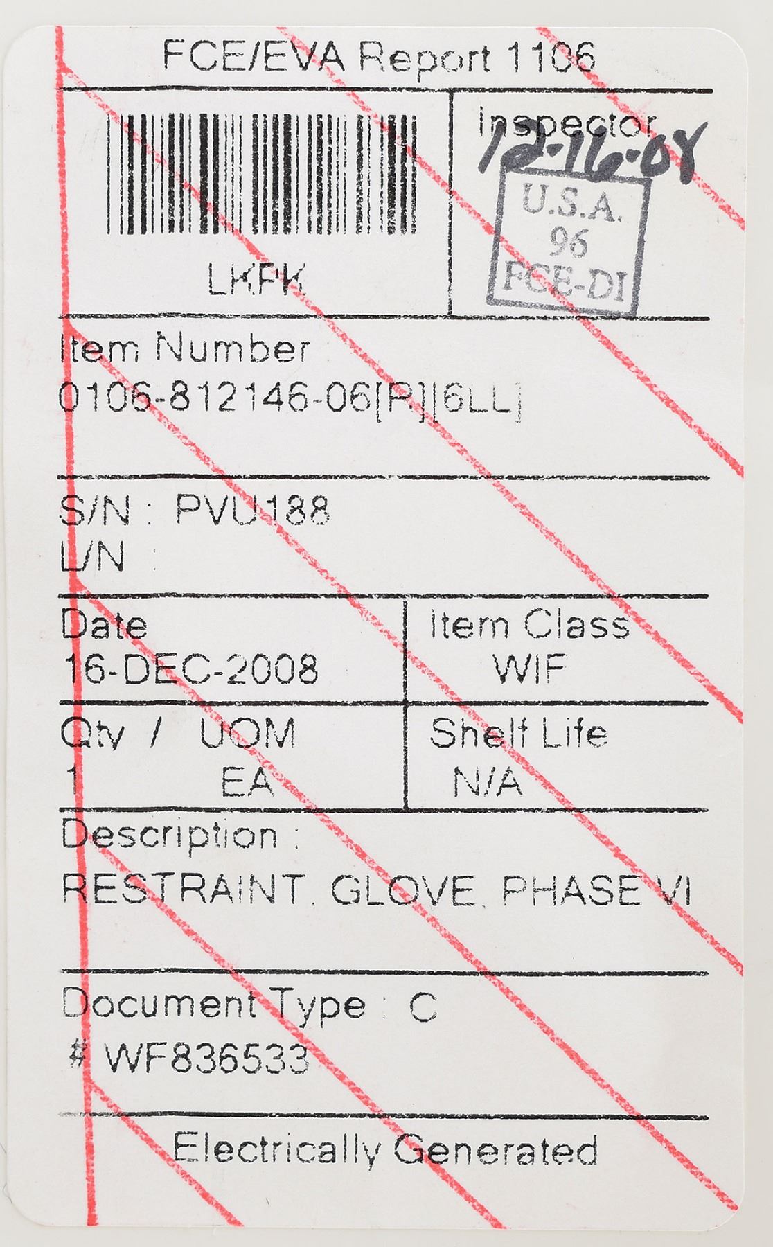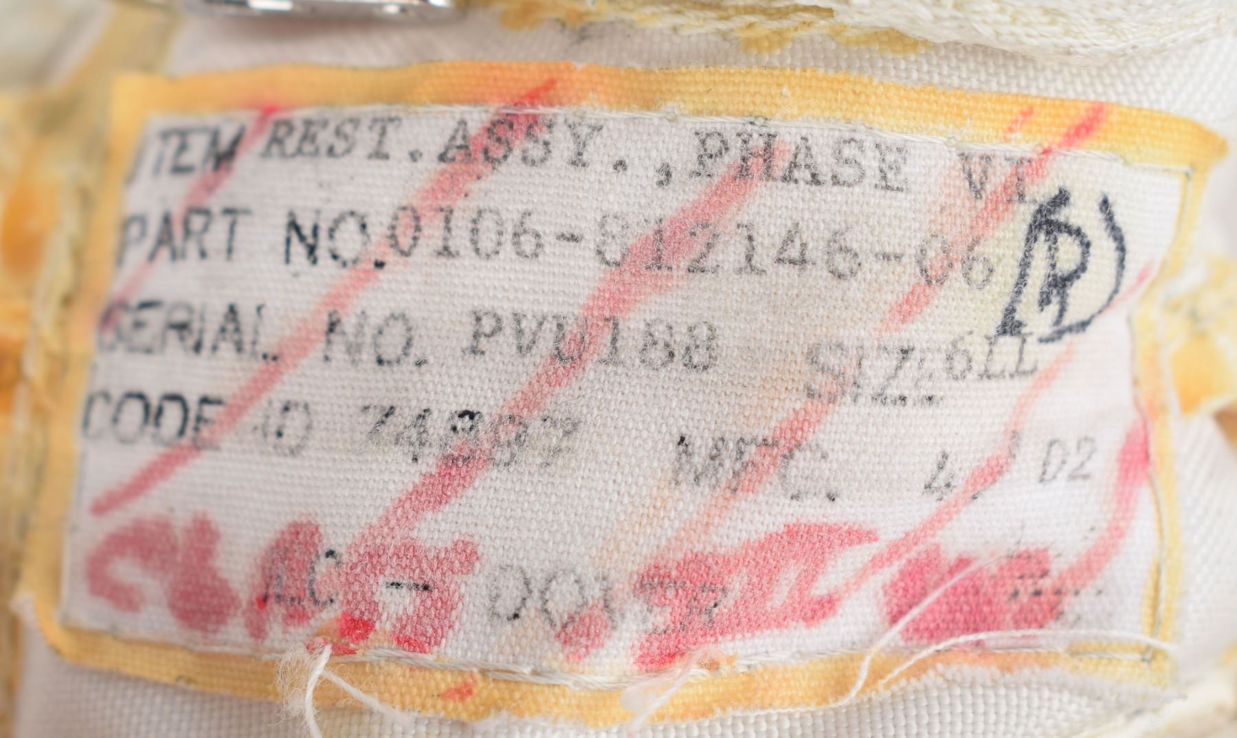 Rare right-handed Phase VI Space Shuttle glove restraint layer, with parts tag sewn on the back of the hand: "Item: Rest. Assy., Phase VI, Part No. 0106-812146-06(R), Serial No. PVU188, Size 6LL, Code ID 74897, MFG 4/02," struck through and annotated in red felt tip, "Class III." Sewn behind the wrist is another tag, reading: "Item: Phase VI Softgood Subassembly, Part No. 0106-212147-06, Serial No. PVU166, Size 6LL, Code ID 74897, MFG 6/02," also struck through in felt tip. The restraint layer fits over the plastic bladder layer that holds pressurized oxygen inside the glove, and restrains the interior from ballooning under pressure. The adjustable pulley and metal restraint system allows for a custom-fit. Includes the original bag with JSC Project Discrepant Parts Tag, with inspector's note of the "windowing/broken threads on the base of index finger."
