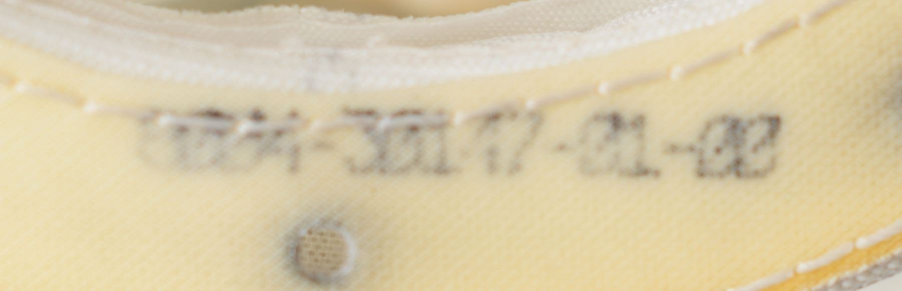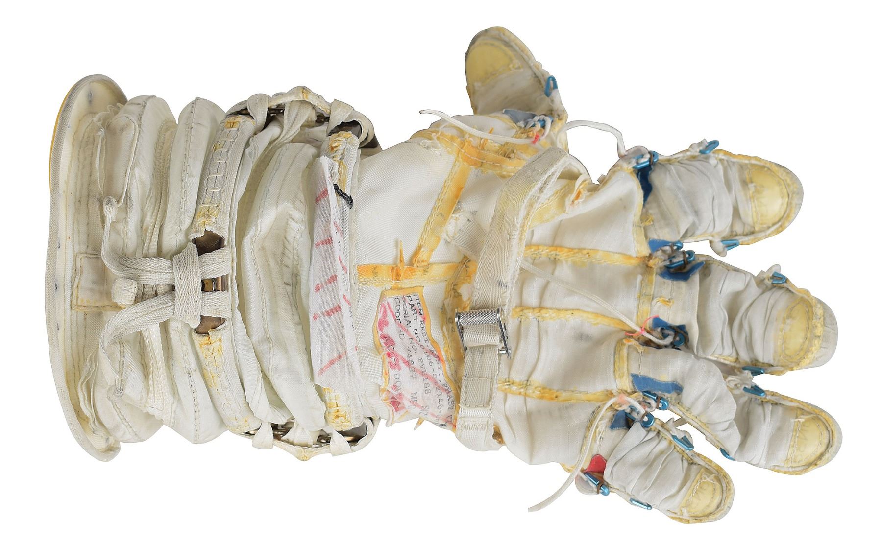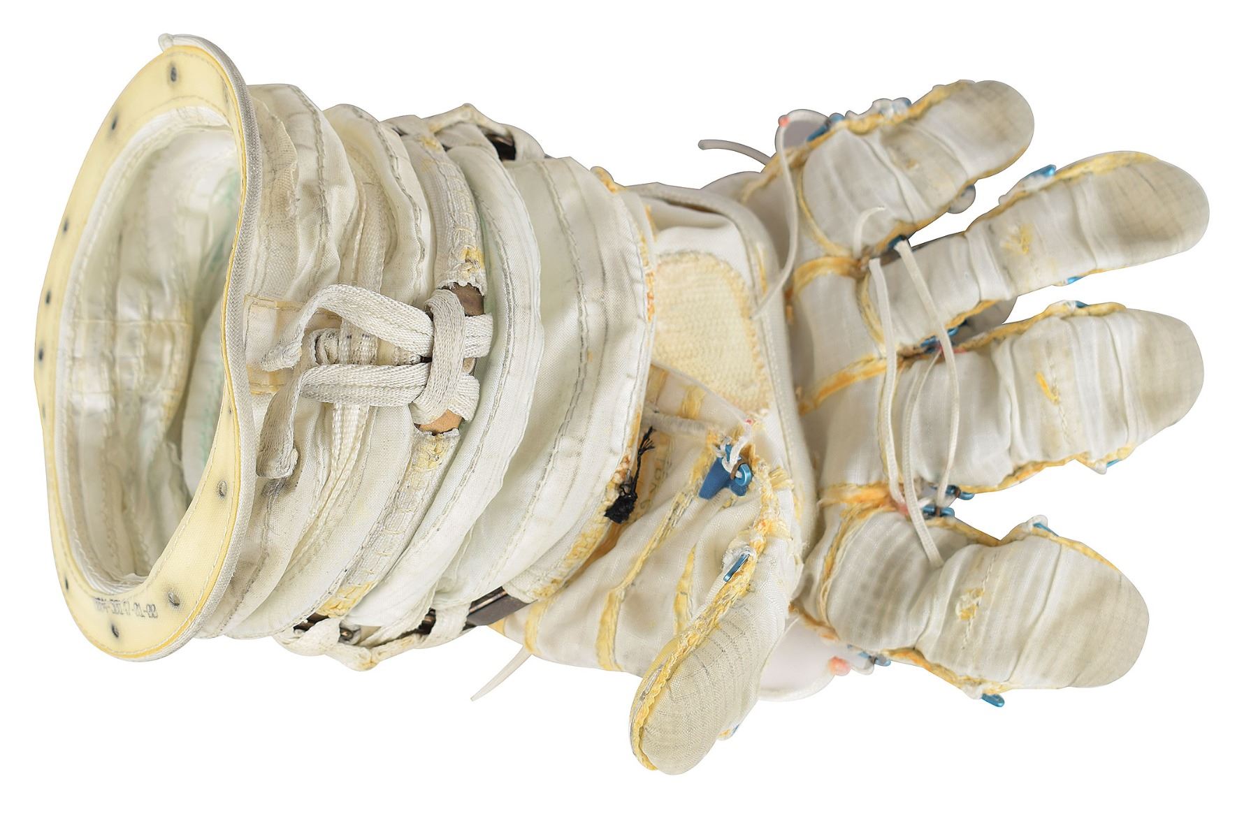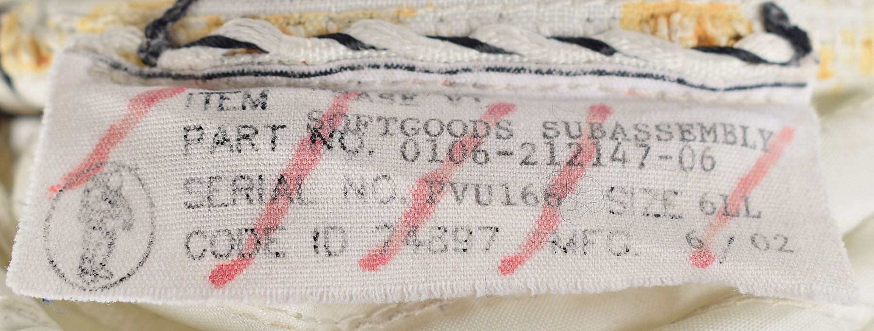 Rare right-handed Phase VI Space Shuttle glove restraint layer, with parts tag sewn on the back of the hand: "Item: Rest. Assy., Phase VI, Part No. 0106-812146-06(R), Serial No. PVU188, Size 6LL, Code ID 74897, MFG 4/02," struck through and annotated in red felt tip, "Class III." Sewn behind the wrist is another tag, reading: "Item: Phase VI Softgood Subassembly, Part No. 0106-212147-06, Serial No. PVU166, Size 6LL, Code ID 74897, MFG 6/02," also struck through in felt tip. The restraint layer fits over the plastic bladder layer that holds pressurized oxygen inside the glove, and restrains the interior from ballooning under pressure. The adjustable pulley and metal restraint system allows for a custom-fit. Includes the original bag with JSC Project Discrepant Parts Tag, with inspector's note of the "windowing/broken threads on the base of index finger."