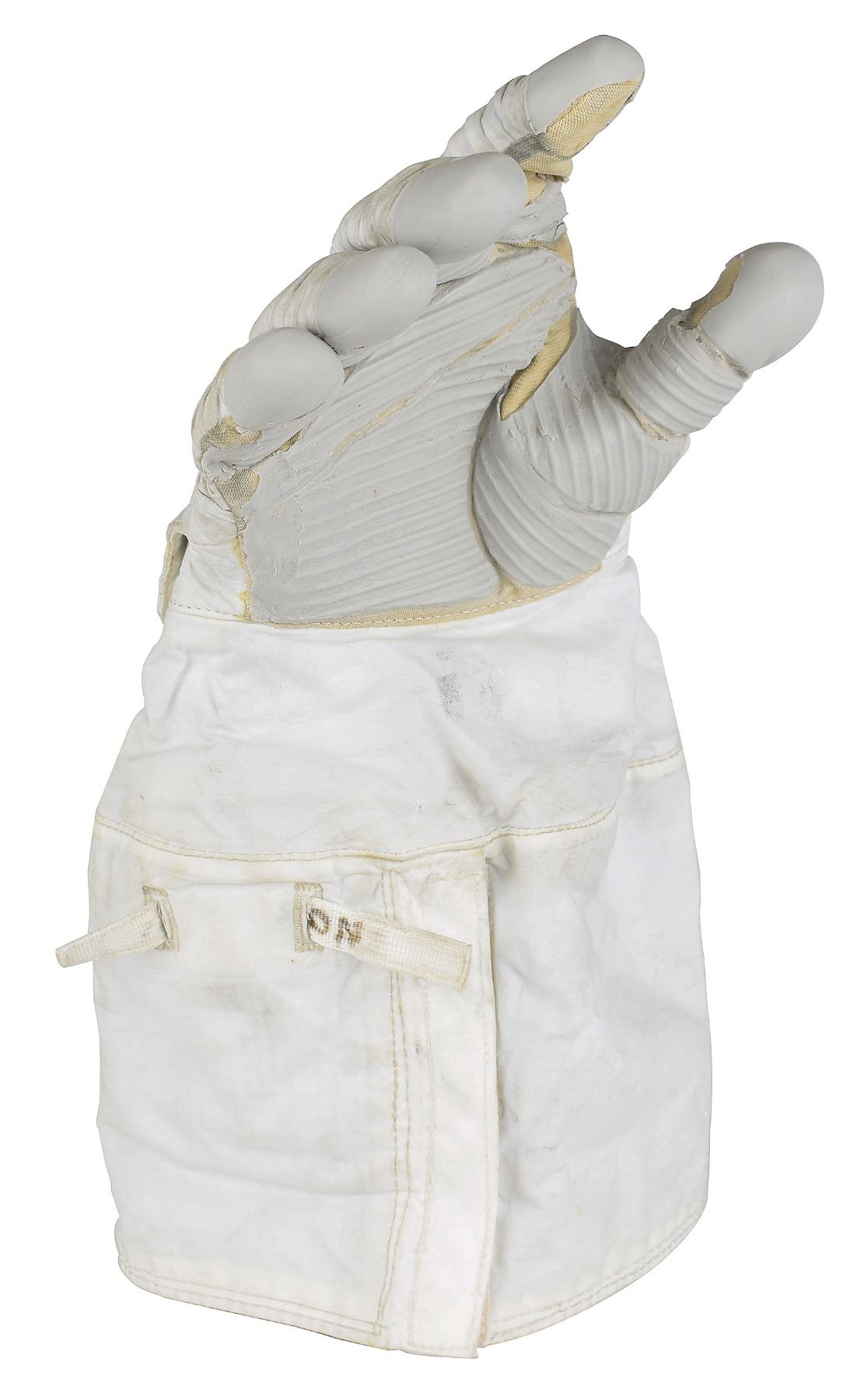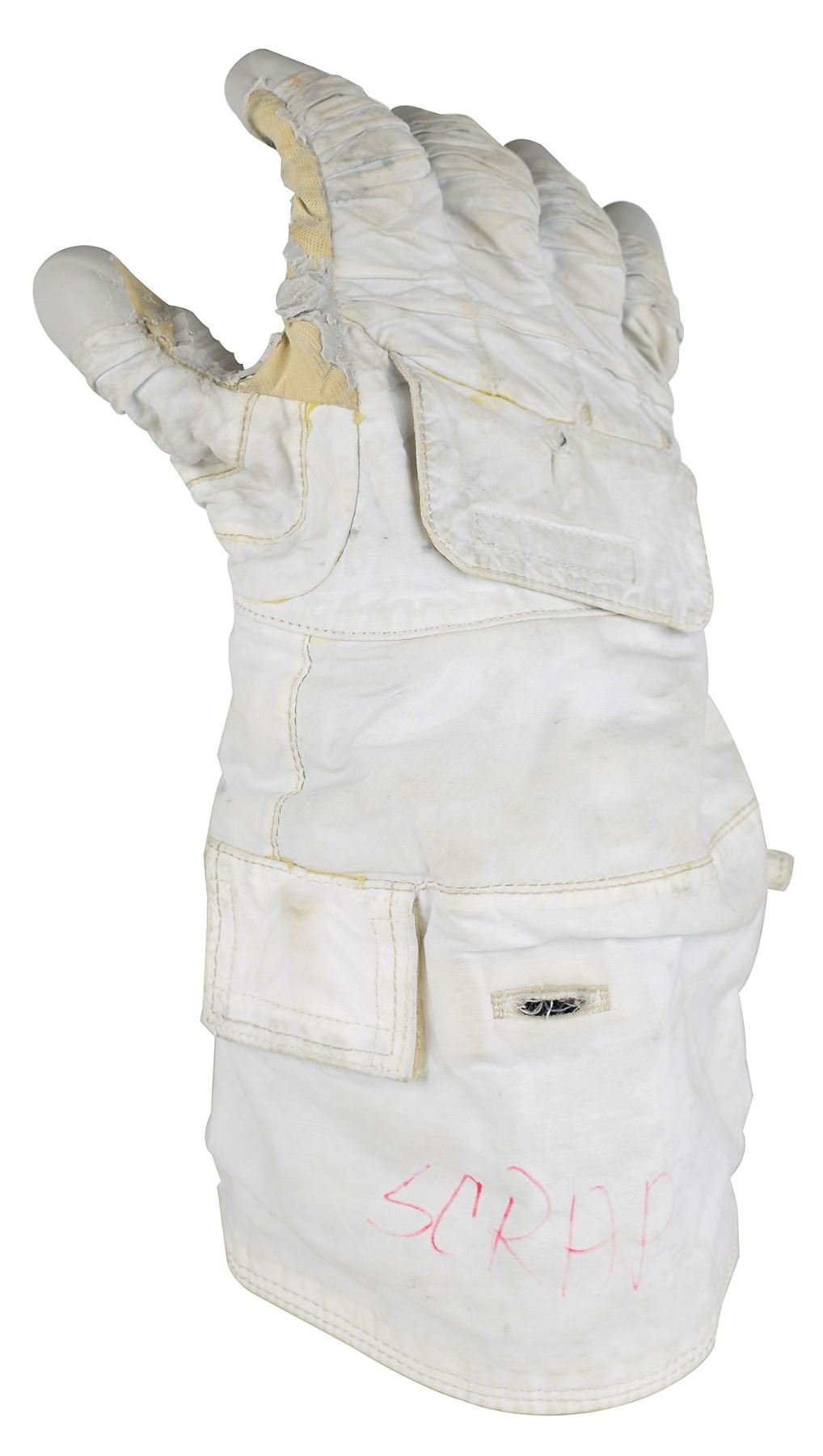 Sought-after Phase VI Space Shuttle glove TMG (Thermal Micrometeoroid Garment), with two ILC-Dover tags on the interior, reading: "Item: Phase VI TMG, Glove Assembly, Part No. 0106-812107-02, Serial No. PVU-013" and "Item: RPHG Phase VI TMG, Assy.," both struck through and annotated with red felt tip, "Class III." The TMG glove features a gray silicon palm and fingertips, a handback flap, and interior cable terminating in power pack, with exterior featuring an on/off pull strap. Exhibits significant wear and losses to the palm and fingers. The TMG is the outermost layer of the space suit glove and provides insulation, radiation shielding, and protection from micrometeorites that could otherwise puncture the suit.