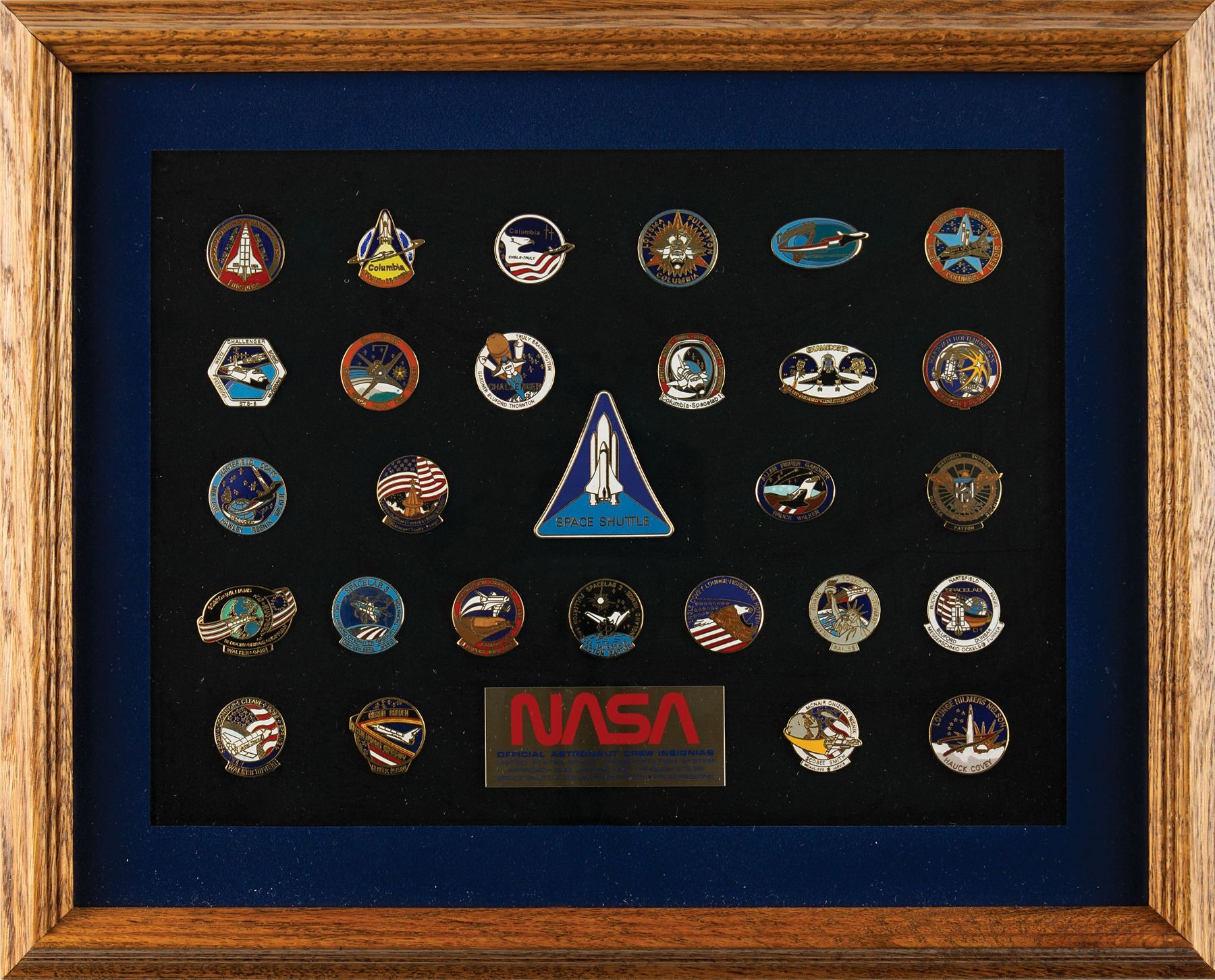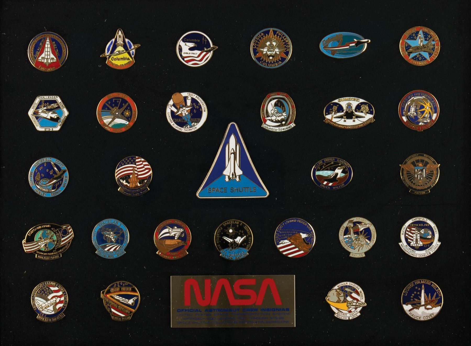 Attractive display of 28 collector's edition pins featuring Space Shuttle mission insignia, representing the program from the Approach and Landing Test through STS-26. Framed to an overall size of 15.5 x 12.5. In fine condition.