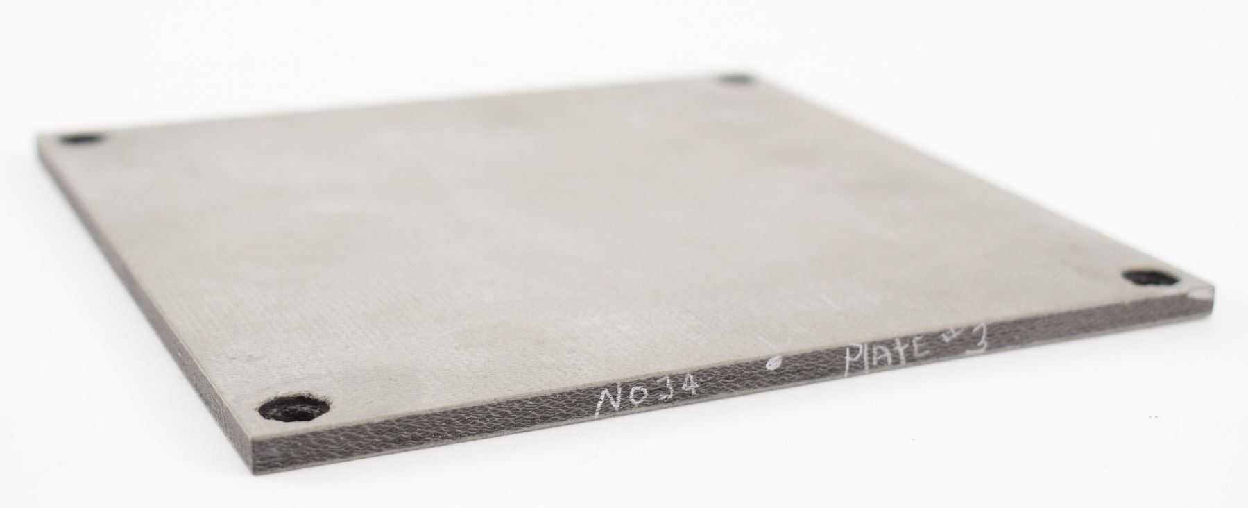 Reinforced-carbon carbon (RCC) panel designed for the Space Shuttle, 6˝ x 6˝ x .25˝, marked on an edge: "No. 34, Plate 3." Includes a manila envelope with inspection annotations and a plastic bag with affixed inspection label (identifying it as "Part Number SDD39137552-001, Serial Number 1002"), as well as a bag with deaccession label identifying it as "RCC Practice Panel." In fine condition. RCC panels were used on the leading edges of Space Shuttle orbiter wings, the nose cap, and around the external tank structural attachment point. No export/sale to non-US citizens or entities.