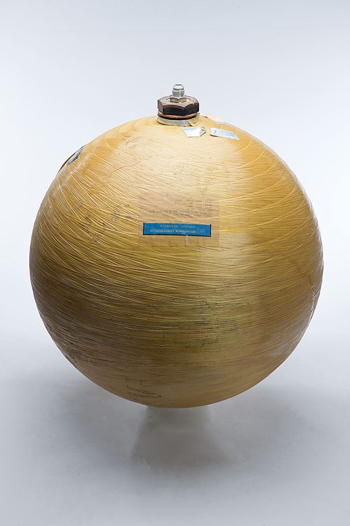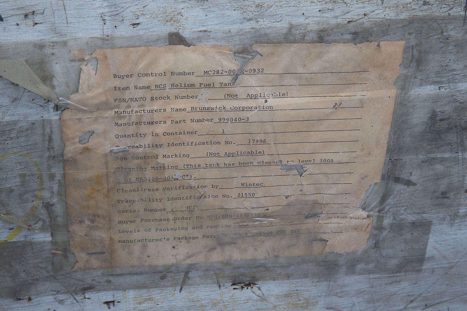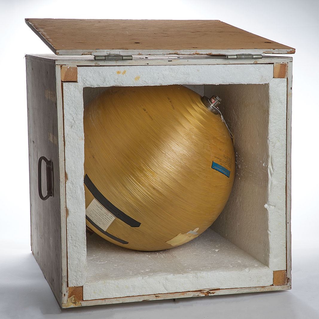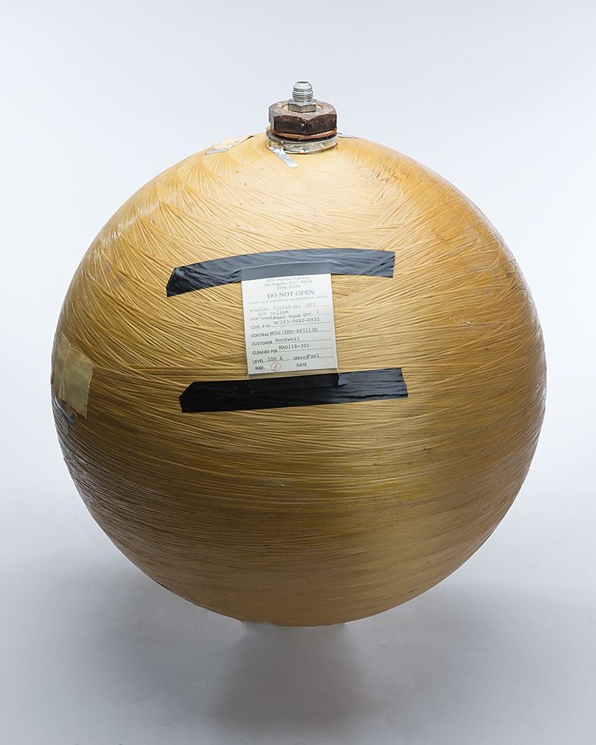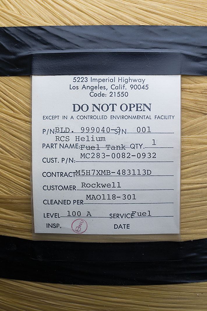 Space Shuttle Reaction Control System (RCS) Helium Tank, measuring 19? in diameter, with a Brunswick Corporation tag on the side, reading: "Vessel Ass'y - RCS He Tank (Fuel), Rockwell Int'l Control No. MC282-0082-0032, Mfg. Date: 05/76, Manuf. S/N: 001, Manuf. P/N: BLD-999040-3, Manuf. Code Ident. 17996." The sides of the tank are marked "Engineering Test." An additional inspection tag, marked "Do Not Open, Except in a Controlled Environmental Facility," is taped on the side. In fine condition. Accompanied by a two-page excess property list for "Contract NAS9-14000," naming this tank as item #14 with a cost of $10,000. Also includes a large wooden shipping crate, with related paperwork taped to the lid. This lightweight composite spun tank would have been used to store pressurization gasses for the Space Shuttle's Reaction Control System (RCS), which used thrusters to provide attitude control for the spacecraft.