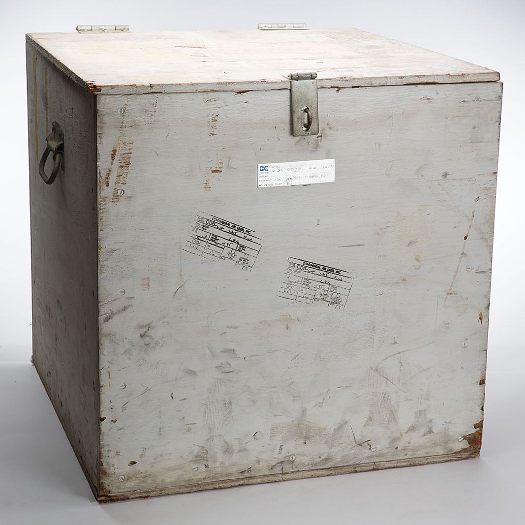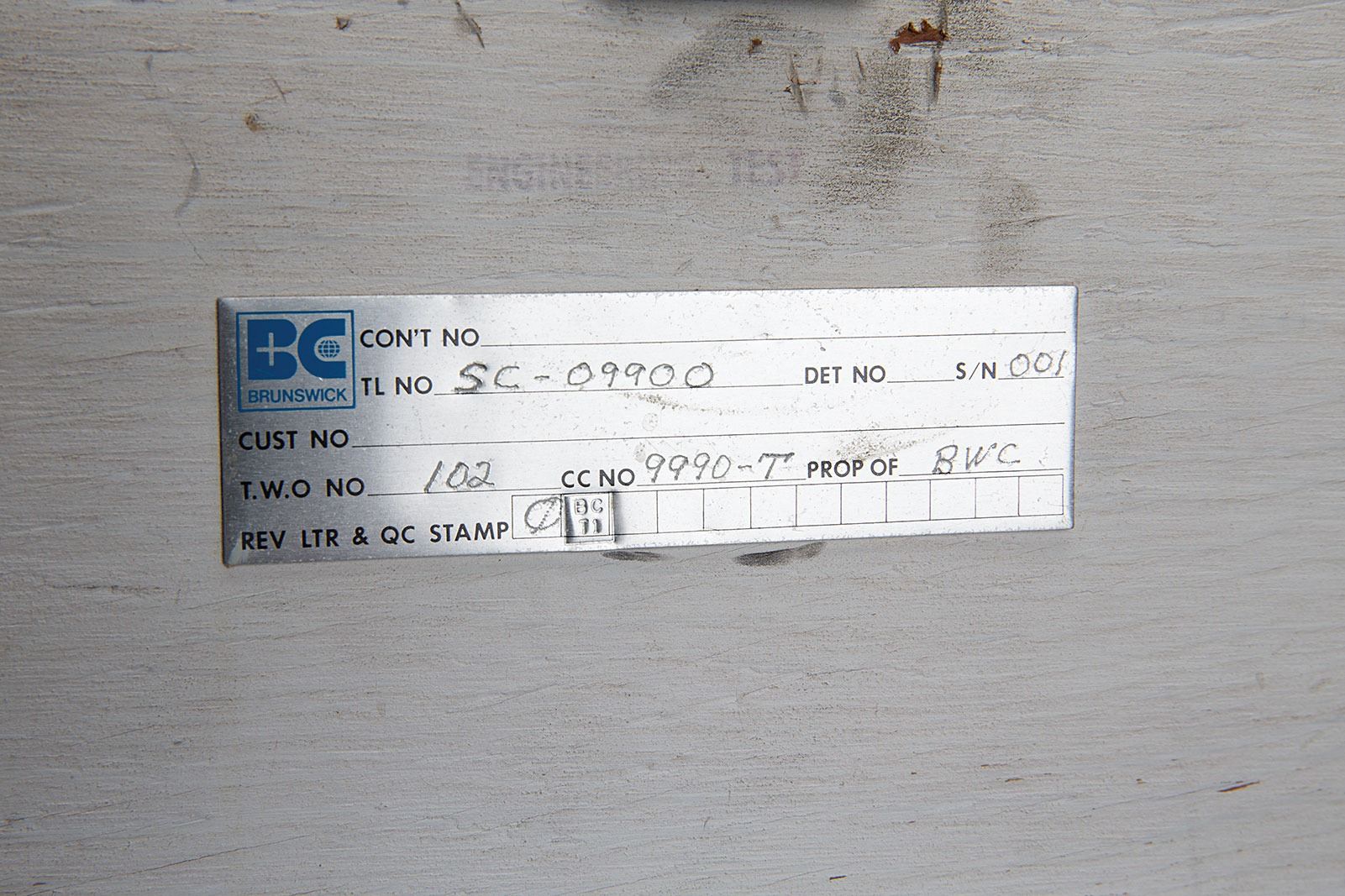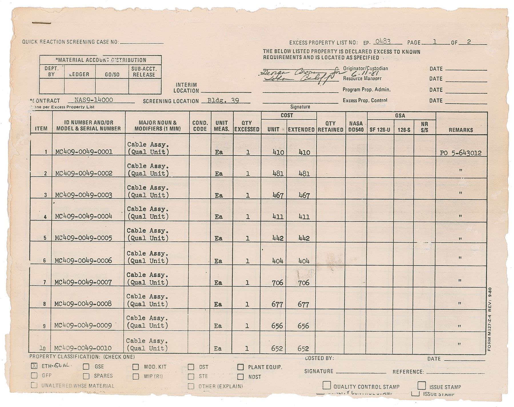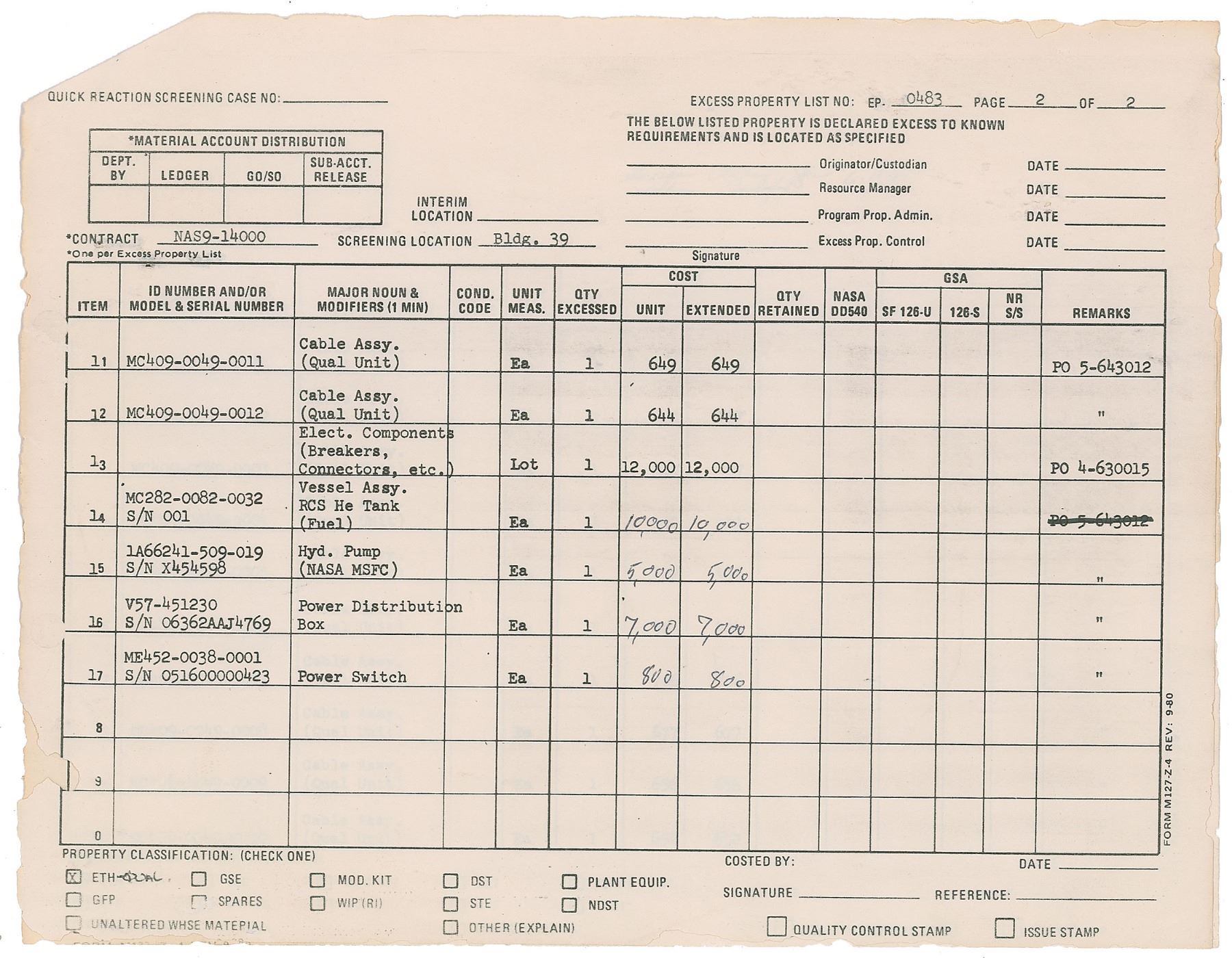 Space Shuttle Reaction Control System (RCS) Helium Tank, measuring 19? in diameter, with a Brunswick Corporation tag on the side, reading: "Vessel Ass'y - RCS He Tank (Fuel), Rockwell Int'l Control No. MC282-0082-0032, Mfg. Date: 05/76, Manuf. S/N: 001, Manuf. P/N: BLD-999040-3, Manuf. Code Ident. 17996." The sides of the tank are marked "Engineering Test." An additional inspection tag, marked "Do Not Open, Except in a Controlled Environmental Facility," is taped on the side. In fine condition. Accompanied by a two-page excess property list for "Contract NAS9-14000," naming this tank as item #14 with a cost of $10,000. Also includes a large wooden shipping crate, with related paperwork taped to the lid. This lightweight composite spun tank would have been used to store pressurization gasses for the Space Shuttle's Reaction Control System (RCS), which used thrusters to provide attitude control for the spacecraft.