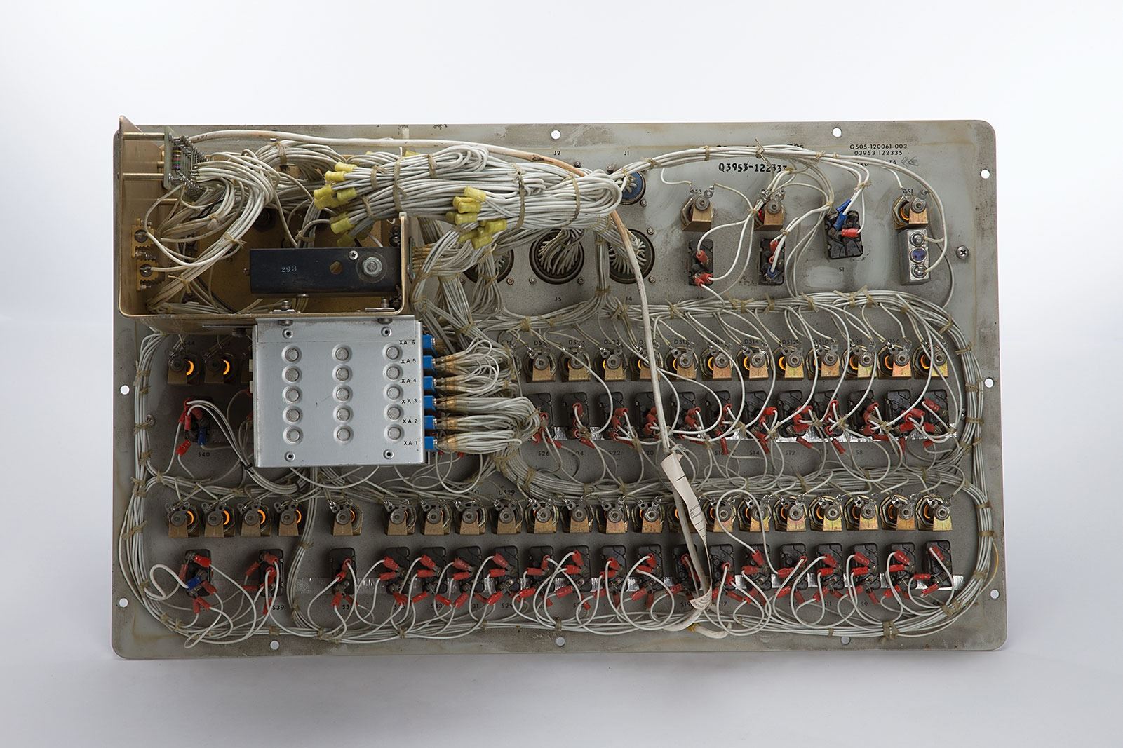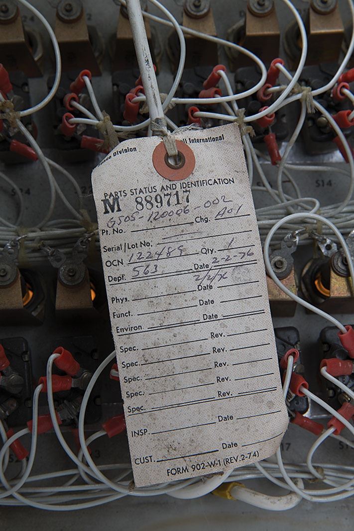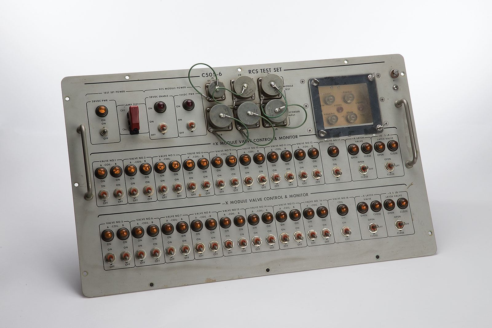 Space Shuttle Reaction Control System (RCS) Test Set Panel, measuring 25? x 15? x 10?, marked on the front, "C505-6 RCS Test Set." The reverse is stenciled with part numbers: "G505-120061-003, 03953 122335, MRD 006476." A Rockwell International parts tag is attached, dated February 2, 1976. The visually impressive panel boasts two rows of toggle switches with indicator lights, in sections labeled "+X Module Valve Control & Monitor" and "-X Module Valve Control & Monitor," each associated with a specific valve and coil. Ports at the top are labeled "J1" through "J6." The unit retains its wiring in the rear. In fine condition.