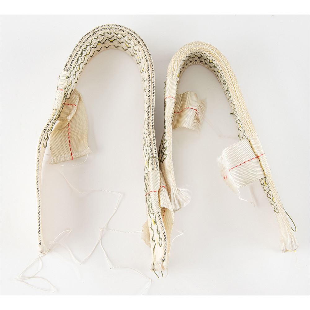 Pair of heavy-duty nylon parachute risers designed to safely lower reusable Space Shuttle Solid Rocket Boosters (SRB). The pieces measure 17.5è and 22è in length and each feature a pair of cut strap ends. In overall fine condition. SRBs are lowered to the ocean for recovery by the deployment of three separate sets of parachutes. These parachutes are attached to the boosters by a series of risers made of heavy-duty nylon webbing. The parachutes are manufactured and refurbished for reuse at the Parachute Refurbishment Facility at the Kennedy Space Center.