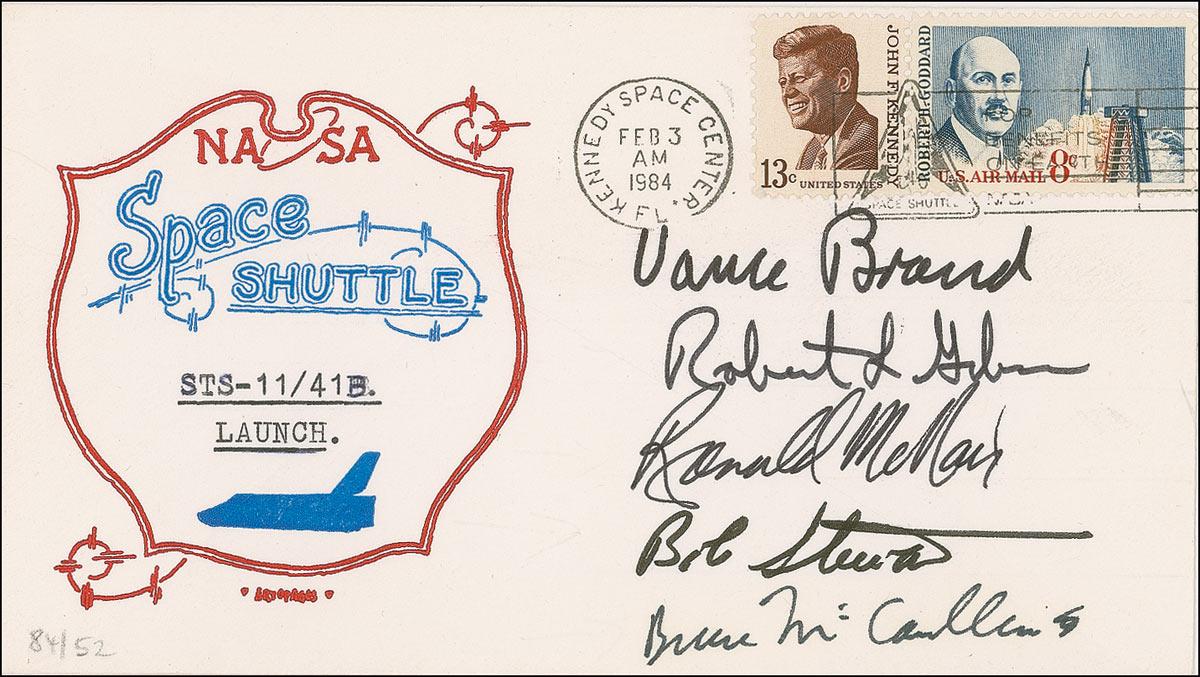 Commemorative cover with a cachet honoring the launch of shuttle mission STS-11/41B, signed in black felt tip by crew members Vance Brand, Robert Gibson, Ronald McNair, Bob Stewart, and Bruce McCandless. In fine condition, with a bit of light haloing to McCandless signature.