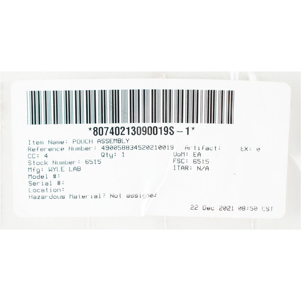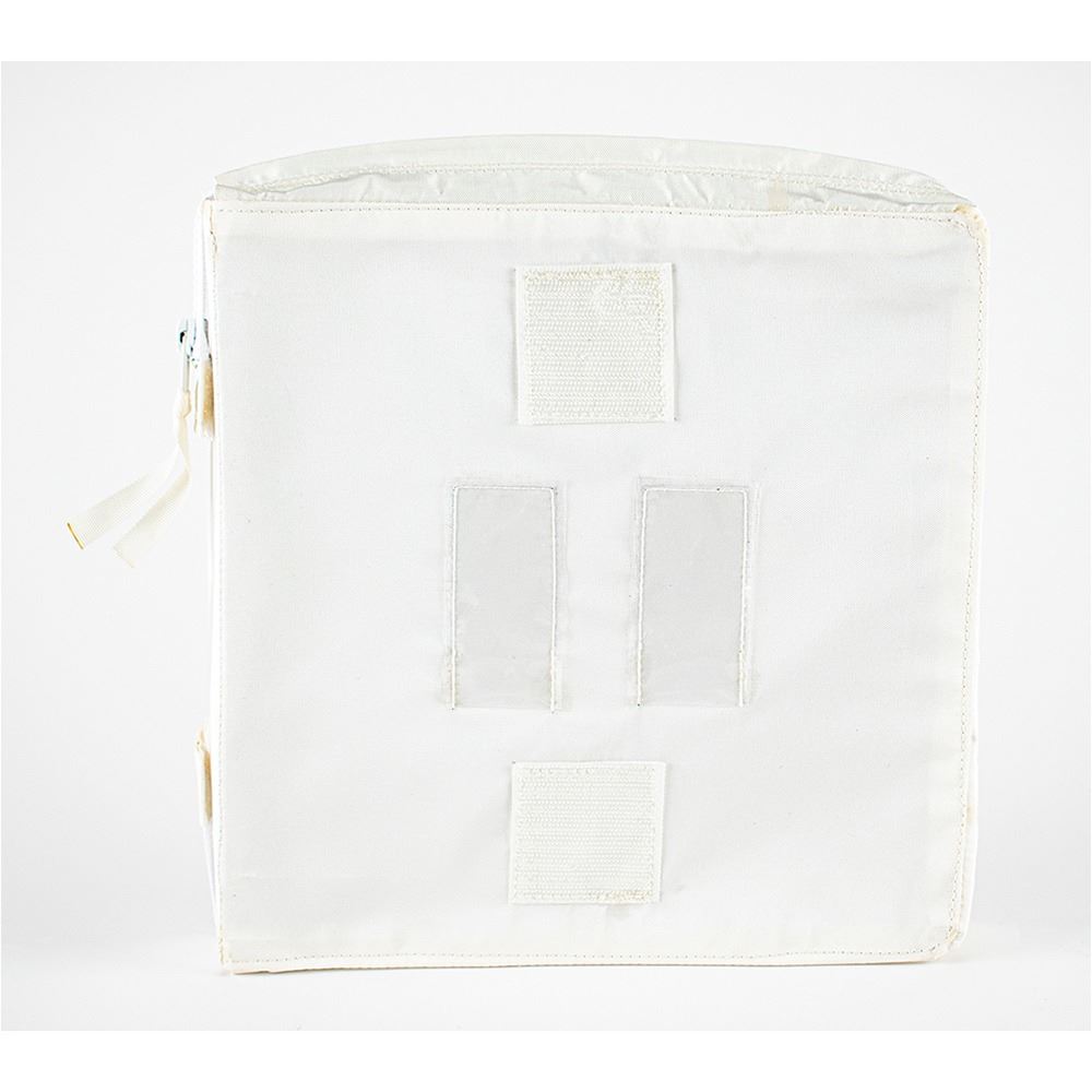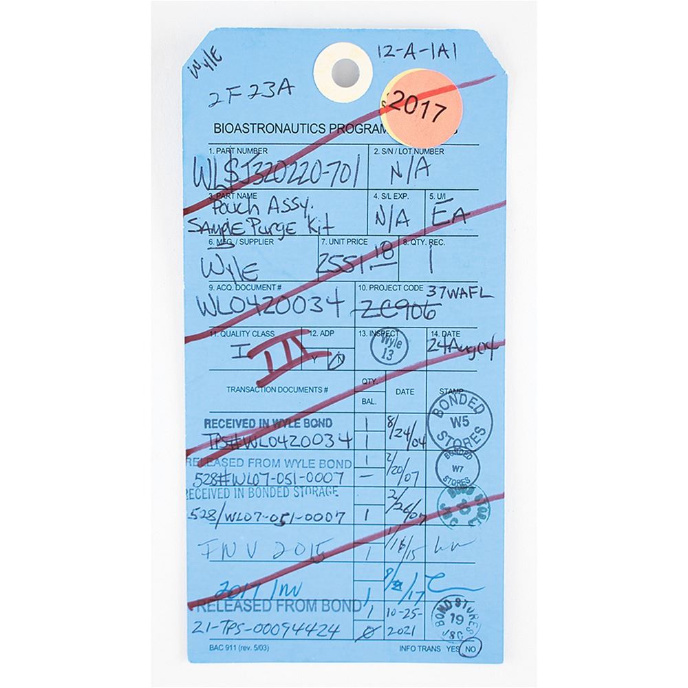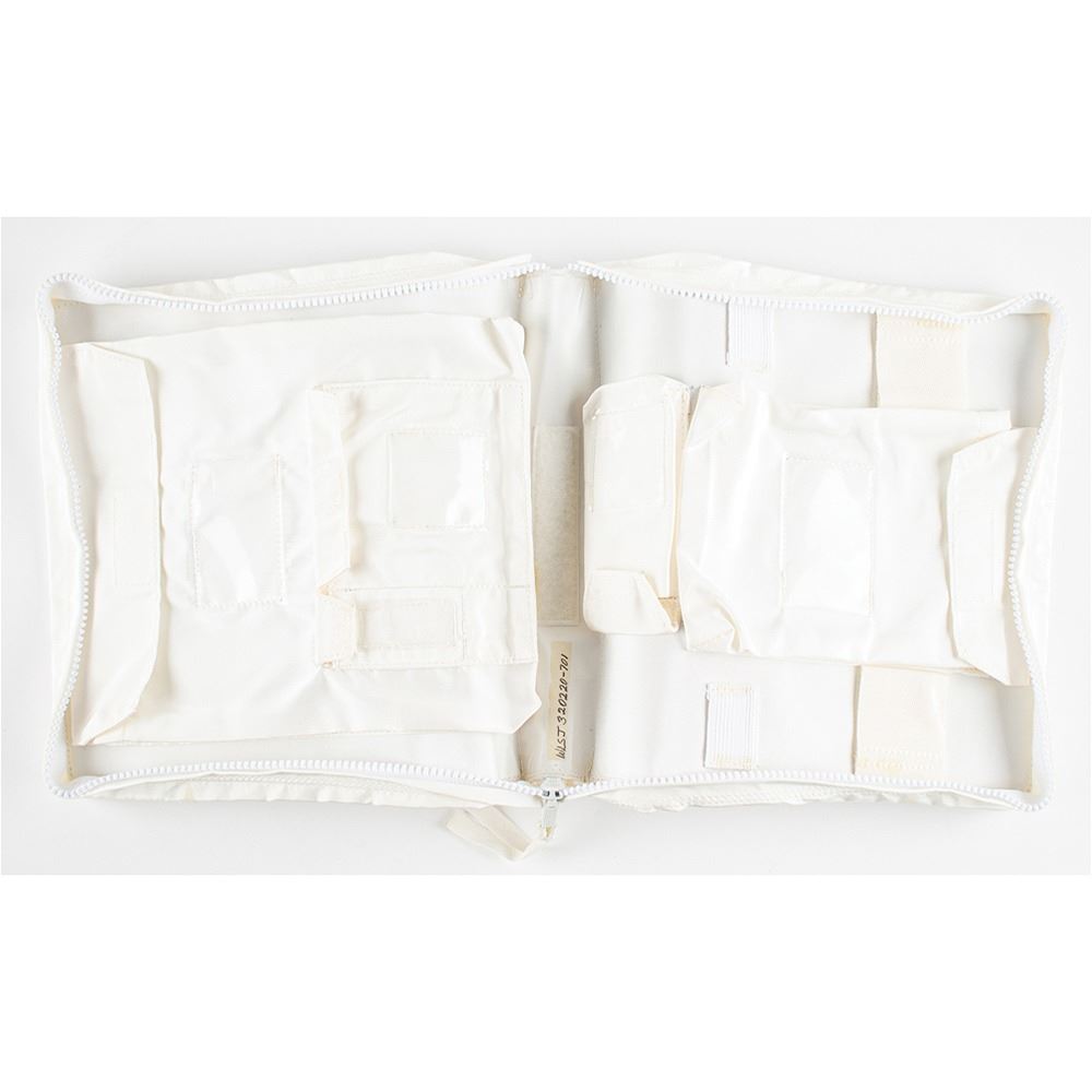 A sample Purge Kit Pouch assembly designed for Space Shuttle use, 10è x 10è x 2è, made of Beta cloth material with zipper mouth and Velcro swatch to front and back. The kit opens to reveal five storage pouches and an annotated parts number: ‰ÛÏWLSJ 320220-701.‰Û Includes a blue ‰ÛÏBioastronautics Program Parts‰Û tag struck through in red felt tip and marked as ‰ÛÏIII‰Û with an affixed ‰ÛÏ2017‰Û sticker. The tag, with matching part number, identifies the item as a ‰ÛÏPouch Assy. Sample Purge Kit,‰Û the manufacturer as ‰ÛÏWyle,‰Û and is dated August 24, 2004. In fine condition.