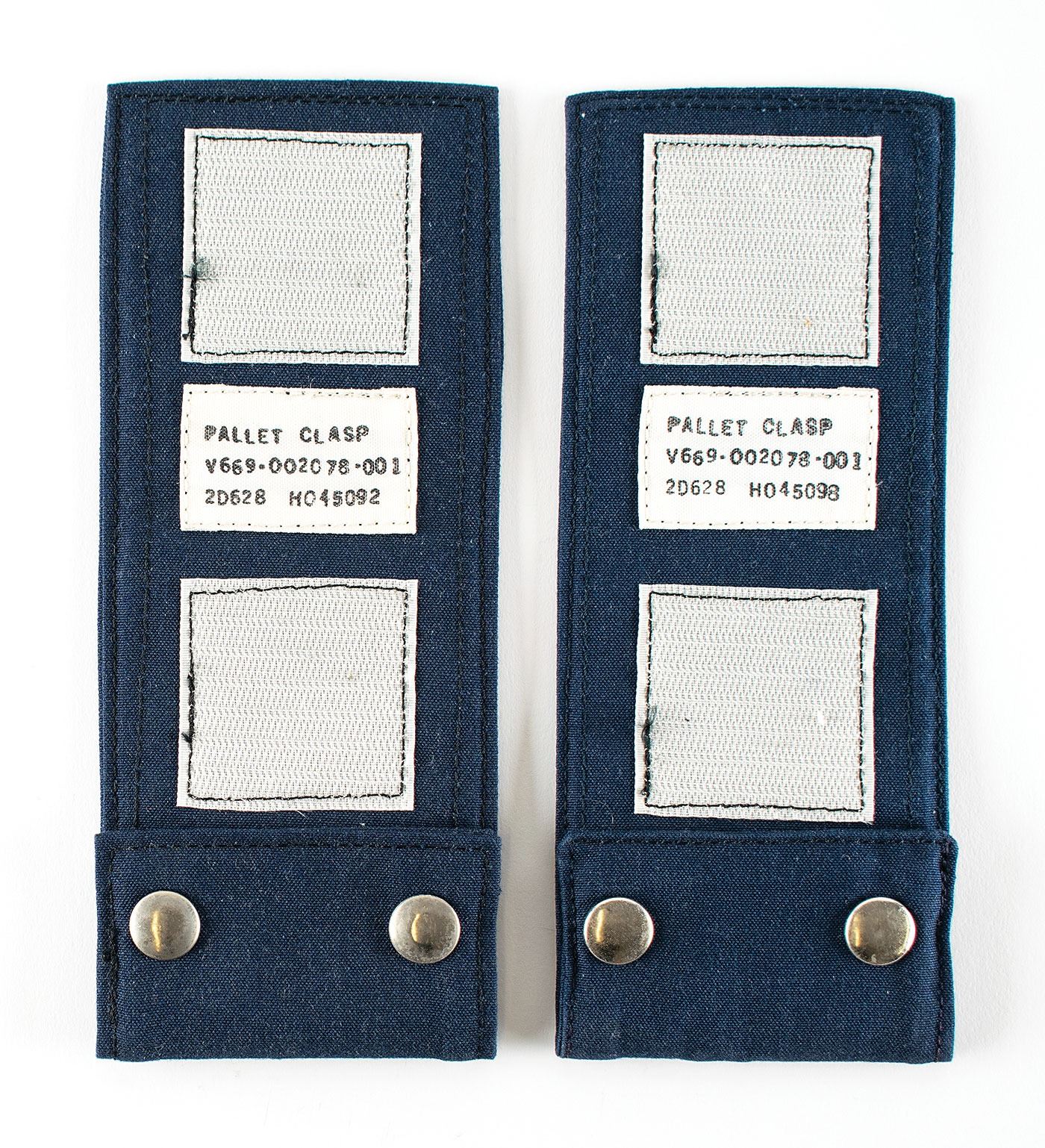 Two "Pallet Clasp" assemblies designed to secure the sleeping bag on the Space Shuttle, each measuring 3.25˝ x 8.5˝, with part number labels: "Pallet Clasp, V669-002078-001, 2D628," with different serial numbers, "H045092" and "H045098." Designated as Class I flight hardware, two or four of these were used along with another strap to secure the sleeping bag to a pallet (or other desirable area) during sleep periods. In fine condition. Consignor notes that this was purchased as NASA surplus; accompanied by a photocopy of the original parts bag.