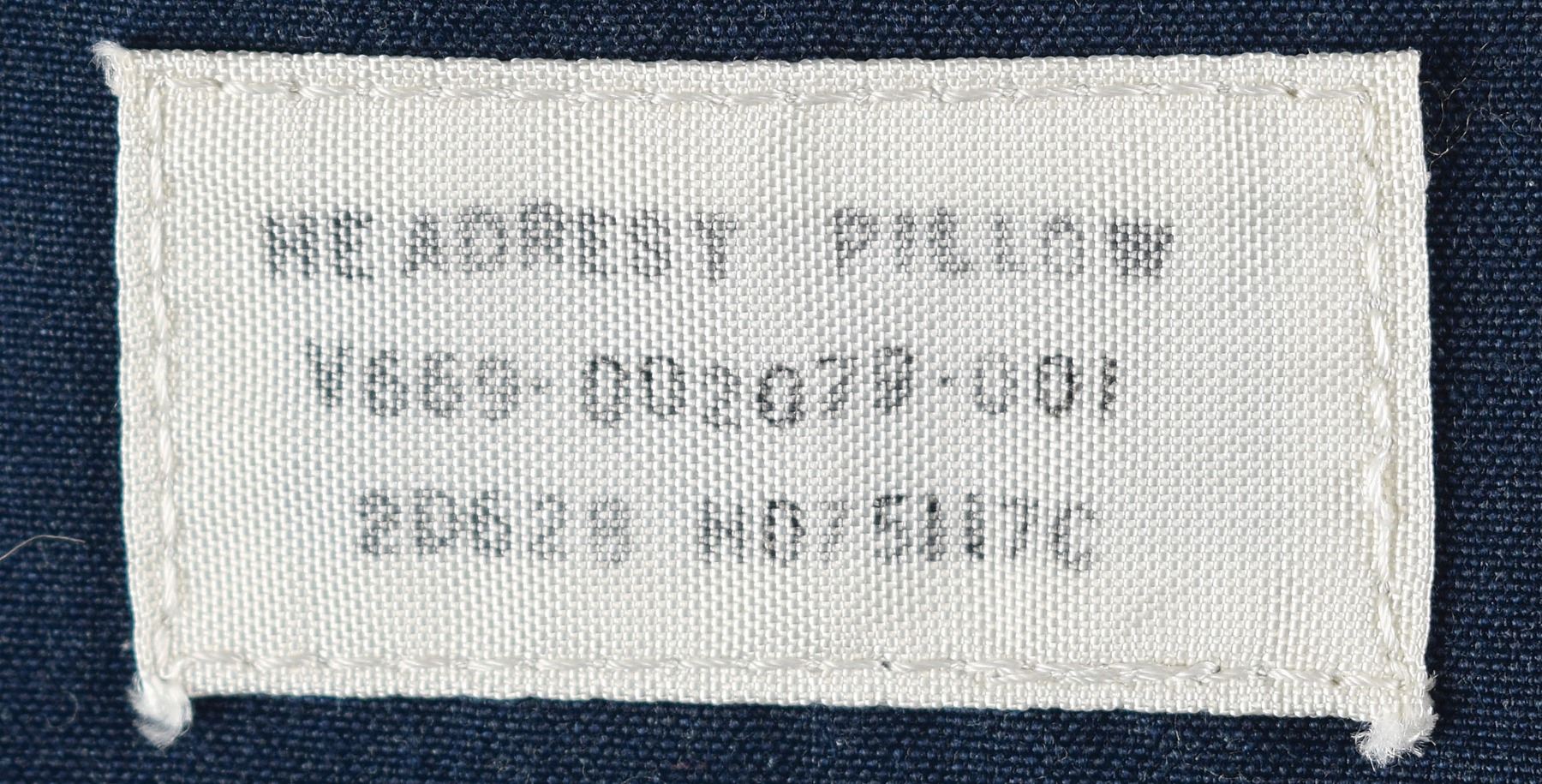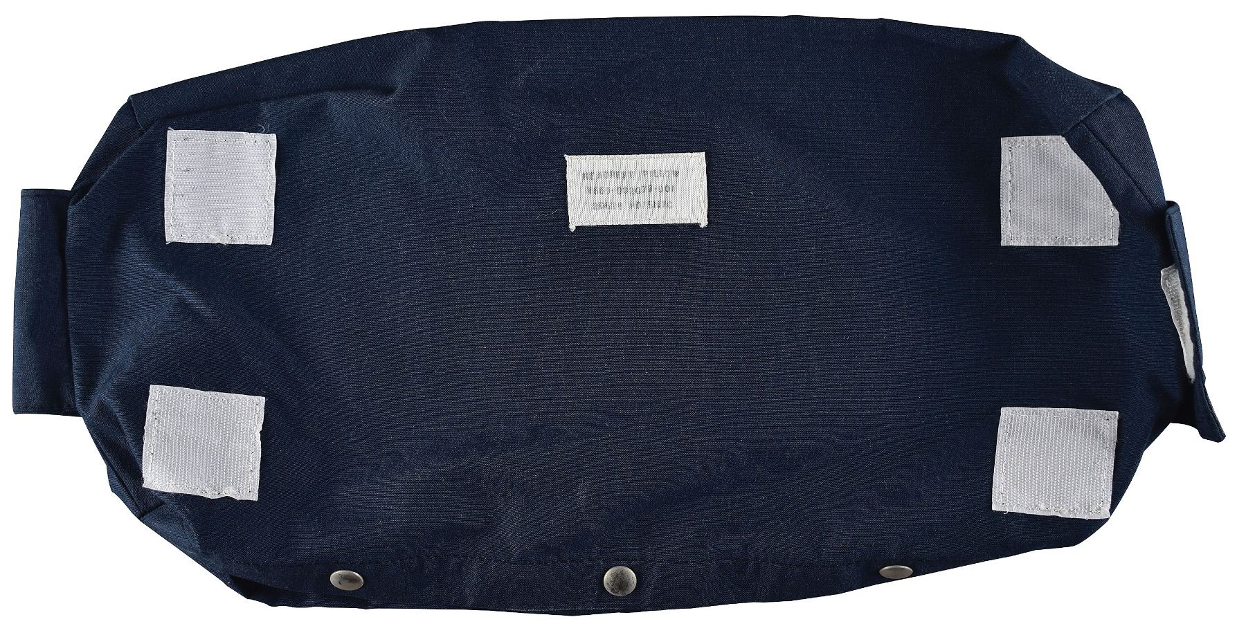 Space Shuttle astronaut headrest pillow cover, measuring approximately 21? x 11.5?, bearing a sewn-on parts label: "Headrest Pillow, V669-002079-001, 2D628 H075117C." The edge has three snaps for securing the foam pad inside (which has since been discarded by NASA), and the rear has a Velcro-tabbed strap that would allow it to be wrapped and secured in place; astronauts could also use the strap to shield the eyes from the Shuttle's cabin lighting. Astronauts could use these pillows in a sleep station, or with sleep restraints, and a sleeping bag. In fine condition. The consignor notes that this Class I flight item was purchased as NASA surplus.