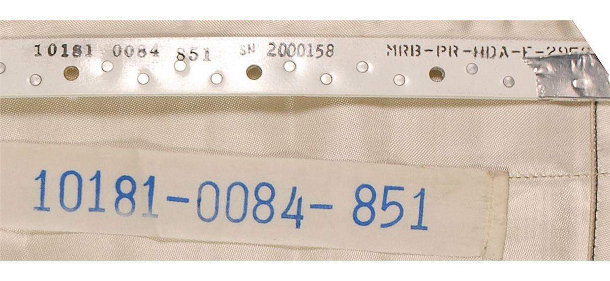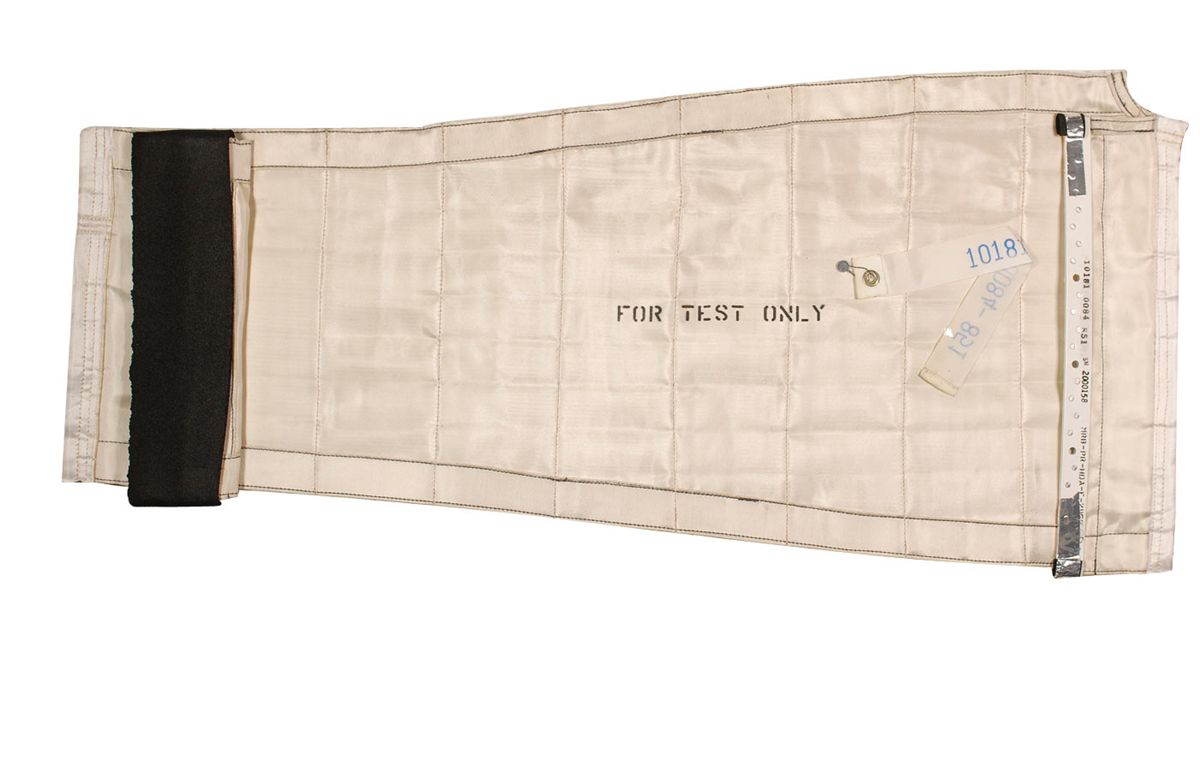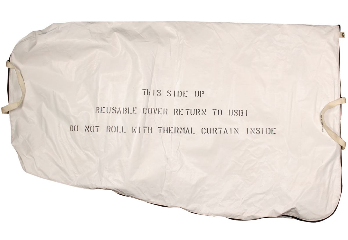 Shuttle Solid Rocket Booster Aft Thermal Skirt. Heavy duty skirt measures 62 x 29, consists of a quilt-like material, with 10 vertical pockets and eight small loops of webbing, and would be located by the nozzle. Smaller end of blanket has a 17? metal brace, and center of blanket is stenciled “For Test Only.” Blanket is housed in its original zip-up reusable cover. Skirts used during launch were destroyed during the process.