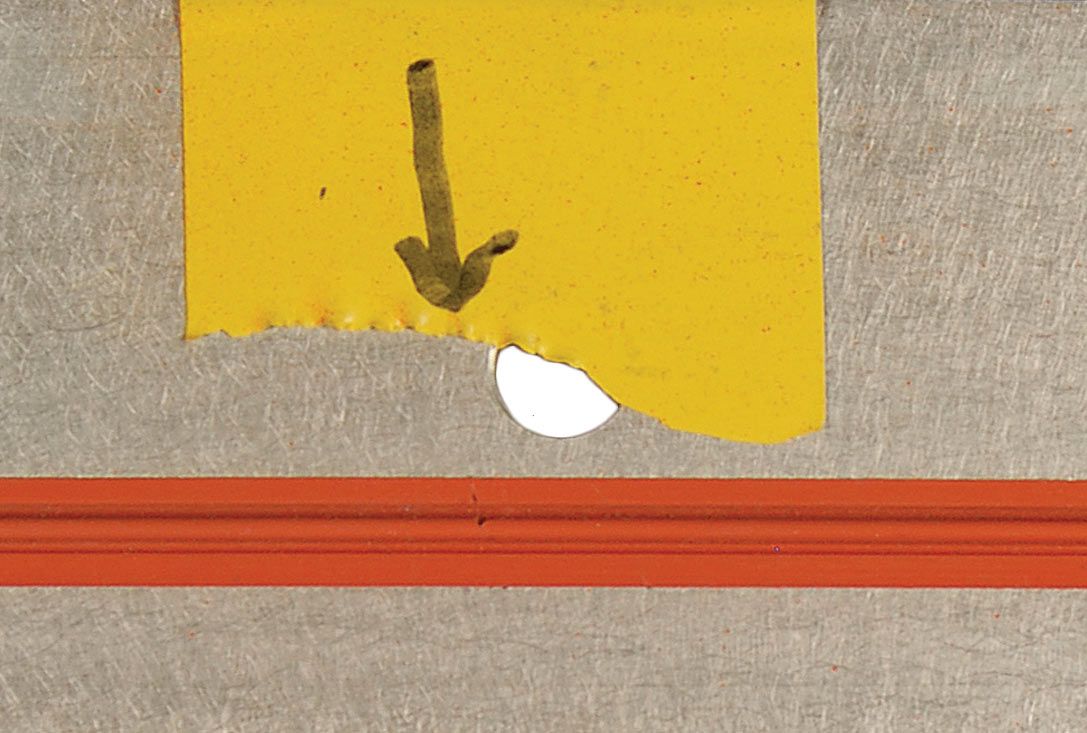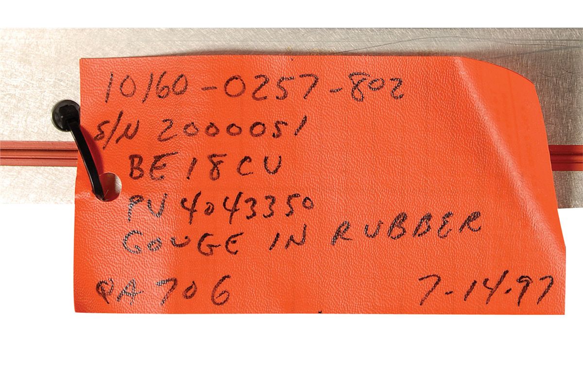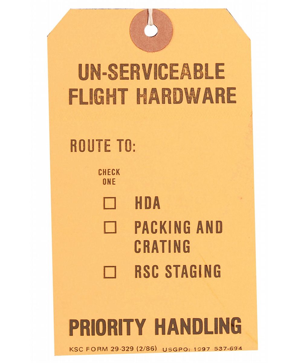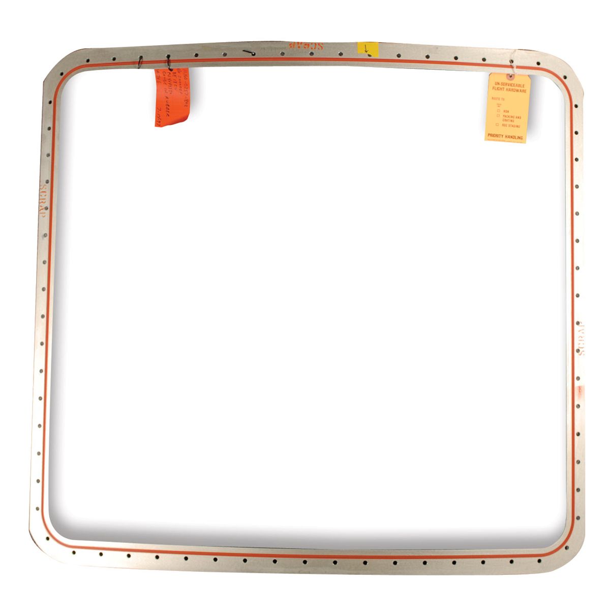 Solid Rocket Booster Forward Skirt Door Gasket. Curved metal framed forward skirt door gasket measures 36.5 x 39. Gasket has been changed out and decommissioned by NASA for having a gouge in the rubber gasket. An orange Non-Conforming Materials tag has been attached to the frame, with “Gouge in rubber,” written on the reverse in an unknown hand. A KSC Form 29-329 Un-Serviceable Flight Hardware tag has also been attached to frame, and the gouge is identified with a piece of yellow duct tape with an arrow pointing to the imperfection. In fine condition. Accompanied by two photos of a gasket in place on the SRB, and a photocopy of the Kennedy Space Center problem report, dated June 24, 1997, identifying the gouge and the actions taken.