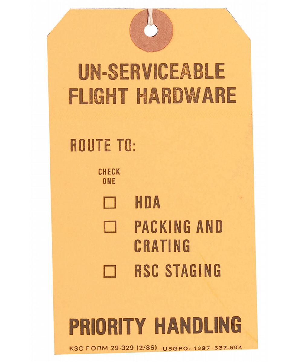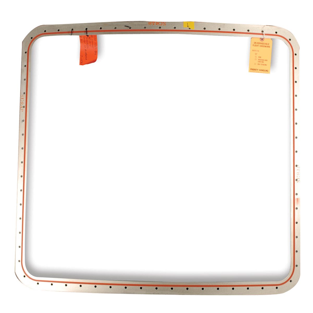 Solid Rocket Booster Forward Skirt Door Gasket. Curved metal framed forward skirt door gasket measures 36.5 x 39. Gasket has been changed out and decommissioned by NASA for having a gouge in the rubber gasket. An orange Non-Conforming Materials tag has been attached to the frame, with “Gouge in rubber,” written on the reverse in an unknown hand. A KSC Form 29-329 Un-Serviceable Flight Hardware tag has also been attached to frame, and the gouge is identified with a piece of yellow duct tape with an arrow pointing to the imperfection. In fine condition. Accompanied by two photos of a gasket in place on the SRB, and a photocopy of the Kennedy Space Center problem report, dated June 24, 1997, identifying the gouge and the actions taken.