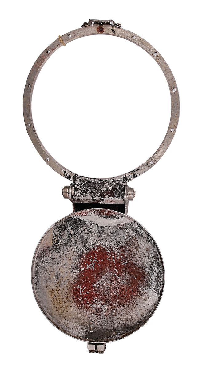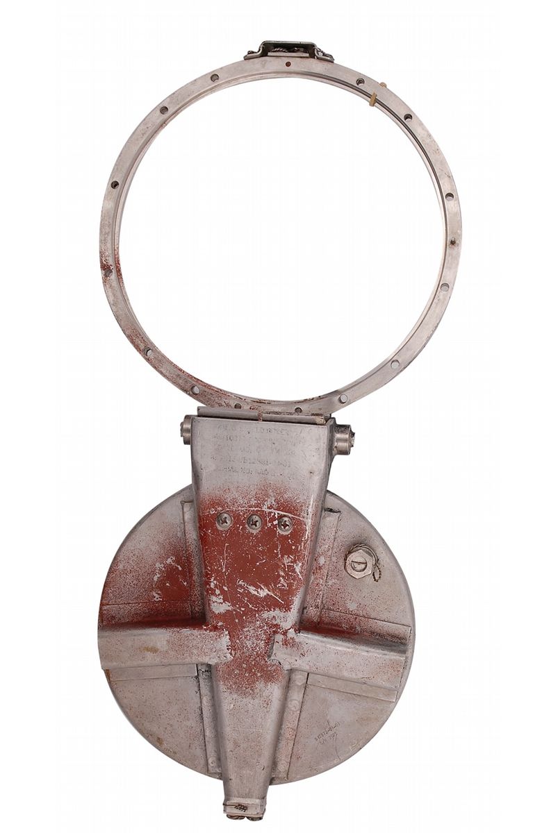 Flown SRB Heat Shield Cover. This ‘toilet seat cover’ heat shield measures approximately 20? long when opened, with cover having a diameter of 7.5 inches. This cover was one of four installed and flown on one of the shuttle missions. In fine condition, with expected wear, red paint remnants and only partially legible numbering. Accompanied by two NASA photos of the shield on one of the boosters.