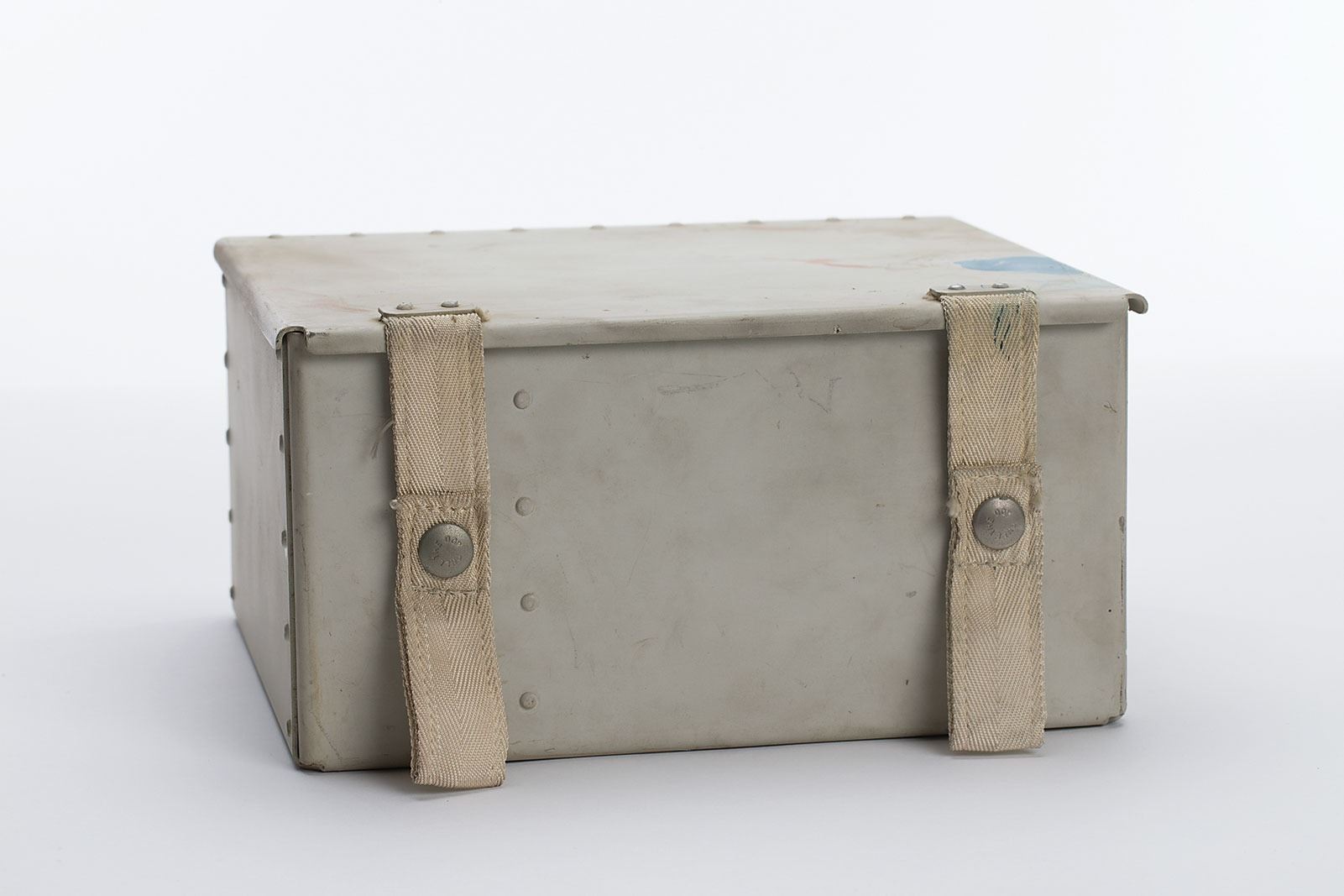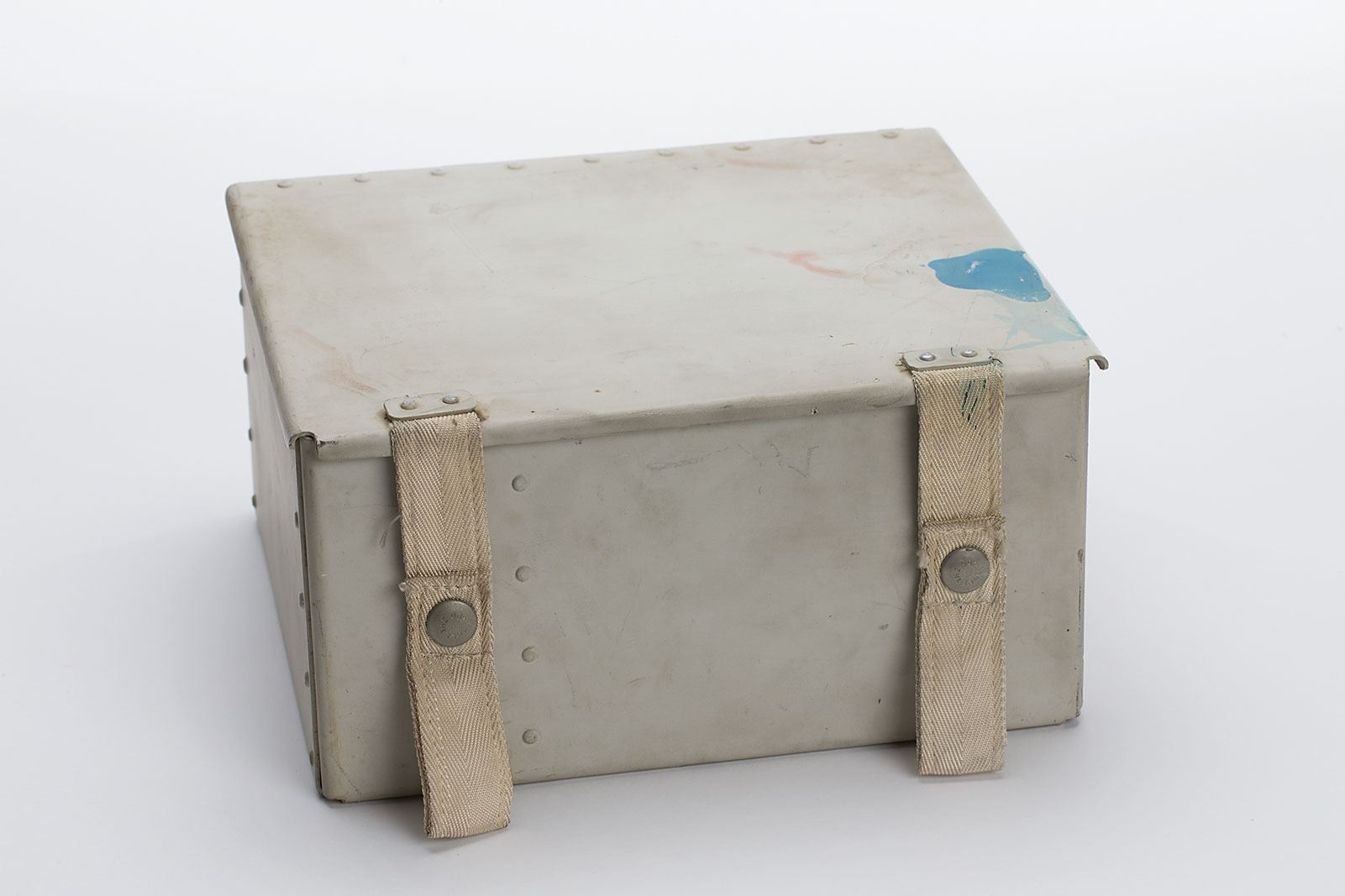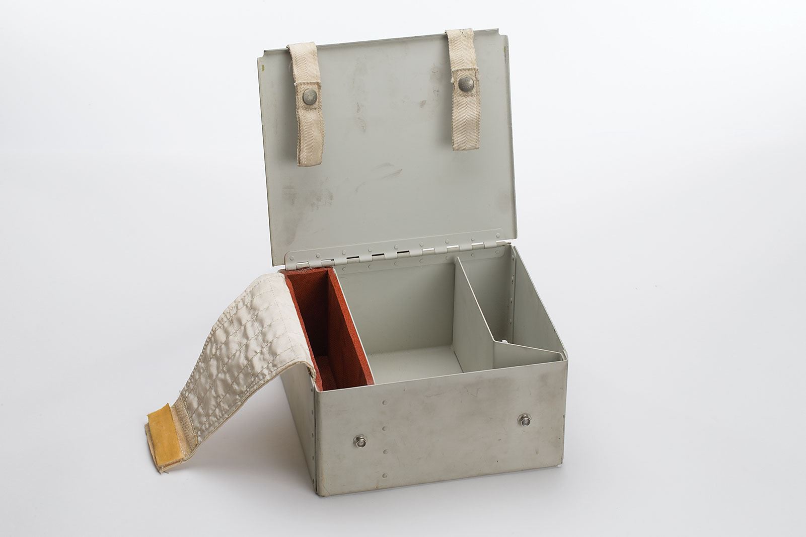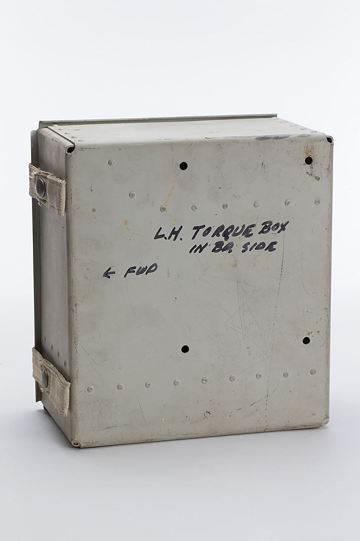 Space Shuttle Storage Locker Prototype, measuring 9.75? x 8.75? x 5?, marked inside with part numbers: "R070-660391-001, 3 03953-B28617." The interior is divided into three compartments (one padded with red foam), with a Beta cloth closure panel secured by Velcro. The hinged lid is secured by two nylon straps with snap fasteners. The bottom is annotated in felt tip, "L.H. Torque Box in BD. Side," with the forward orientation indicated. In overall fine condition, with marks and wear to the exterior, and the interior Velcro's adhesive dried and detached.
