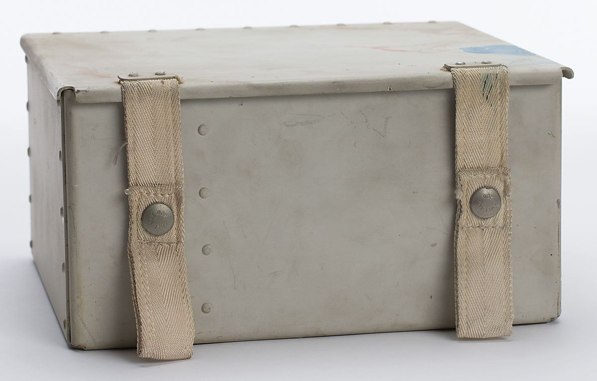 Space Shuttle Storage Locker Prototype, measuring 9.75˝ x 8.75˝ x 5˝, marked inside with part numbers: "R070-660391-001, 3 03953-B28617." The interior is divided into three compartments (one padded with red foam), with a Beta cloth closure panel secured by Velcro. The hinged lid is secured by two nylon straps with snap fasteners. The bottom is annotated in felt tip, "L.H. Torque Box in BD. Side," with the forward orientation indicated. In overall fine condition, with marks and wear to the exterior, and the interior Velcro's adhesive dried and detached.