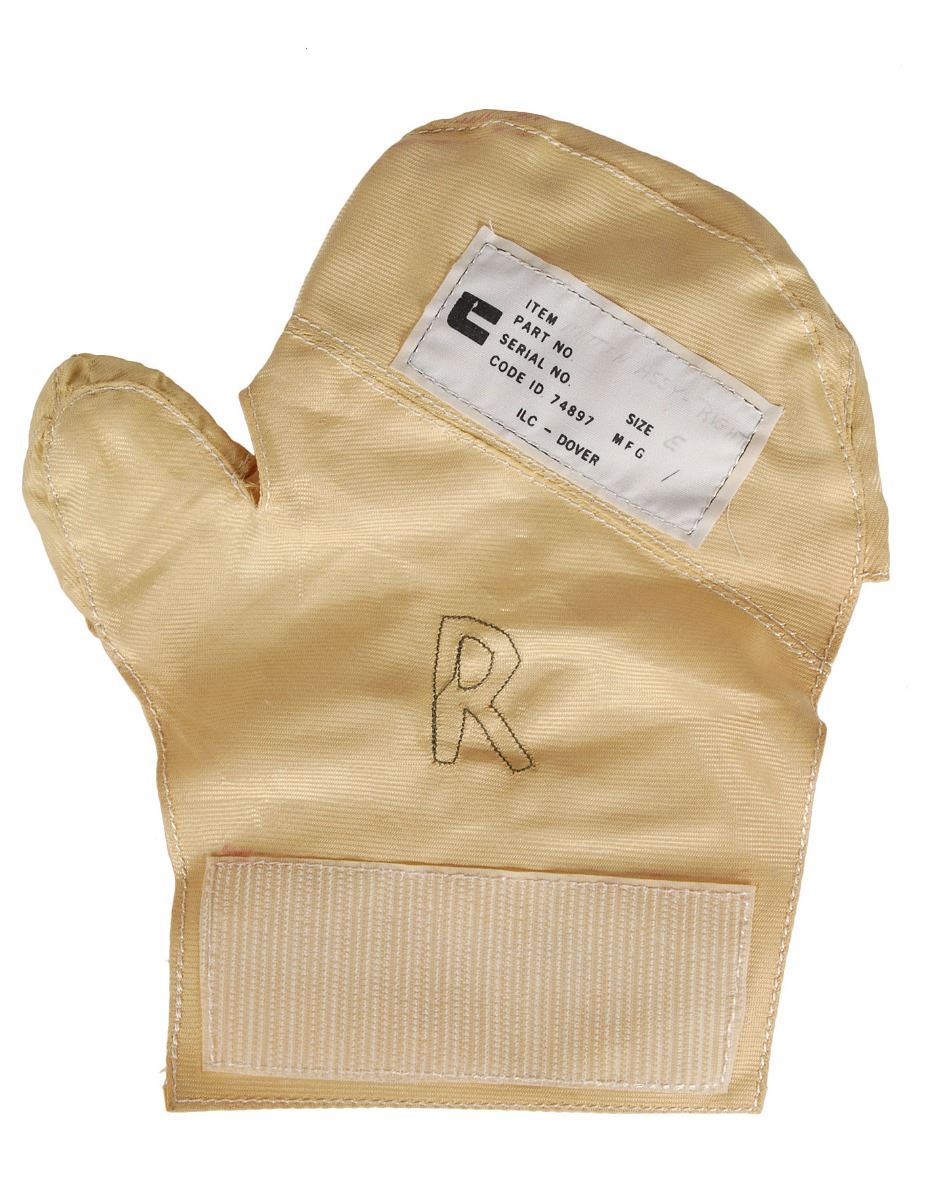 Circa early 1980s Space Shuttle suit right-hand glove mitten constructed of Kevlar, embroidered with the letter "R" and bearing an ILC tag on the finger area. The mitten was developed to help astronauts who had to grip very hot or cold objects when performing their space-walks and also provided a cut-resistant barrier since it was made of Kevlar. In fine condition. This mitten has been authenticated by Bill Ayrey, company historian at ILC Dover, the manufacturer of the Apollo, Shuttle, and Space Station suits.